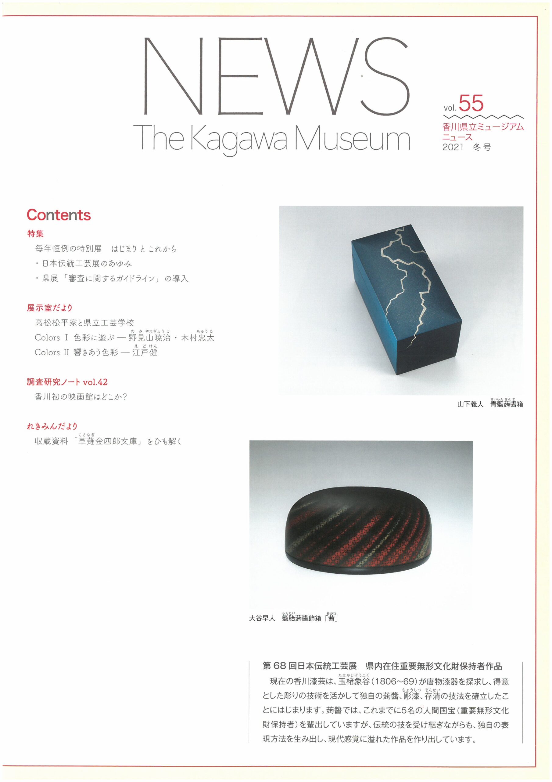 - 展示室だより:特別展「第72回日本伝統工芸展」、常設展「芝居がスキ!」、常設展「カラフル」、常設展「日本伝統工芸展連携企画冷静と情熱の工芸」、常設展「書の世界宸翰(しんかん)を中心に」ほか