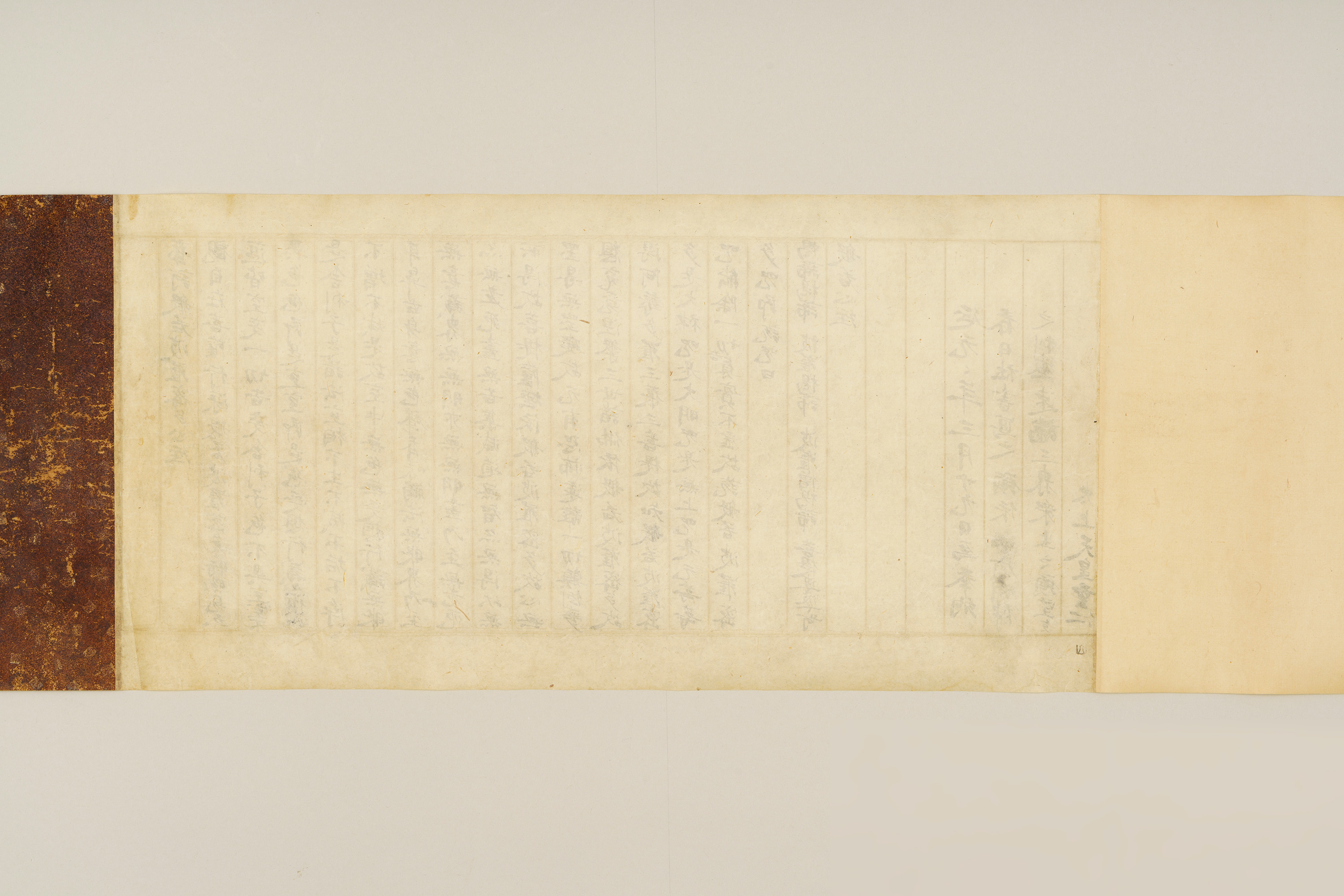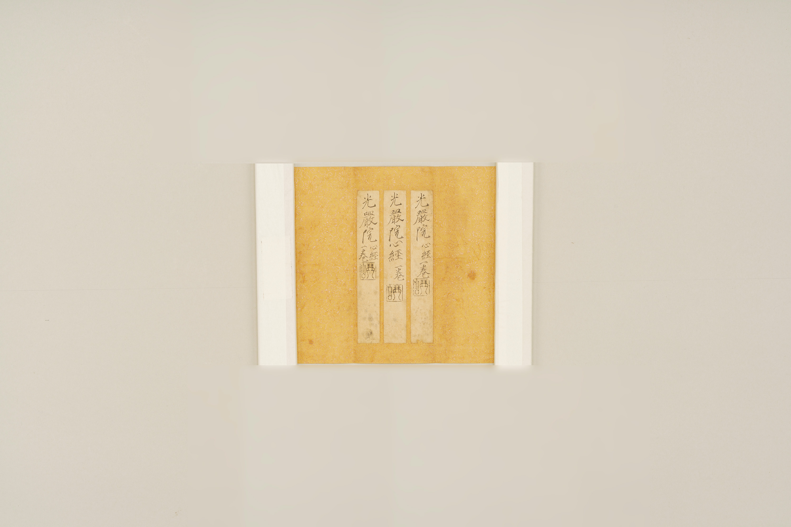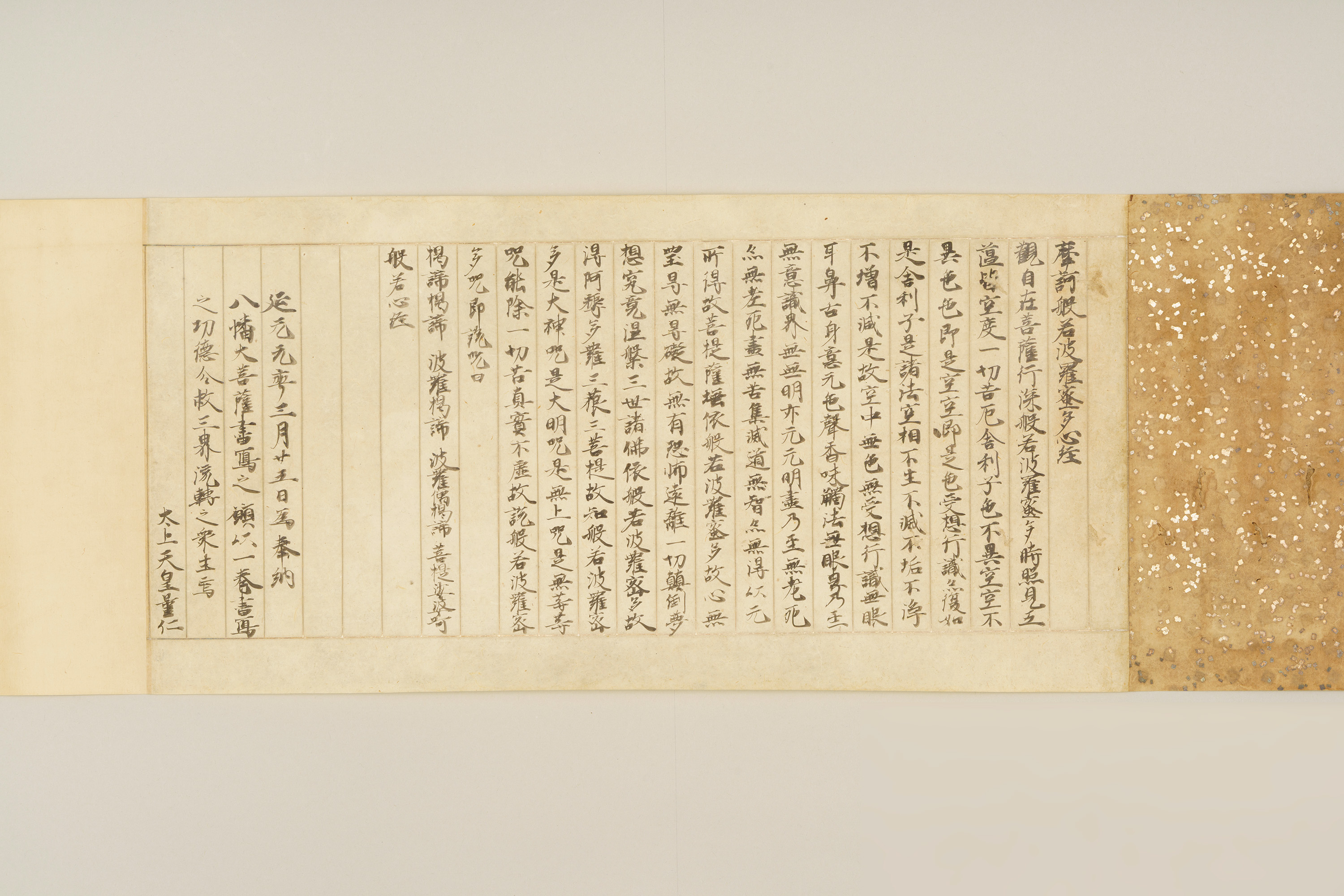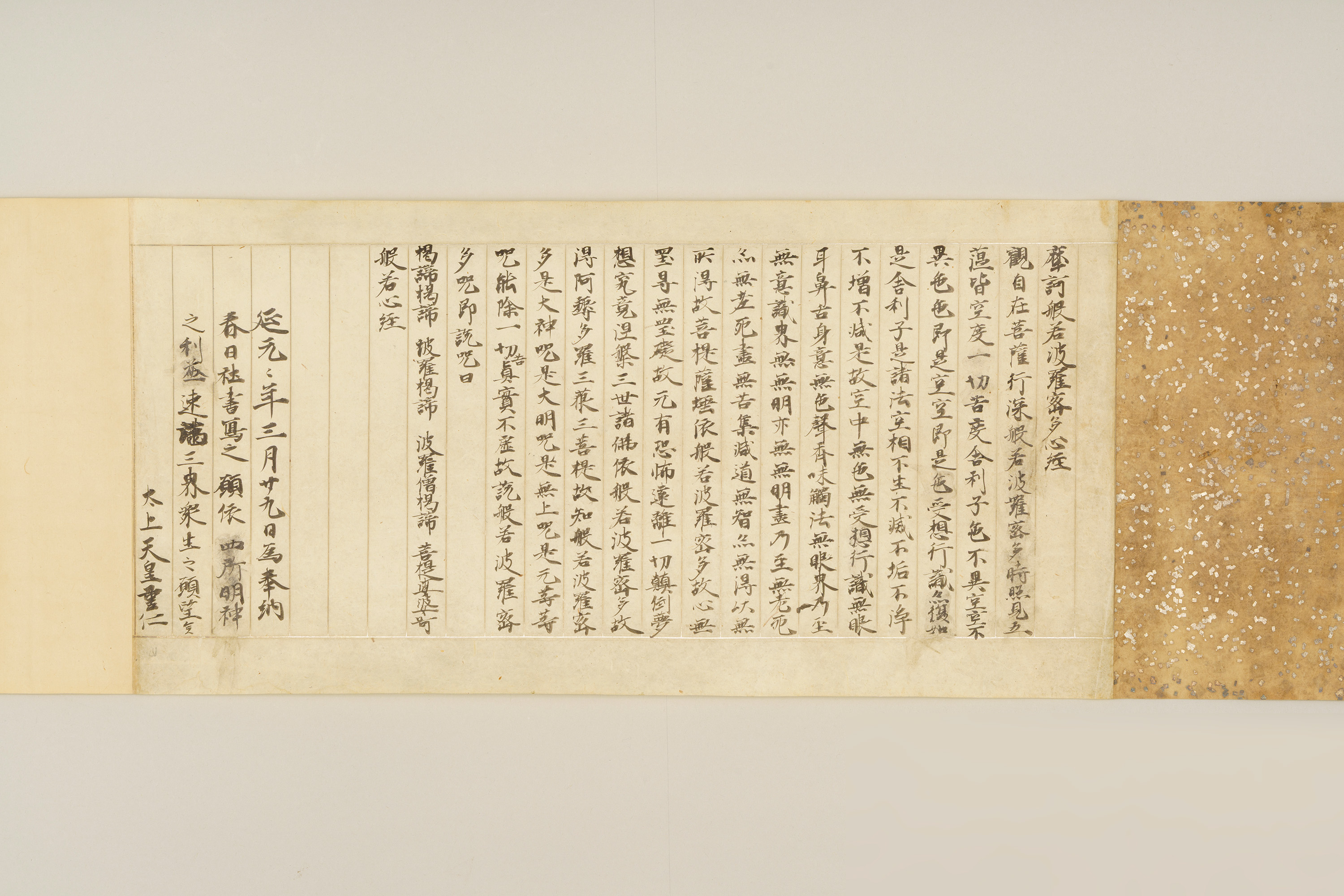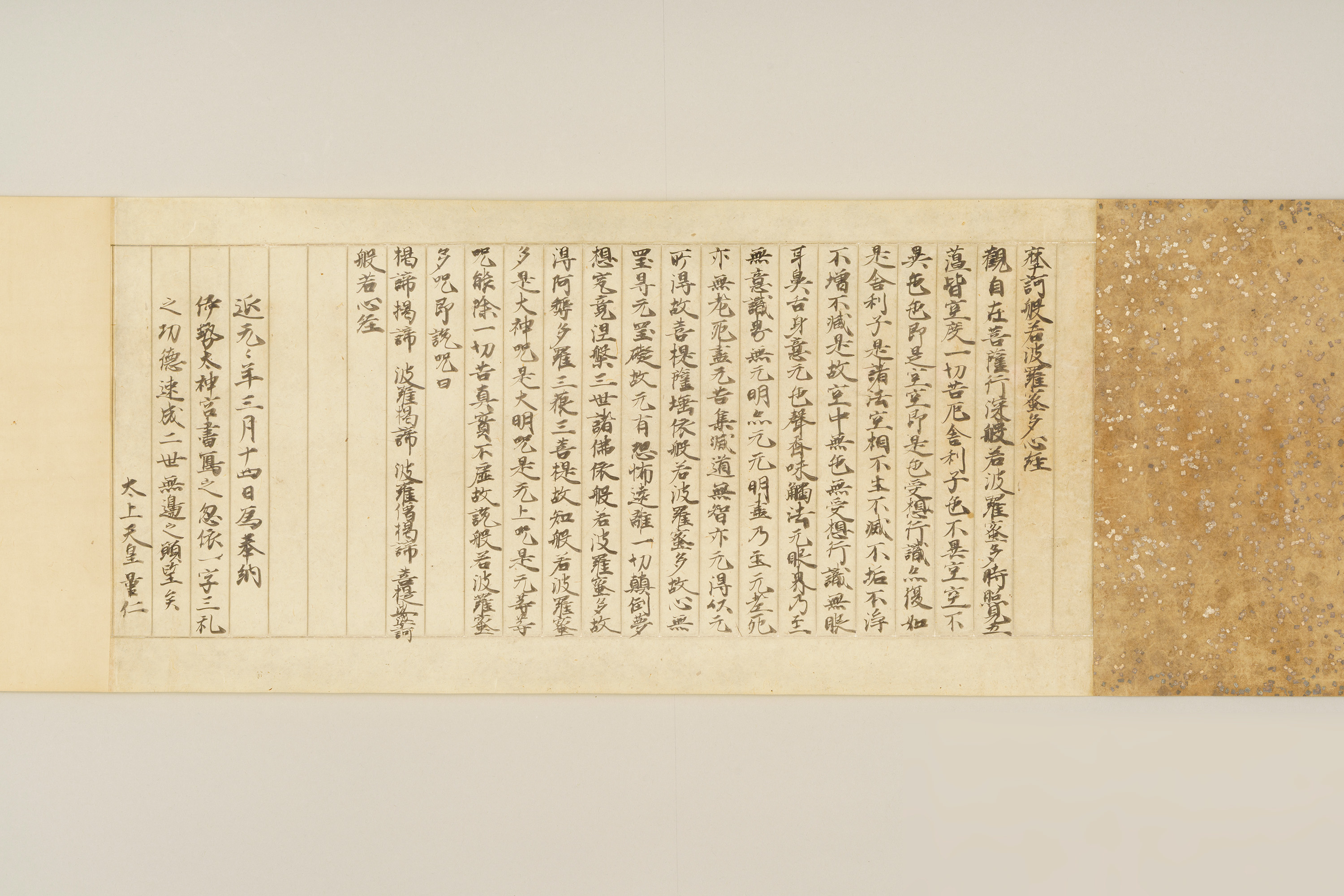 本資料は伊勢神宮、石清水(いわしみず)八幡宮、春日大社の3社に奉納するために光厳院が書き写した『般若心経(はんにゃしんぎょう)』で、奥書には1文字書くごとに3回礼拝する一字三礼の作法で写経されたことや、それぞれの神に対して民衆の救済を願うという奉納の理由が書かれている。