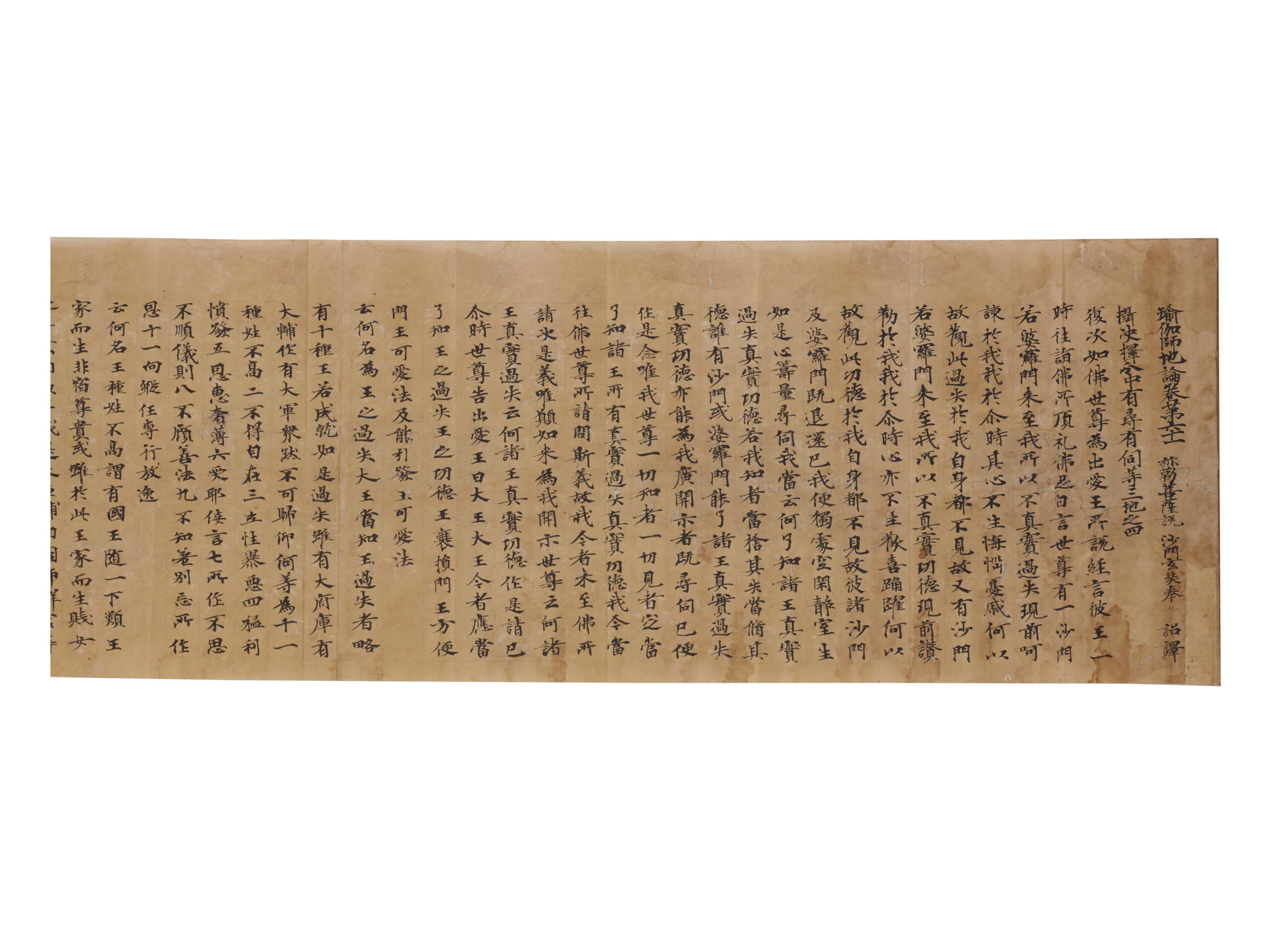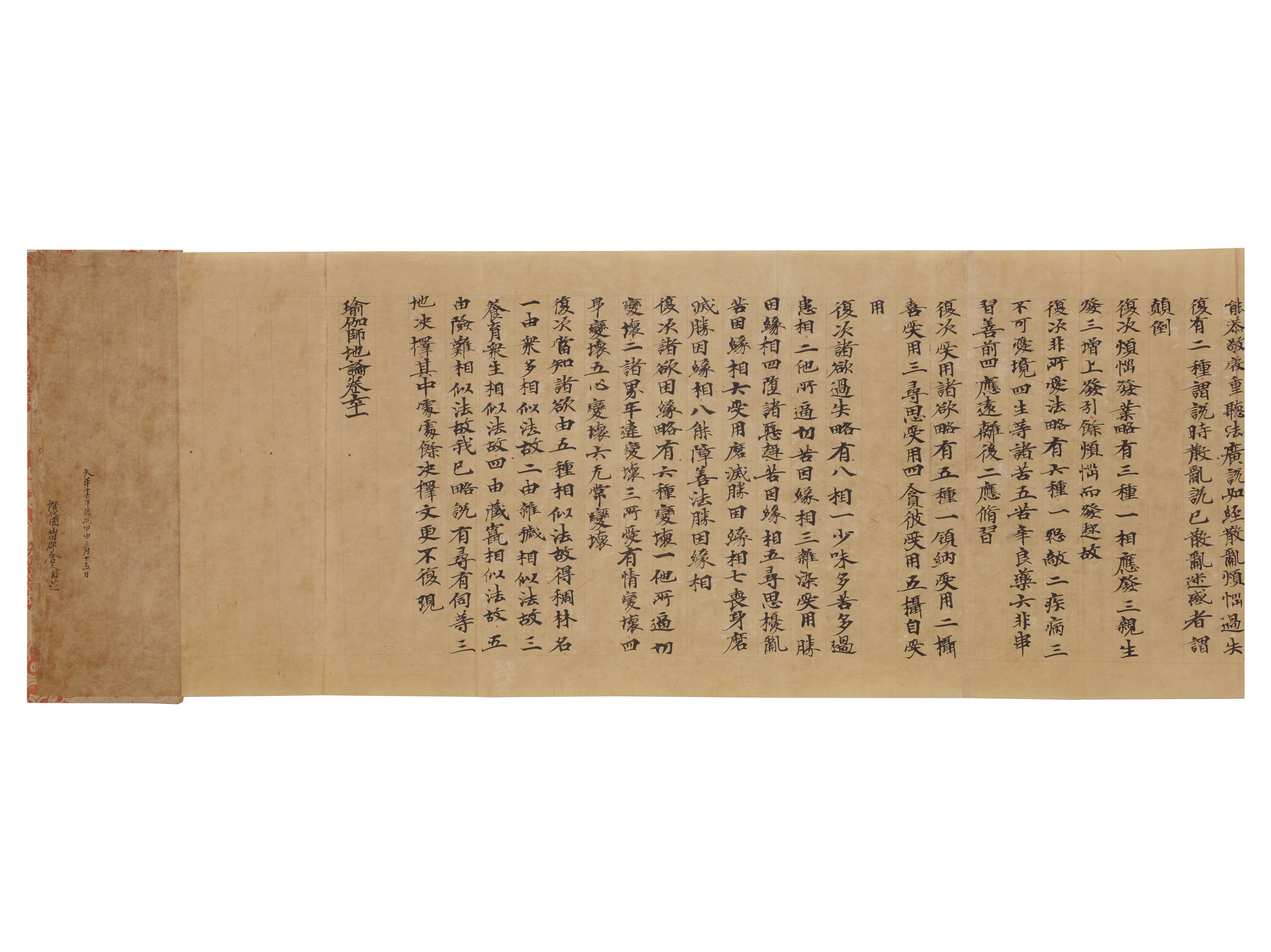 『瑜伽師地論』は全100巻からなり、仏道修行の方法や心得などについて解説する、法相宗(ほっそうしゅう)の重要な経典である。奥書の記述から、讃岐国山田郡の豪族とみられる舎人国足の願いにより多くの人によって写された経典として知られている。当時の写経は、書写・校正、装丁にたずさわる人員のほか、元のテキストである「本経」や、大量の紙を必要とするなど大規模な事業であった。