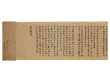 瑜伽師地論 巻第六十一 ゆがしじろん まきのだいろくじゅういち 作者 舎人国足(とねりのくにたり) 発願 時代 奈良時代 天平16年(744) 品質・員数 紙本墨書 1帖 法量(cm) 縦23.6 長1003.3 分類 書 指定区分 重要美術品 収蔵番号 B98000001 解説 『瑜伽師地論』は全100巻からなり、仏道修行の方法や心得などについて解説する、法相宗(ほっそうしゅう)の重要な経典である。奥書の記述から、讃岐国山田郡の豪族とみられる舎人国足の願いにより多くの人によって写された経典として知られている。当時の写経は、書写・校正、装丁にたずさわる人員のほか、元のテキストである「本経」や、大量の紙を必要とするなど大規模な事業であった。誤字の訂正方法の違いなどから、平城京の写経所ではなく讃岐で書写されたと想定されているが、漢文を読むために書き加えられた訓点(くんてん)の形式から平安時代前期には東大寺周辺の寺に納められていたとみられ、後に僧の念西(ねんせい)によって石山寺一切経(いしやまでらいっさいきょう)に納められた。現在、舎人国足の名が記された『瑜伽師地論』が石山寺や京都国立博物館、九州国立博物館など各所に所蔵されている。 関連作品 領知宛行状案 後陽成天皇宸翰御消息 後西天皇宸翰御懐紙(詠春動物和歌) 光厳院宸翰御奉納心経 作品をさがす リセット キーワード検索 分類 すべて 絵画(国内) 絵画(国外) 彫刻 工芸 書 デザイン 民俗資料 その他 指定区分 すべて 国宝 重要文化財 重要美術品 県指定 市町指定 検索