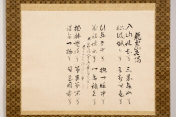 後水尾天皇宸翰御加筆 ごみずのおてんのう しんかん おんかひつ 作者 後水尾天皇(ごみずのおてんのう、1596-1680) 時代 江戸時代 延宝3年(1675) 品質・員数 紙本墨書 1幅 法量(cm) 縦50.2 横66.0 分類 書 指定区分 重要美術品 収蔵番号 MY0#00009 解説 隠居して龍雲軒源英(りゅううんけんげんえい)と号した高松藩主松平家初代頼重(よりしげ)が、隠居の際の思いを漢詩に詠んで後水尾天皇(当時は退位して上皇)に書き送ったところ、年長の天皇が自身の心境を詠んだ和歌を行間に書き加えて答えたもの。頼重54歳、後水尾天皇80歳のそれぞれの胸中を伝える。後水尾天皇は和歌をはじめとする学問にすぐれ、頼重は天皇からたびたび和歌の添削を受けるなど交流が深かった。本作品が頼重のもとに返された際に添えられた「後水尾天皇宸翰女房奉書」(にょうぼうほうしょ)とあわせて高松藩主松平家に伝わった。 関連作品 藤原佐理筆詩懐紙 後西天皇宸翰御懐紙(詠春動物和歌) 後水尾天皇宸翰古歌御色紙 後陽成天皇宸翰御消息 作品をさがす リセット キーワード検索 分類 すべて 絵画(国内) 絵画(国外) 彫刻 工芸 書 デザイン 民俗資料 その他 指定区分 すべて 国宝 重要文化財 重要美術品 県指定 市町指定 検索
