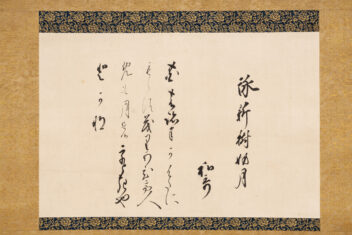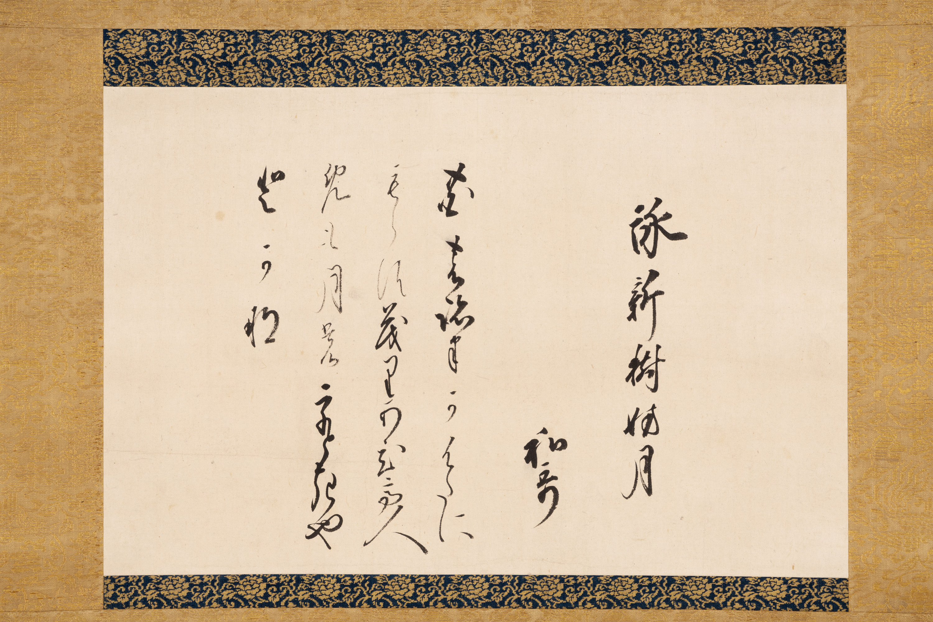 宸翰とは天皇が自ら記した書のこと。「新樹妨月(新樹、月を妨げる:若い枝が月をかくすこと)」の題で後西天皇が寛文8年(1668)9月4日に詠んだ和歌を懐紙(かいし・ふところに入れる紙)に記したもの。