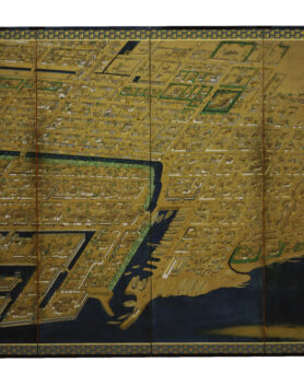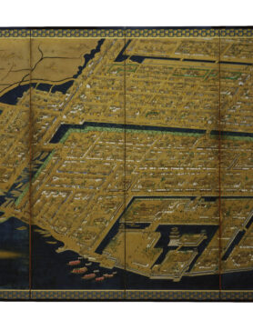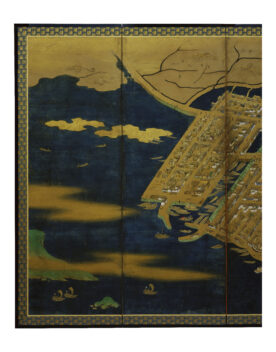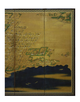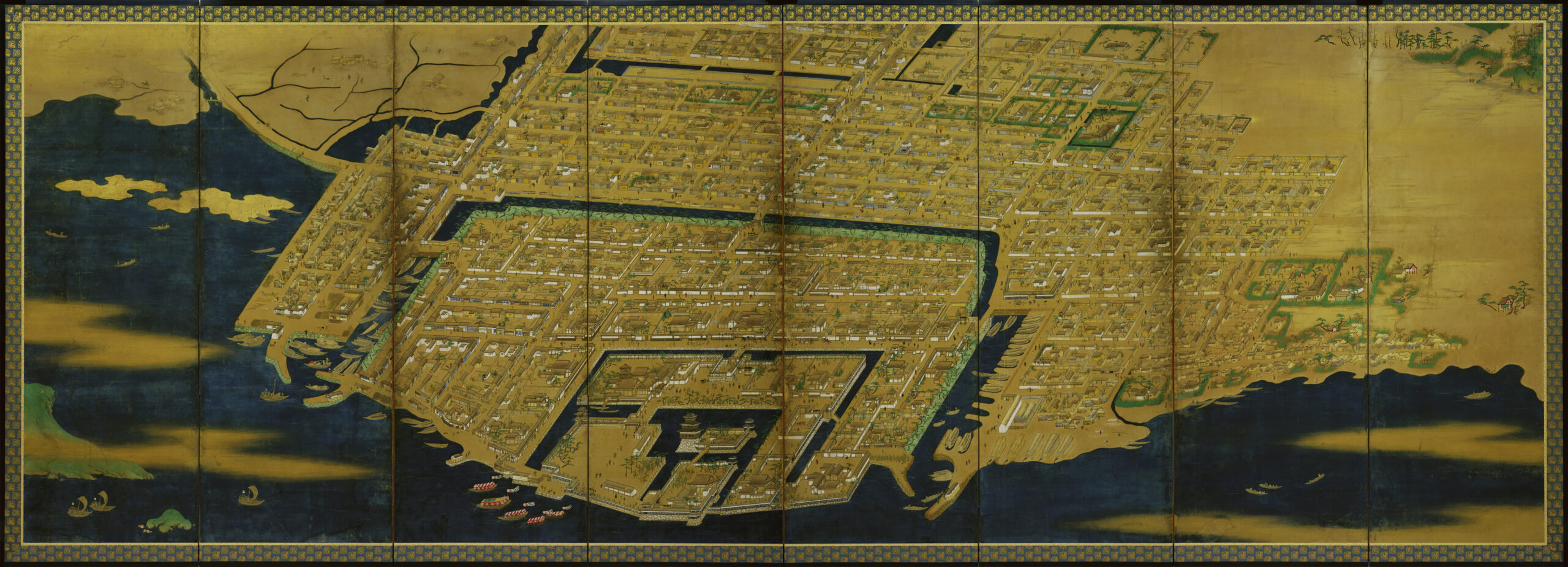 高松城下図屏風 たかまつじょうかず びょうぶ 作者 - 時代 江戸時代 17世紀 品質・員数 紙本着色 8曲1隻 法量(cm) 縦167.0 横489.0 分類 絵画(国内) 指定区分 県指定 収蔵番号 MY0#00016 解説 高松城と城下町を高いところから見下ろすように描いた屏風絵。画面の下が北で、城下町全体と東西の周辺部を範囲としているが、その範囲から外れる屋島(左下)、高松の氏神社である石清尾(いわせお)八幡宮(右上)も画面に含まれる。 海に面して築城された高松城内の中央には、三重四階の天守と二の丸、中堀の内には三の丸、桜馬場(さくらのばば)、西の丸が配され、外堀の内には上級の武家屋敷が描かれている。外堀には大小の舟が停泊し、三の丸の沖には藩主専用の御座船(ござぶね)も見える。外堀の外には、中下級の武家屋敷、さらには商人街や職人街、生け垣に囲まれた寺院等が確認できる。 屏風には落款や印章がなく、作風からも筆者の特定は難しいが、高松城や城下町を知るための豊富な情報を提供する貴重な資料である。 関連作品 弘法大師像(善通寺御影) 梅樹 渡舟 高松松平家博物図譜のうち衆芳画譜 作品をさがす リセット キーワード検索 分類 すべて 絵画(国内) 絵画(国外) 彫刻 工芸 書 デザイン 民俗資料 その他 指定区分 すべて 国宝 重要文化財 重要美術品 県指定 市町指定 検索