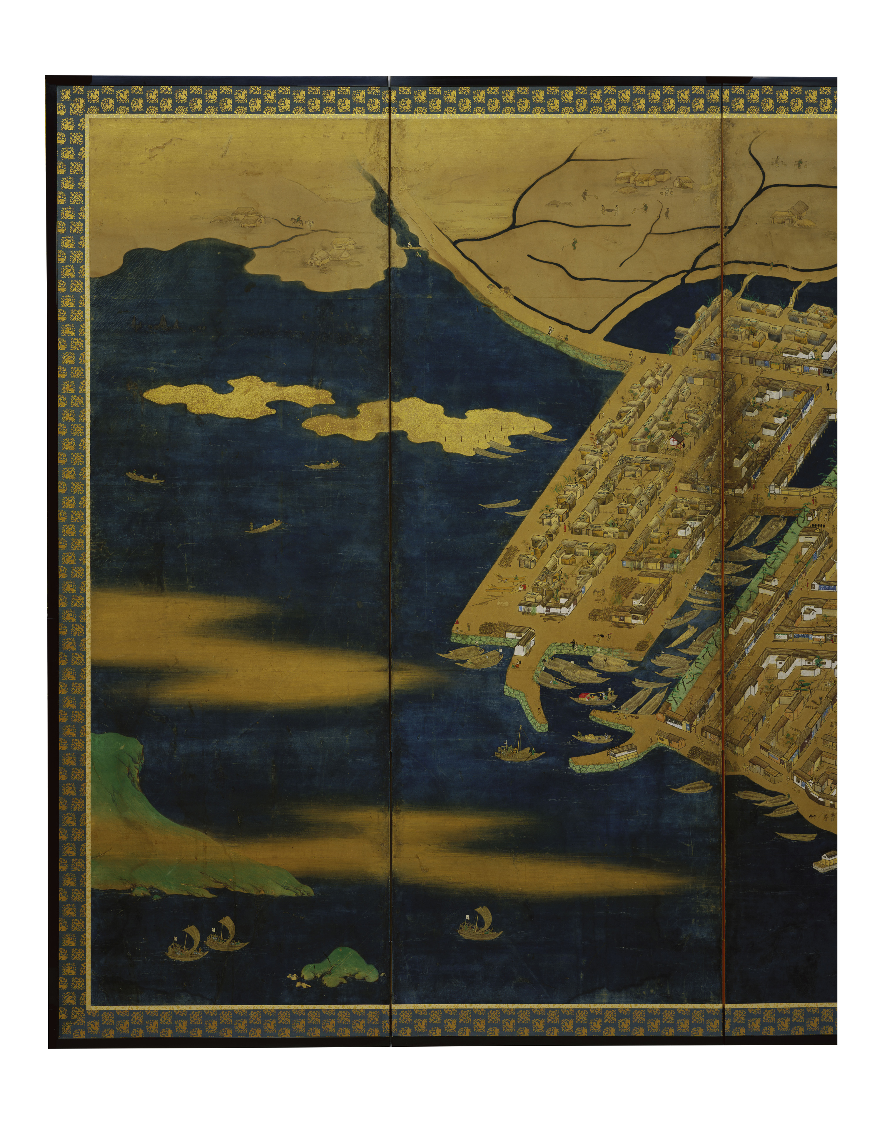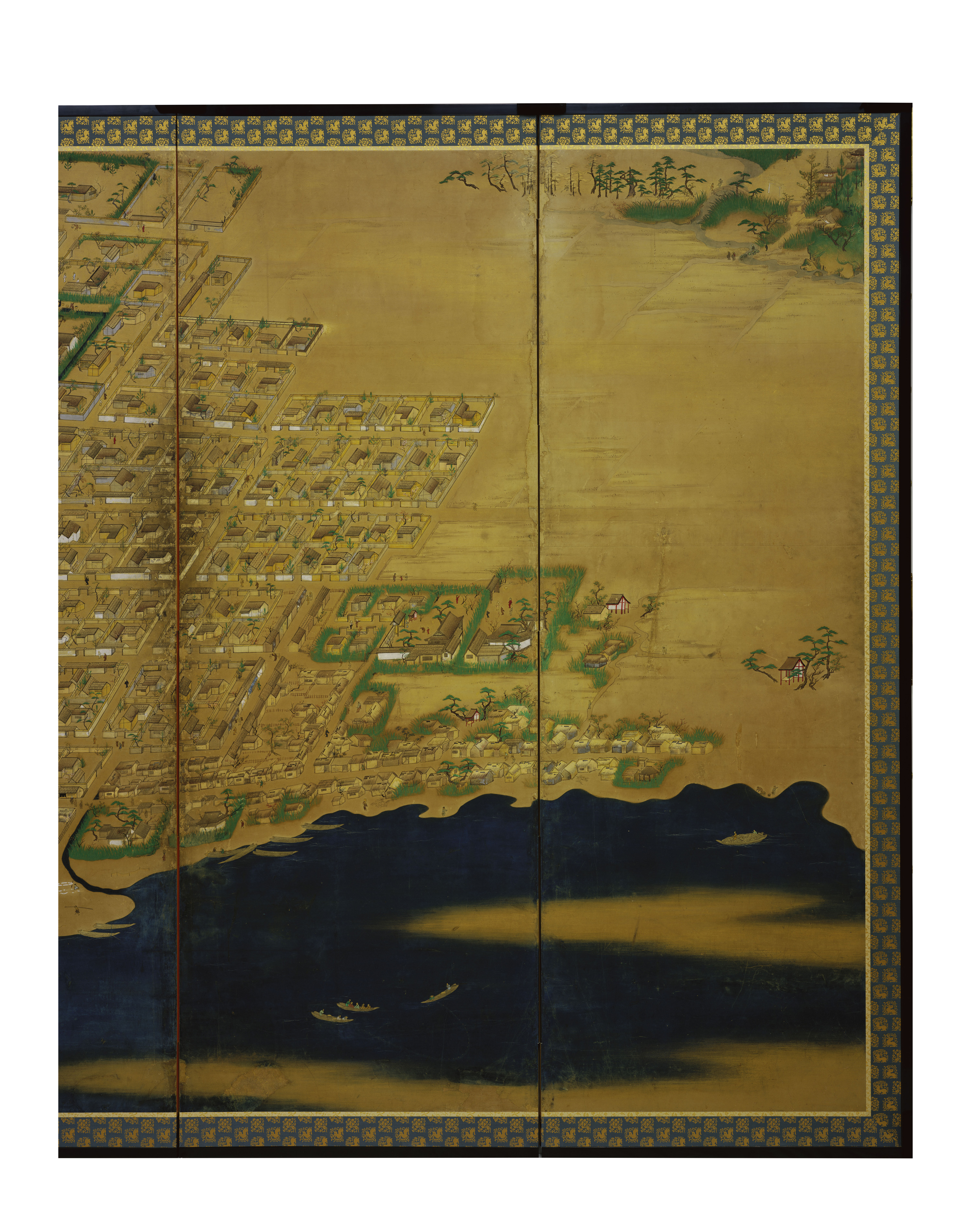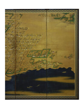 高松城下図屏風 たかまつじょうかず びょうぶ 作者 - 時代 江戸時代 17世紀 品質・員数 紙本着色 8曲1隻 法量(cm) 縦167.0 横489.0 分類 絵画(国内) 指定区分 県指定 収蔵番号 MY0#00016 解説 高松城と城下町を高いところから見下ろすように描いた屏風絵。画面の下が北で、城下町全体と東西の周辺部を範囲としているが、その範囲から外れる屋島(左下)、高松の氏神社である石清尾(いわせお)八幡宮(右上)も画面に含まれる。 海に面して築城された高松城内の中央には、三重四階の天守と二の丸、中堀の内には三の丸、桜馬場(さくらのばば)、西の丸が配され、外堀の内には上級の武家屋敷が描かれている。外堀には大小の舟が停泊し、三の丸の沖には藩主専用の御座船(ござぶね)も見える。外堀の外には、中下級の武家屋敷、さらには商人街や職人街、生け垣に囲まれた寺院等が確認できる。 屏風には落款や印章がなく、作風からも筆者の特定は難しいが、高松城や城下町を知るための豊富な情報を提供する貴重な資料である。 関連作品 高松松平家博物図譜のうち衆禽画譜 ひろがり 人麻呂・小町・喜撰図(松平頼重和歌幅) 高松松平家博物図譜 のうち 衆鱗図 作品をさがす リセット キーワード検索 分類 すべて 絵画(国内) 絵画(国外) 彫刻 工芸 書 デザイン 民俗資料 その他 指定区分 すべて 国宝 重要文化財 重要美術品 県指定 市町指定 検索