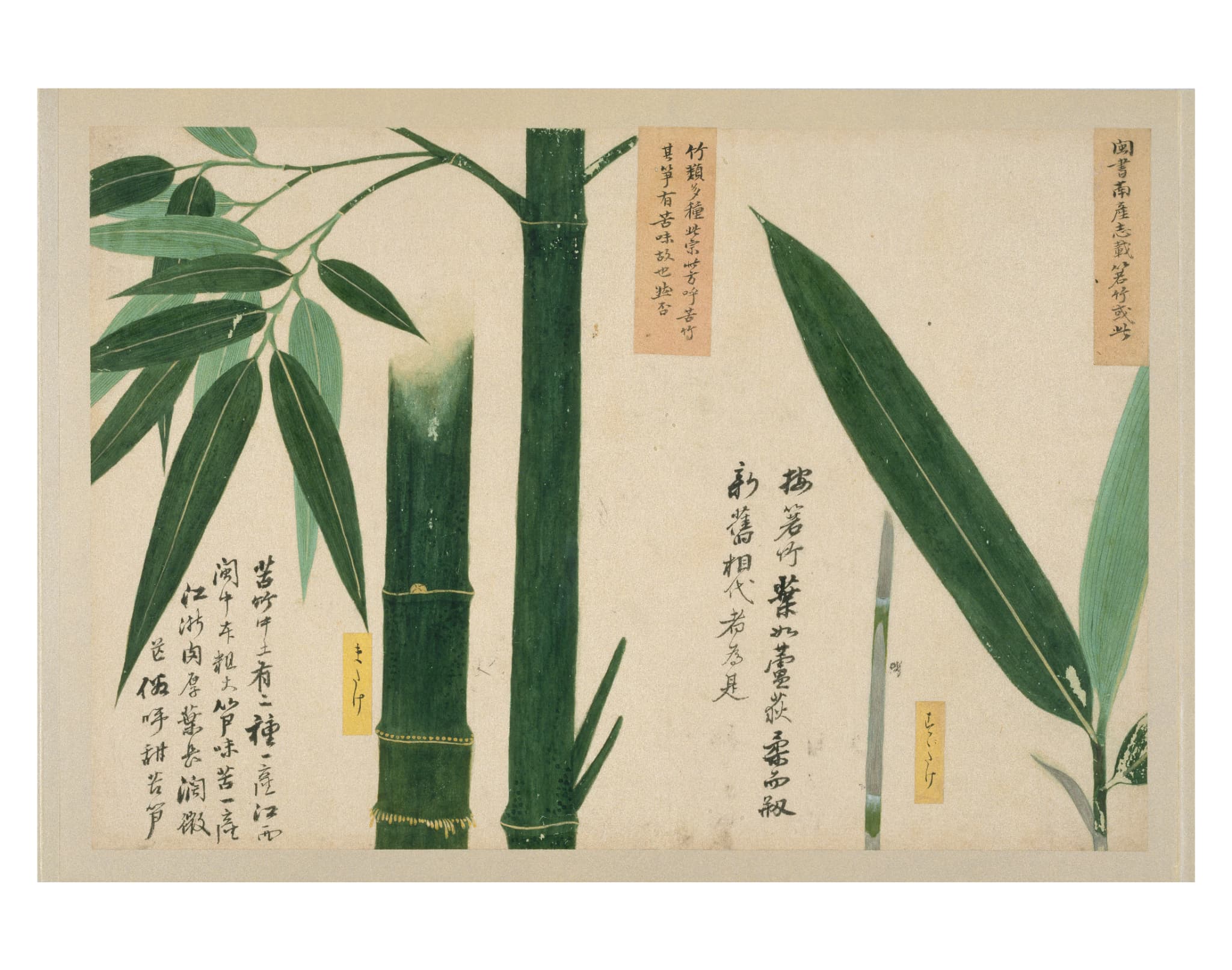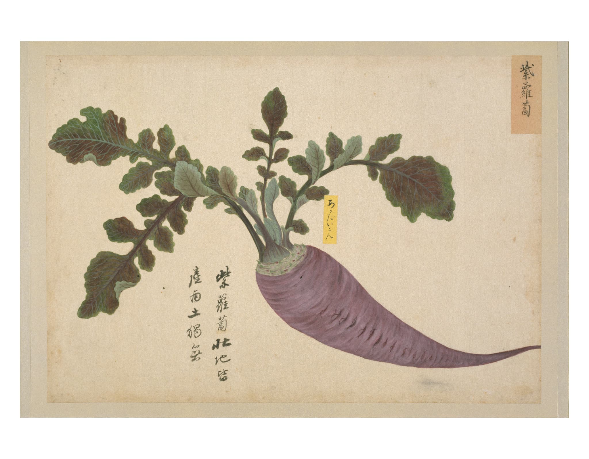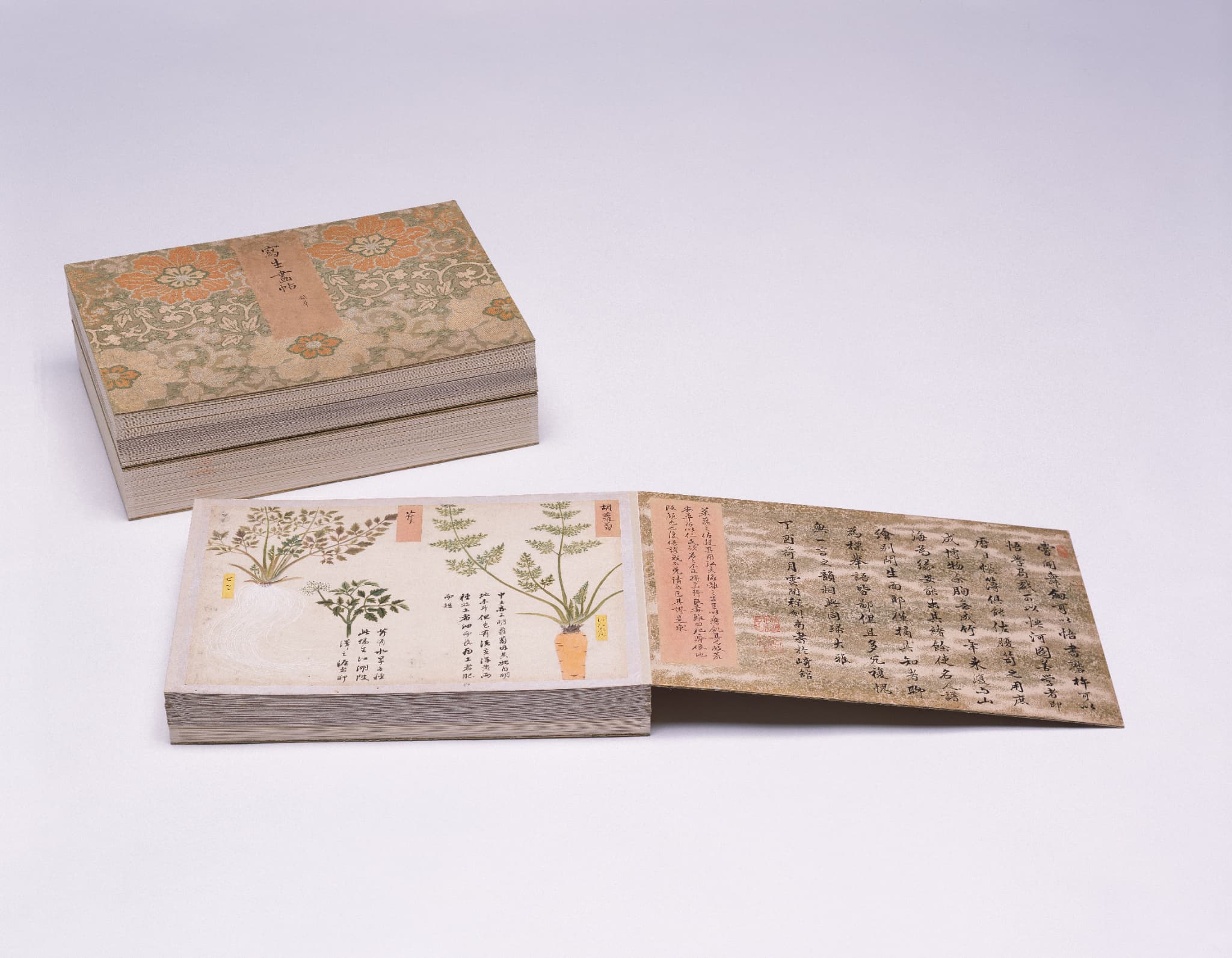 高松松平家博物図譜のうち写生画帖 たかまつ まつだいらけ はくぶつ ずふ のうち しゃせいがじょう 作者 ‐ 時代 江戸時代18世紀 品質・員数 紙本着色 画帖装(折本形式)・3帖 法量(cm) (菜疏)縦33.1 横48.2 分類 絵画(国内) 指定区分 県指定 収蔵番号 MY0#01083 もっと見る もっと見る 解説 「写生画帖」は、高松藩主松平家に伝来する4種13帖の博物図譜のひとつで、菜疏(さいそ)・雑草(ざっそう)・雑木(ざつぼく)の3帖の画帖からなる植物図鑑である。葉や根、花や実を細部まで精緻に描き、雲母(うんも)による光沢や盛り上げ彩色で質感や立体感を表現している。図は楮紙(こうぞし)に描かれて台紙に貼られるが、一部は葉先などを輪郭に沿って切り抜いた図もある。図の多くに名称を記した付札が添えられている。「写生画帖」は「衆鱗図」第2帖とともに長崎に持ち込まれ、当時来日していた中国人に漢名などを尋ねたことが知られている。赤い貼紙の墨書は、高松藩主松平家側の説明や質問で、台紙や表紙・裏表紙見返しの墨書は中国人の回答と考えられている。博物学好みで知られた高松藩主松平家5代頼恭(よりたか、1711-1771)の命を受け、高松藩に仕えていた平賀源内が関わって18世紀半ばに制作されたと考えられる。作者は南蘋派(なんぴんは)の楠本雪渓(くすもと せっけい)や、その弟子で讃岐出身の三木文柳(みき ぶんりゅう)との説があるが、定説はない。 関連作品 高松松平家博物図譜 のうち 衆鱗図 源平合戦図屏風(屋島) 和歌短冊屏風 高松松平家博物図譜のうち衆芳画譜 作品をさがす リセット キーワード検索 分類 すべて 絵画(国内) 絵画(国外) 彫刻 工芸 書 デザイン 民俗資料 その他 指定区分 すべて 国宝 重要文化財 重要美術品 県指定 市町指定 検索