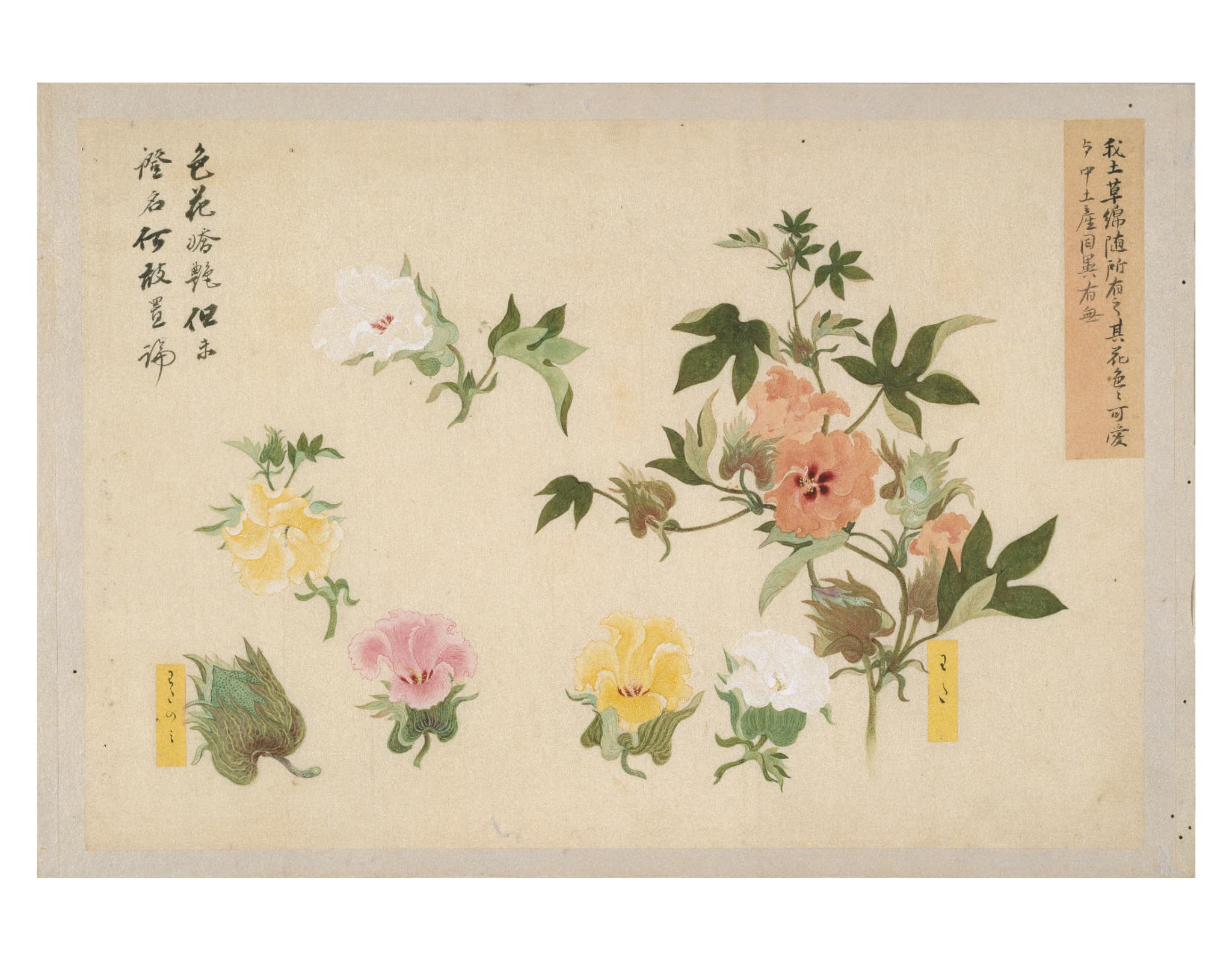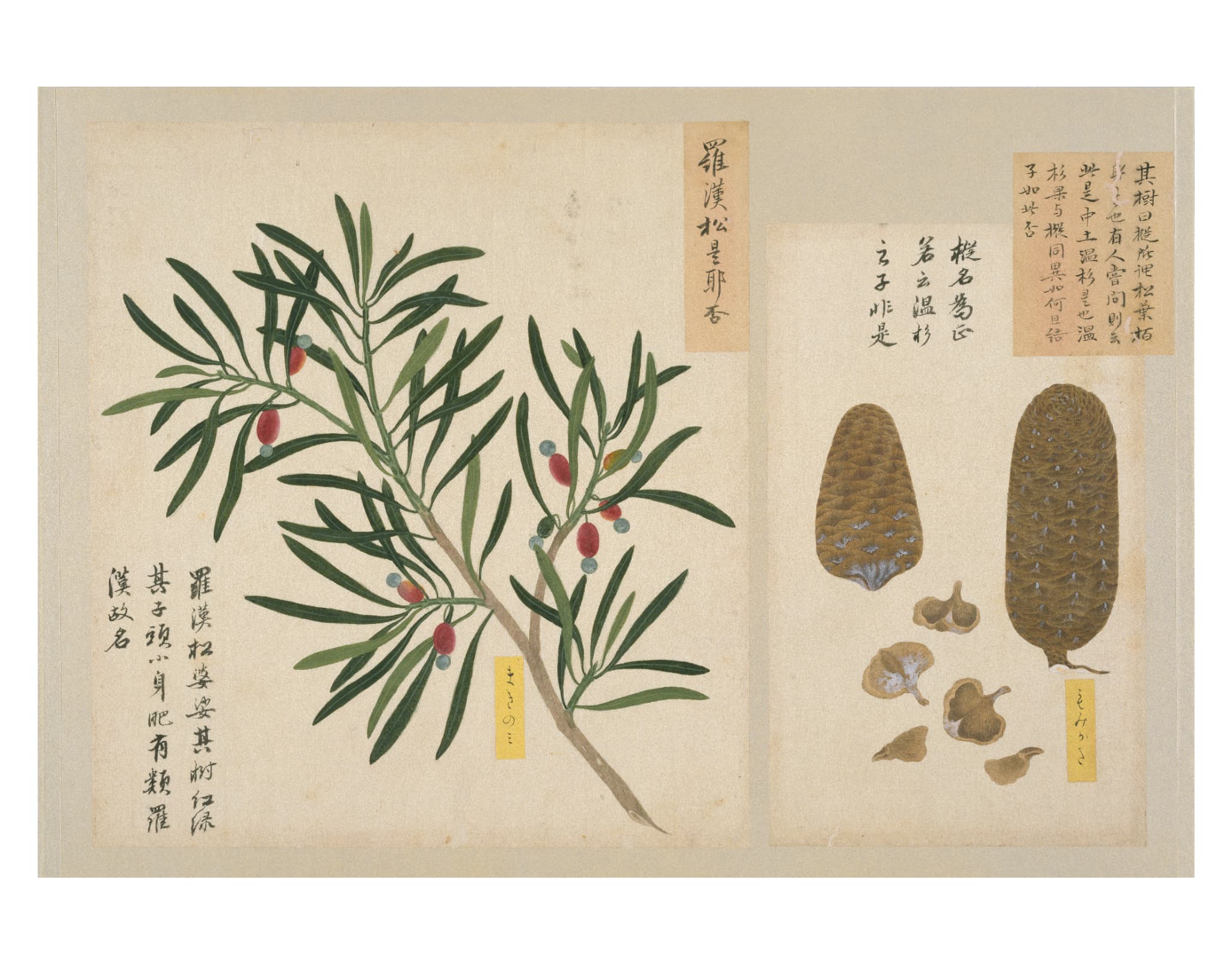 葉や根、花や実を細部まで精緻に描き、雲母(うんも)による光沢や盛り上げ彩色で質感や立体感を表現している。図は楮紙(こうぞし)に描かれて台紙に貼られるが、一部は葉先などを輪郭に沿って切り抜いた図もある。