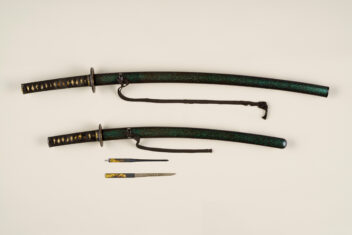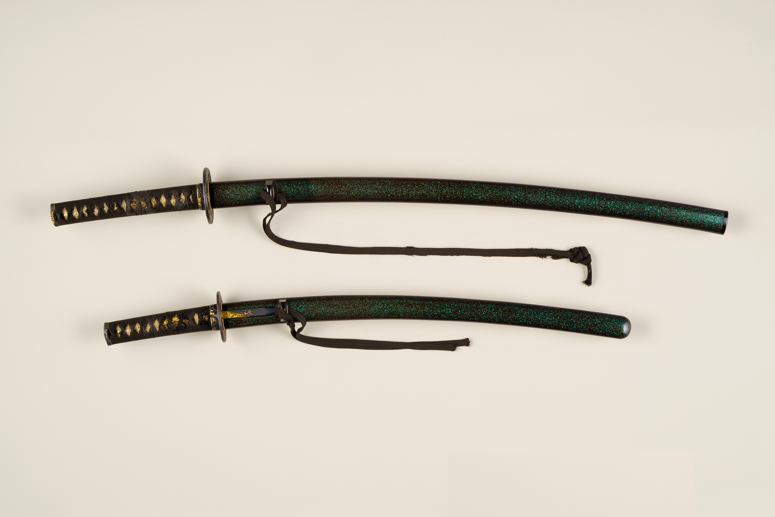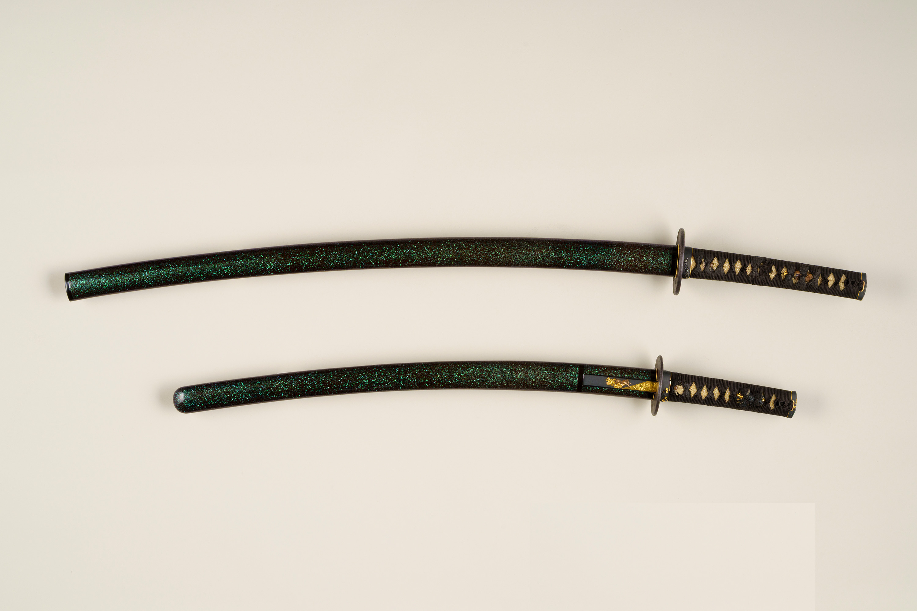 刀身を指し込む鞘は、小さく砕いた青く光る貝を混ぜた漆が塗られ、光があたるときらきらと輝くところが見所である。この大小拵を飾る金具は、三谷茂義の作で、意匠が揃えられている。