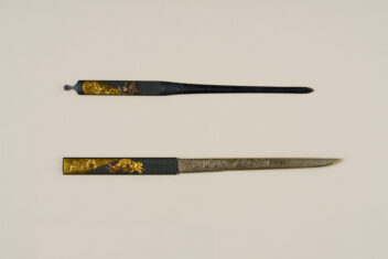 青貝微塵塗鞘および大小拵 あおがい みじんぬり さや および だいしょう こしらえ 作者 三谷茂義(みたに しげよし、生没年不明) 時代 江戸時代 18世紀 品質・員数 刀装具 1揃 法量(cm) 大刀拵 全長100.0、小刀拵 全長78.2 分類 工芸 指定区分 県指定 収蔵番号 TI0#00001、TI0#00002 解説 刀剣を身に着けるための装具である鞘(さや)、柄(つか)、鐔(つば)などをまとめて拵(こしらえ)という。江戸時代の武士は長い刀(打刀)と短い刀(脇指)の一組にして身に着けた。大小の刀の拵を、意匠などを揃えて制作したものを大小拵(だいしょうこしらえ)という。刀身を指し込む鞘は、小さく砕いた青く光る貝を混ぜた漆が塗られ、光があたるときらきらと輝くところが見所である。この大小拵を飾る金具は、三谷茂義の作で、意匠が揃えられている。三谷茂義は高松藩の御用を務めた金工で、江戸時代後期に活躍した。茂義は、魚卵のように小さな丸模様を連ねた「魚子地(ななこじ)」を得意としており、この拵の金具にも用いられている。 関連作品 堆朱菊桐鳳凰文料紙文庫・硯箱 堆朱鼓箱 脇差 銘 讃州住盈永 蒟醬存清林間飛翔箱 作品をさがす リセット キーワード検索 分類 すべて 絵画(国内) 絵画(国外) 彫刻 工芸 書 デザイン 民俗資料 その他 指定区分 すべて 国宝 重要文化財 重要美術品 県指定 市町指定 検索