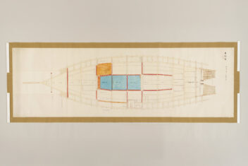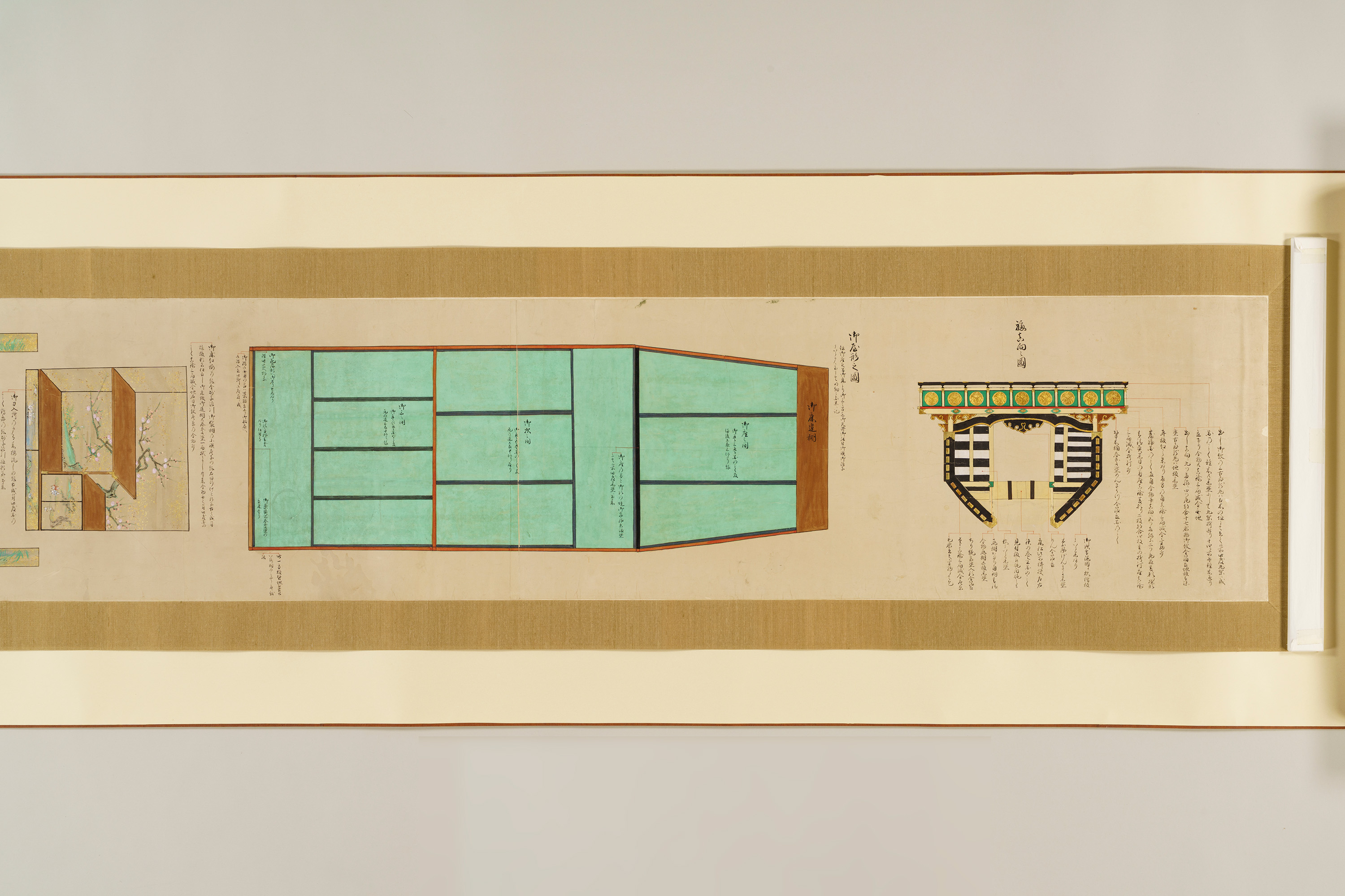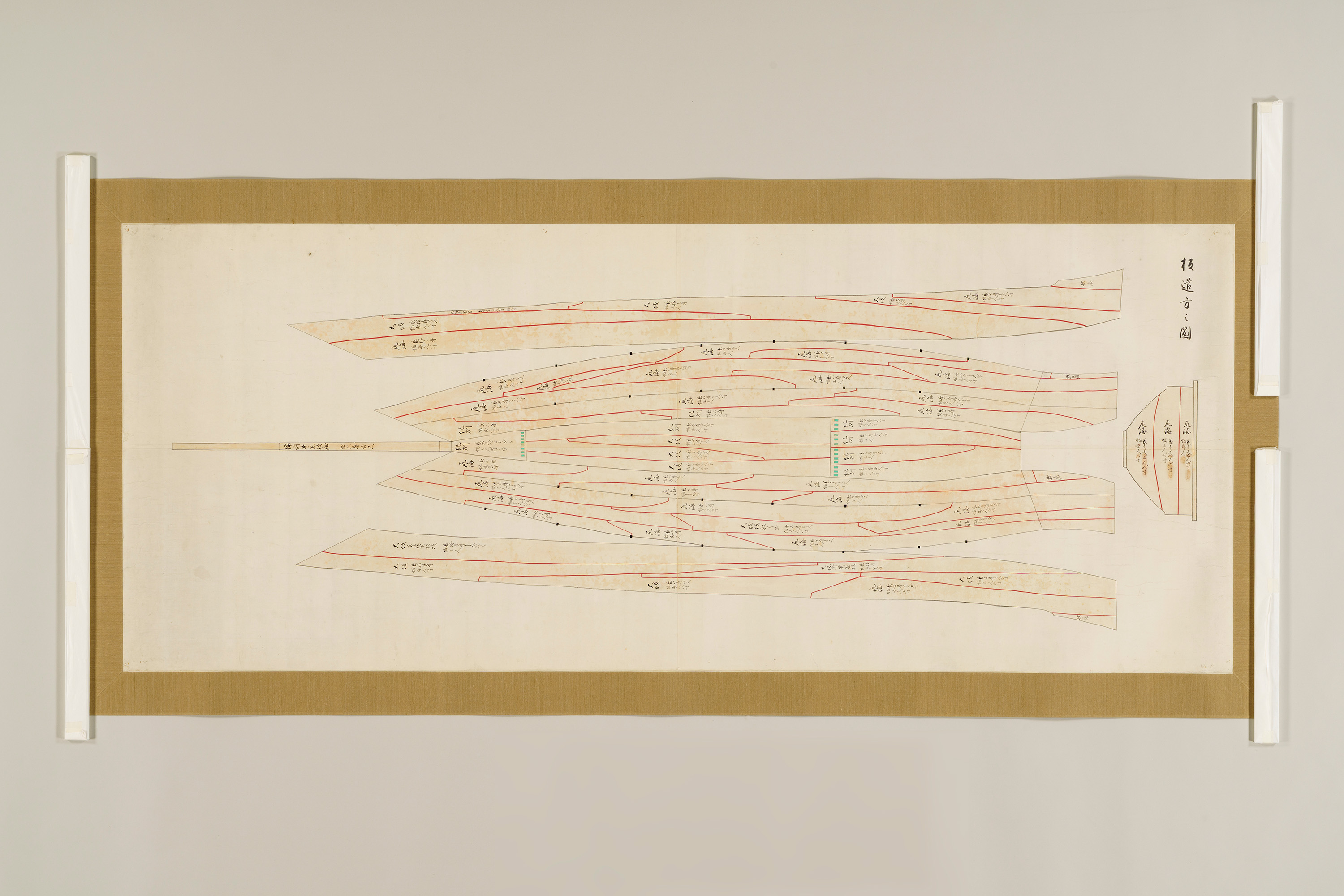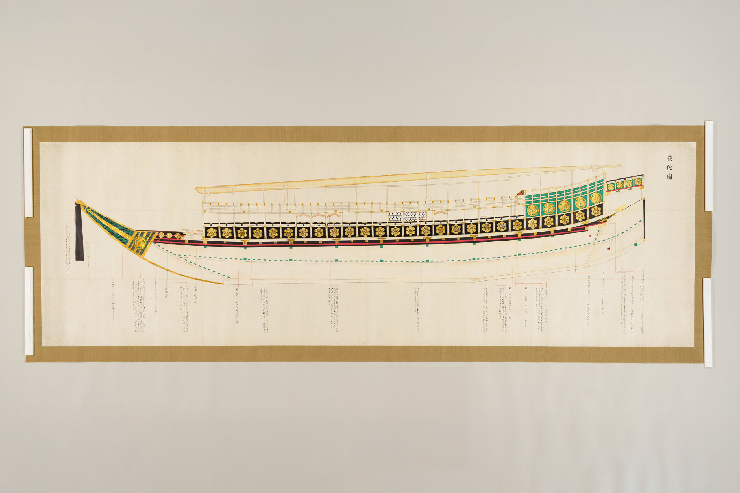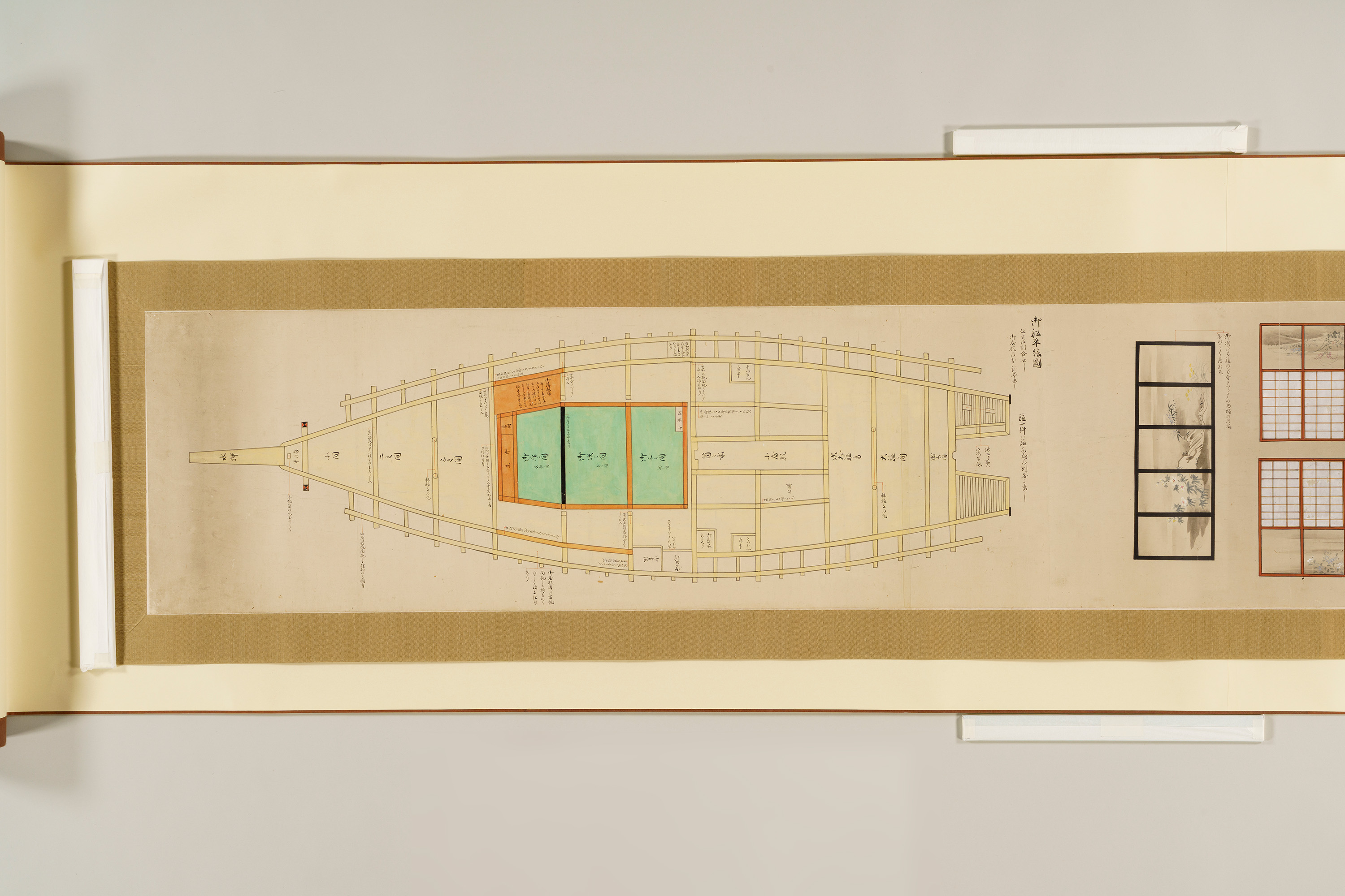 1 惣図 157.5×223.0 2 艫真向之図・御屋形之図 37.0×434.0 3 御花屋形之図・御船平絵図 37.0×362.5 4 惣絵図 115.4×369.3 5 平絵図 115.2×370.3 6 艫真向之図 75.0×95.0 7 板遣方之図 76.4×190.1 8 航加敷中棚上棚共仕立幅之図 76.2×190.1