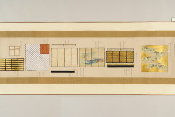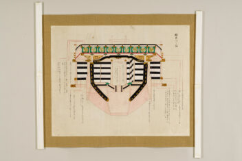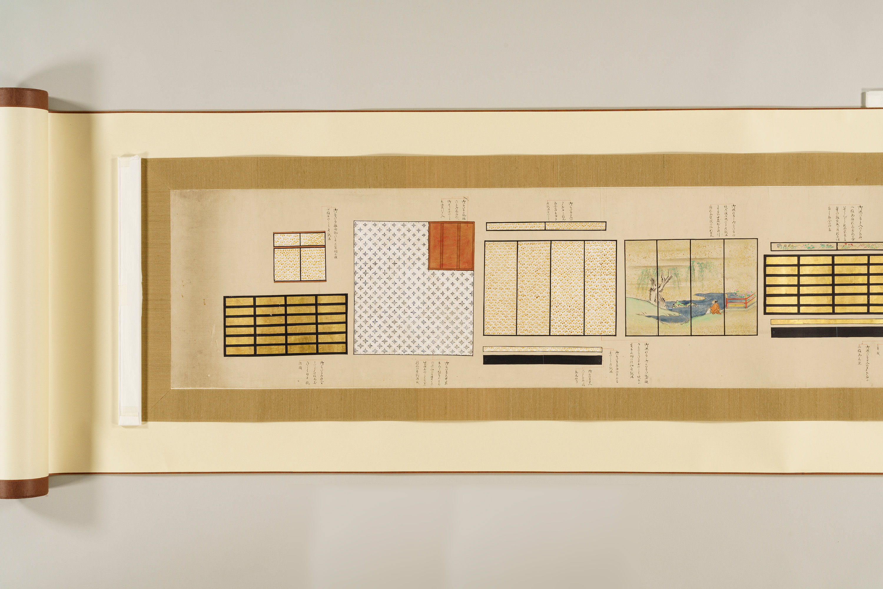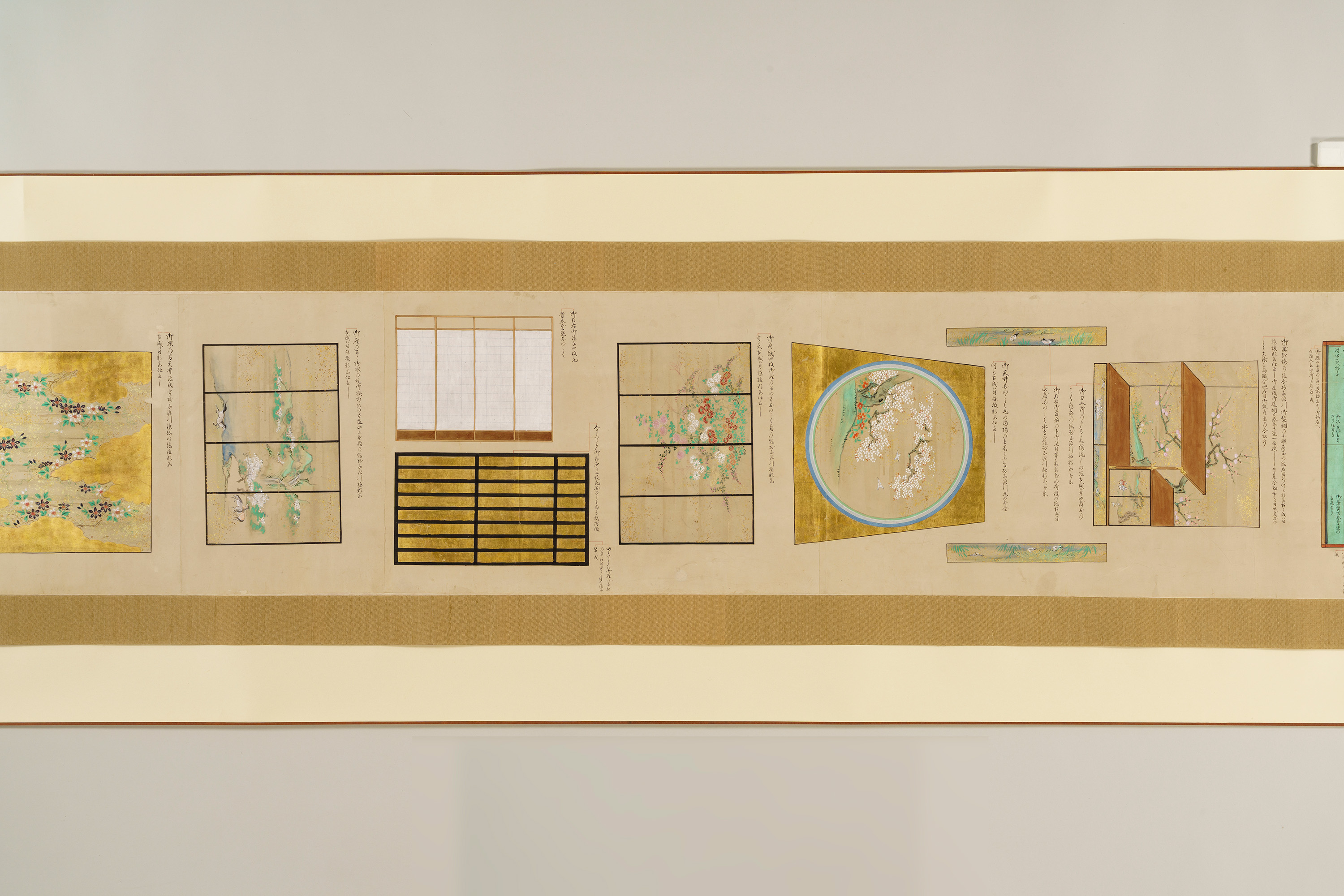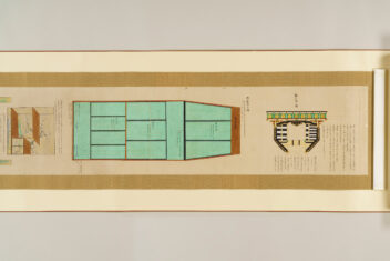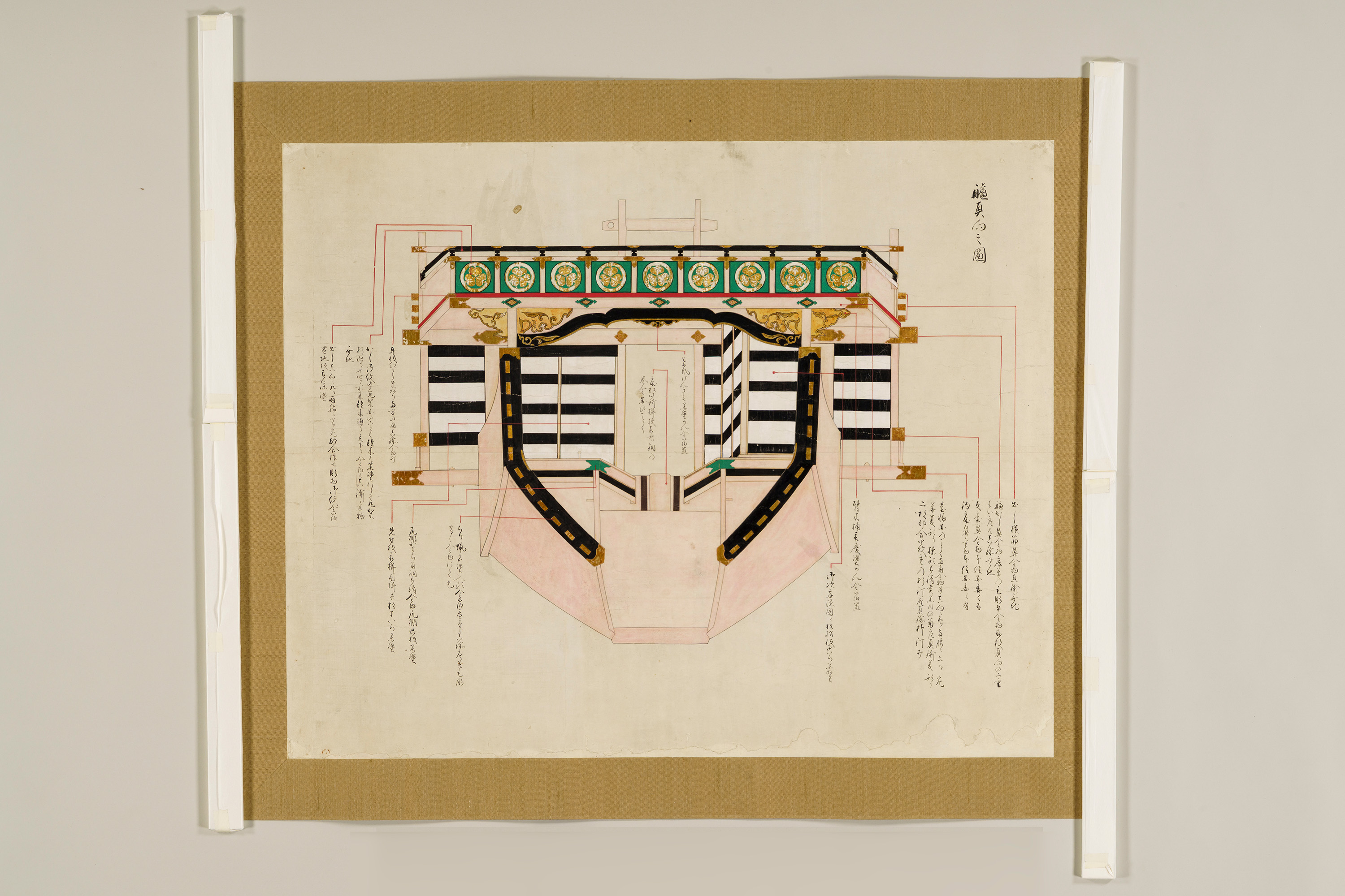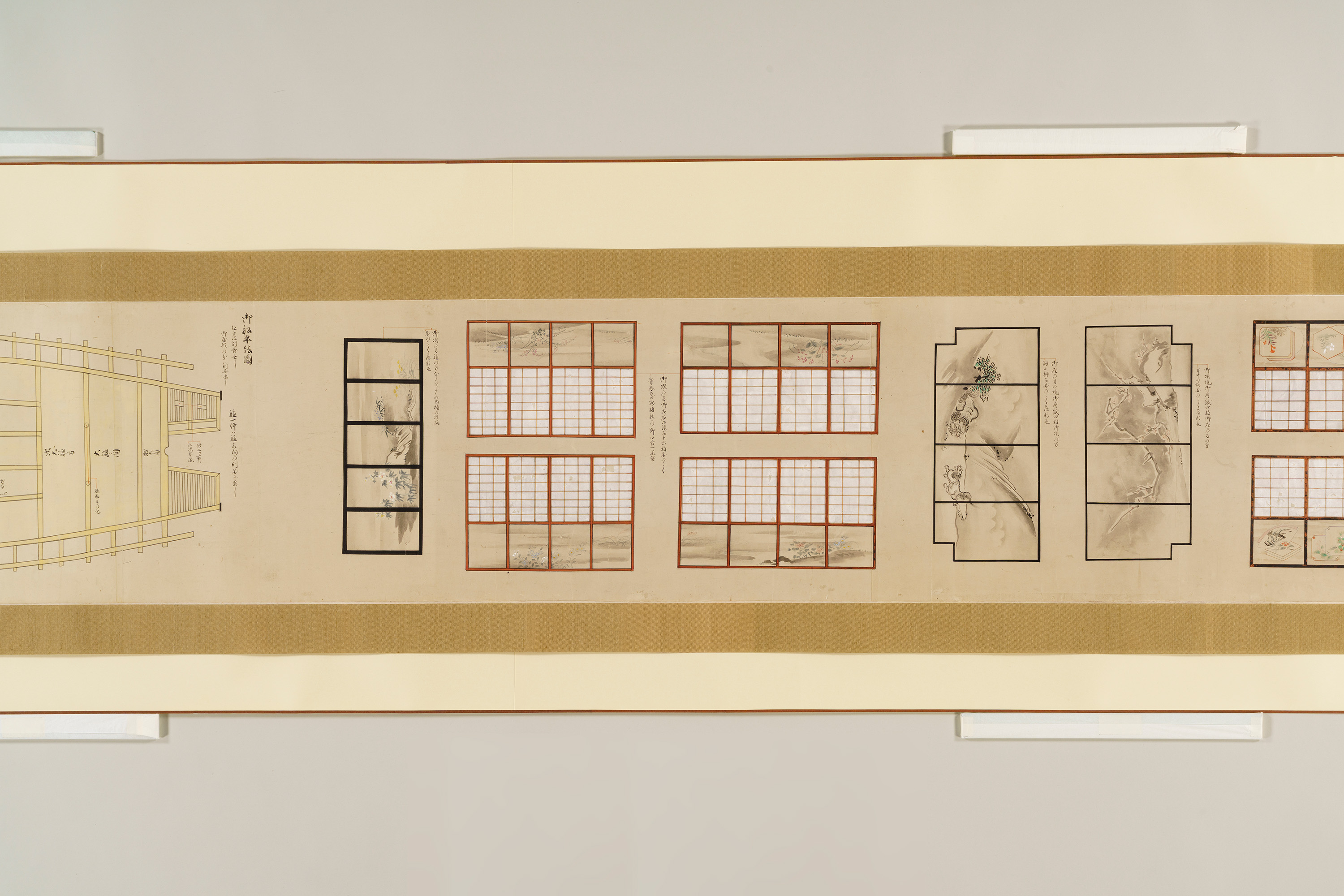 1 惣図 157.5×223.0 2 艫真向之図・御屋形之図 37.0×434.0 3 御花屋形之図・御船平絵図 37.0×362.5 4 惣絵図 115.4×369.3 5 平絵図 115.2×370.3 6 艫真向之図 75.0×95.0 7 板遣方之図 76.4×190.1 8 航加敷中棚上棚共仕立幅之図 76.2×190.1