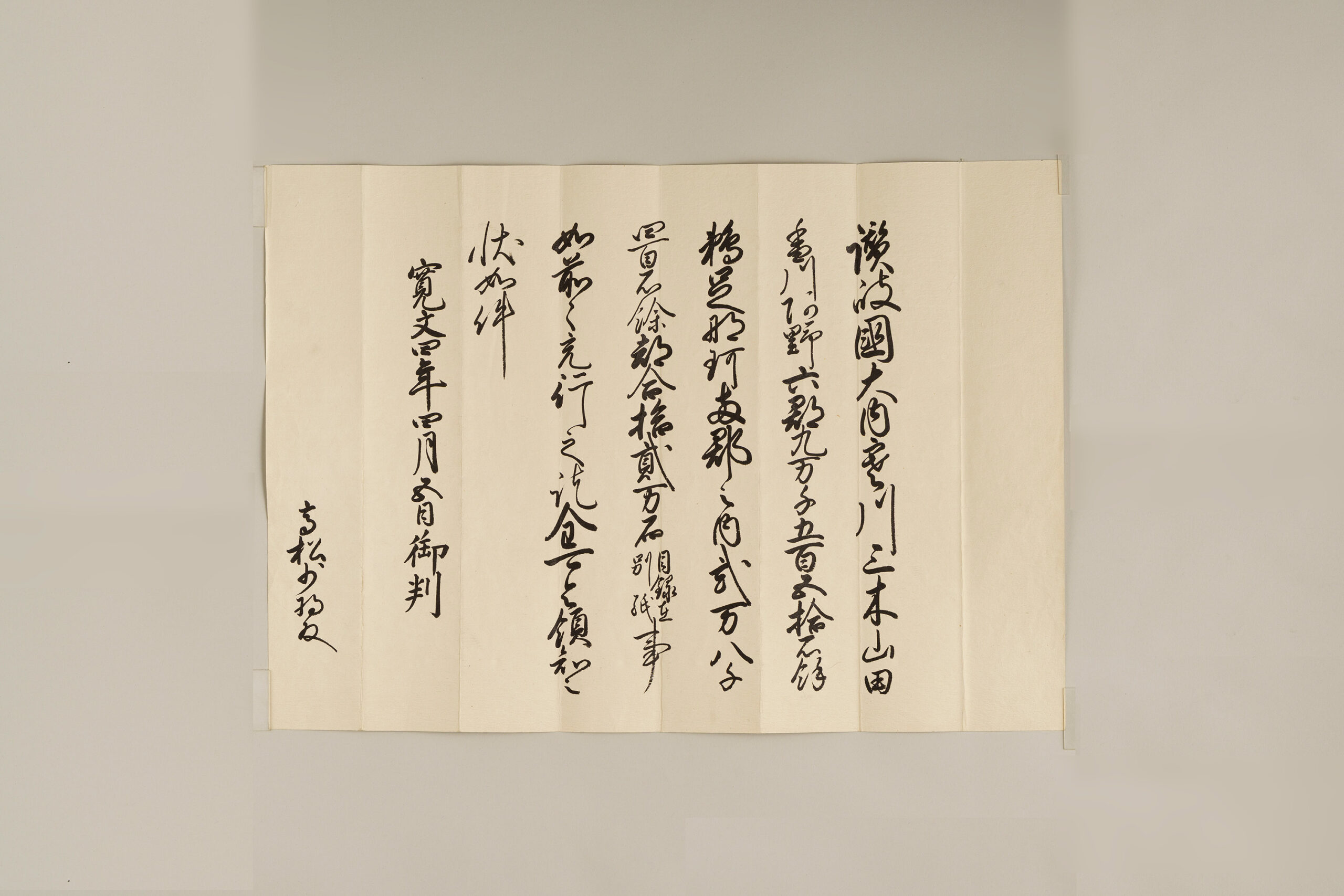 江戸時代において、大名による土地とそこに住む人々の支配は、将軍から認められることで成立した。そのために将軍から各大名に与えられたのが領知宛行状で、将軍の代替わりごとに出された。本資料の年月日の下の「御判」と記された部分には、原本では家綱の花押(かおう)が据えられていた。明治時代に新政府に領知宛行状を提出したため、高松松平家に原本は伝わっていないが、領知宛行状の江戸時代に作られた写しがすべて揃っている。松平家が高松藩主であることを象徴する重要な文書である。