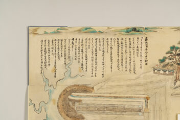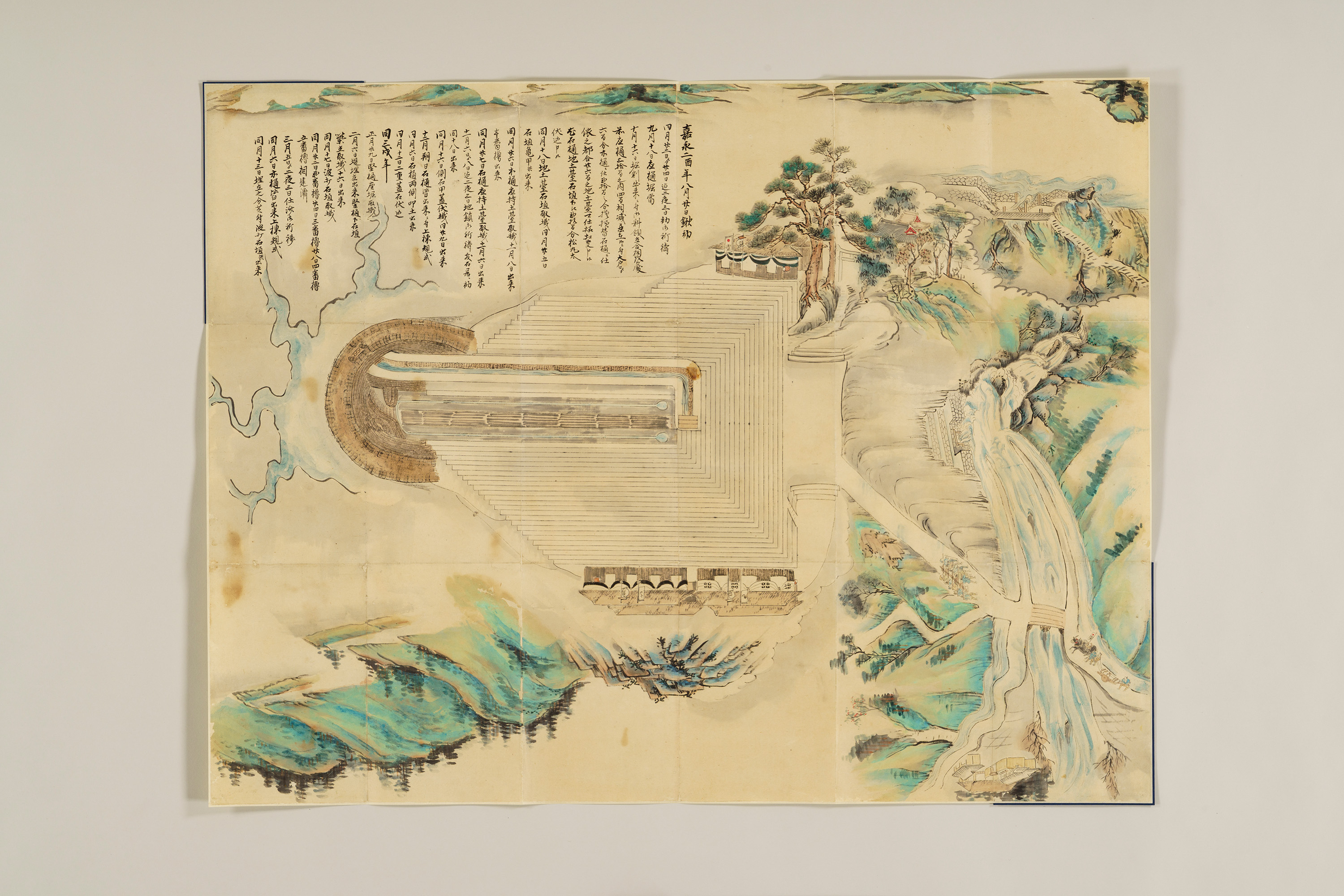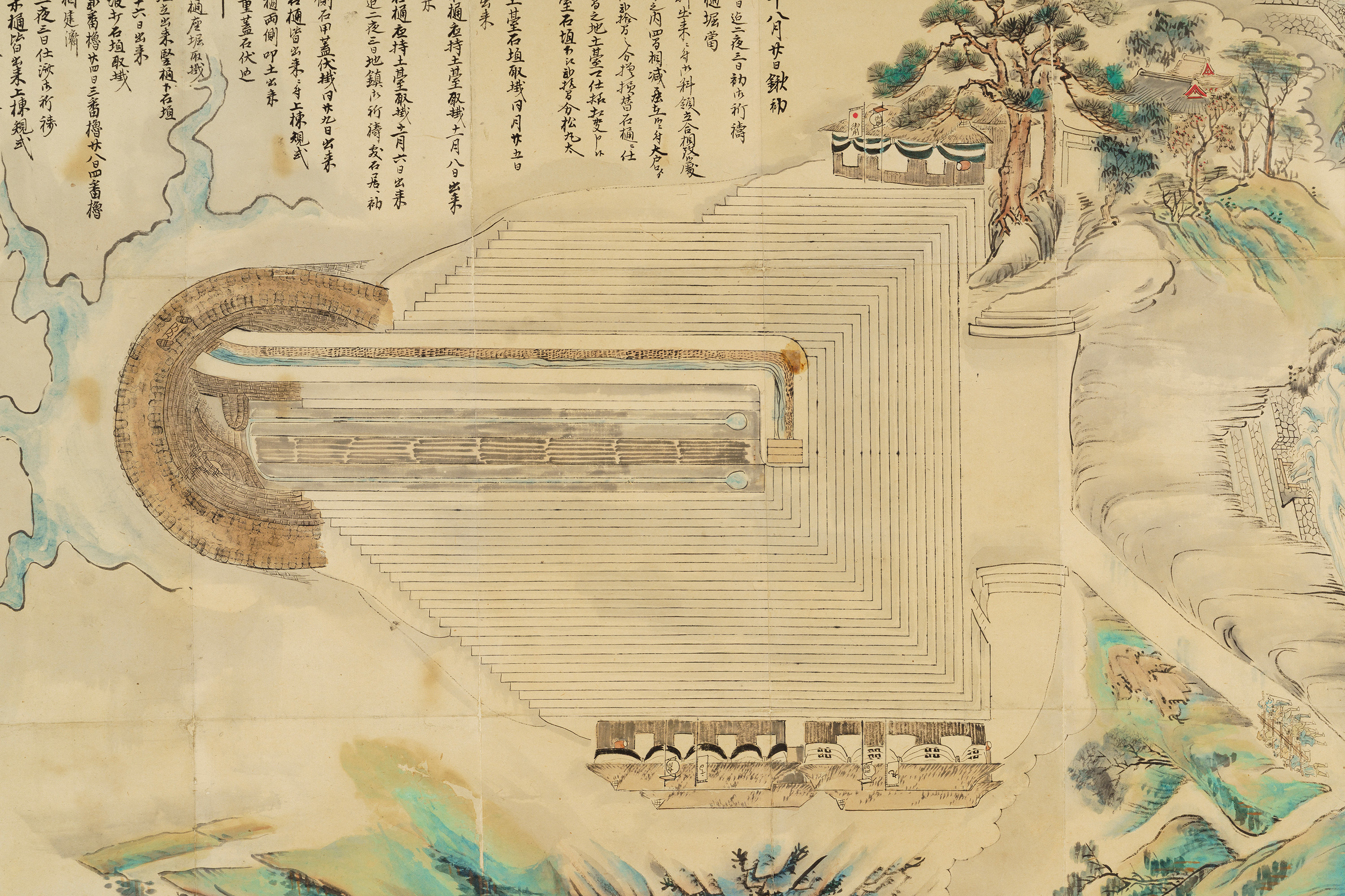 日本最大のため池で、国の名勝に指定されている満濃池において、江戸時代末期にあたる嘉永3年(1850)に、木製の樋(通水管)を石製の樋に付け替える普請(工事)の様子を表した絵図である。