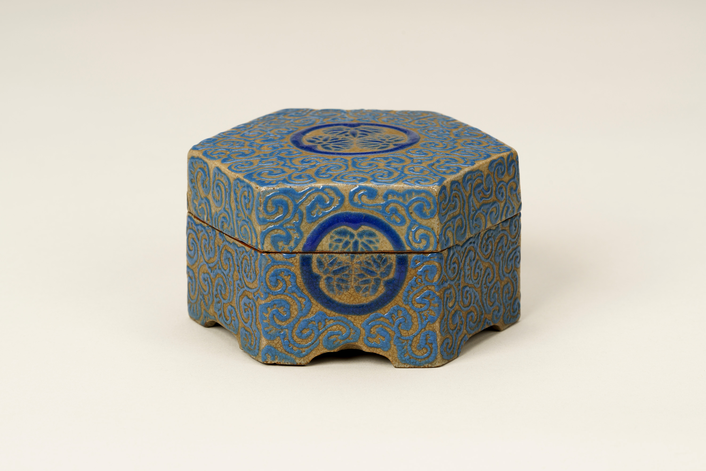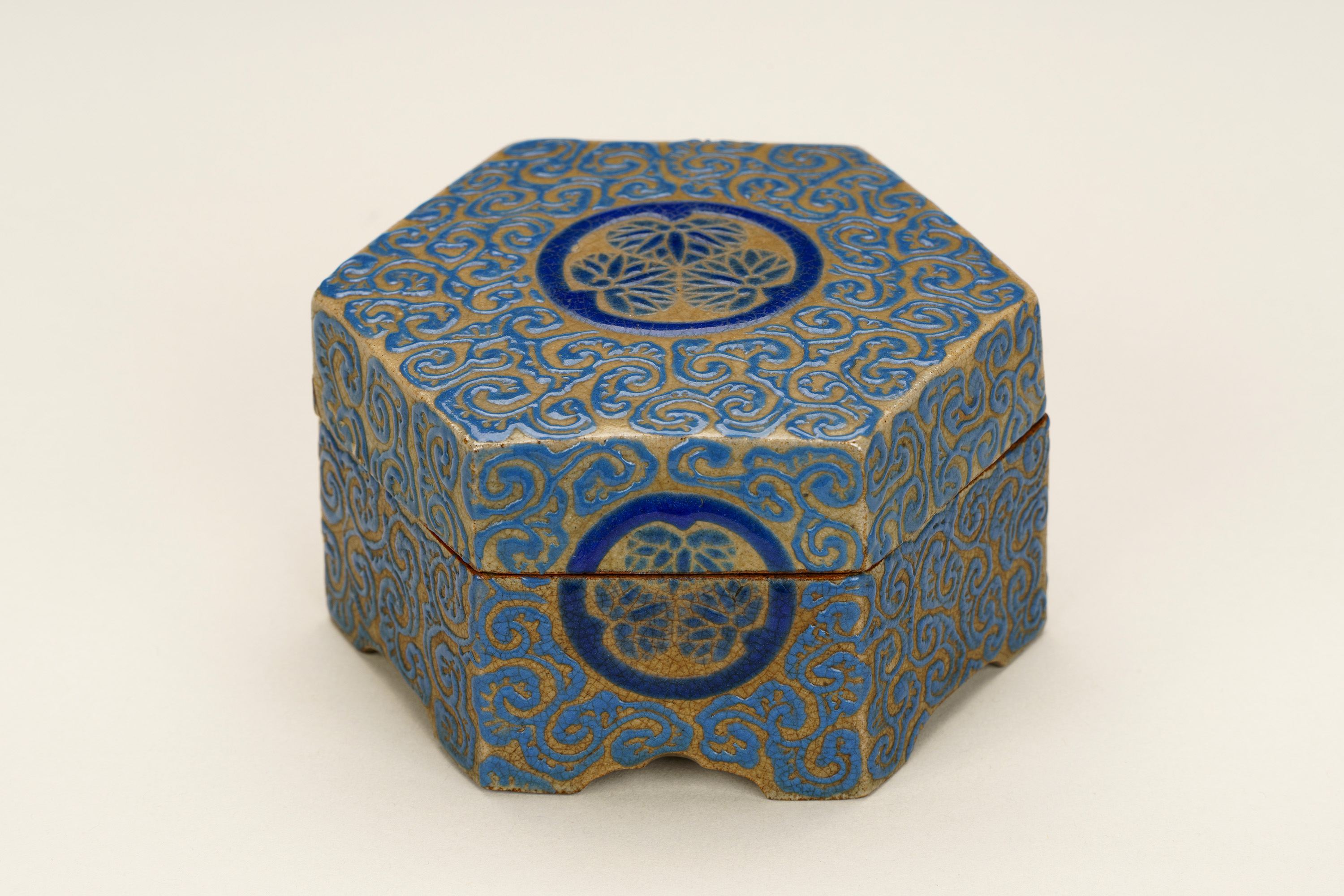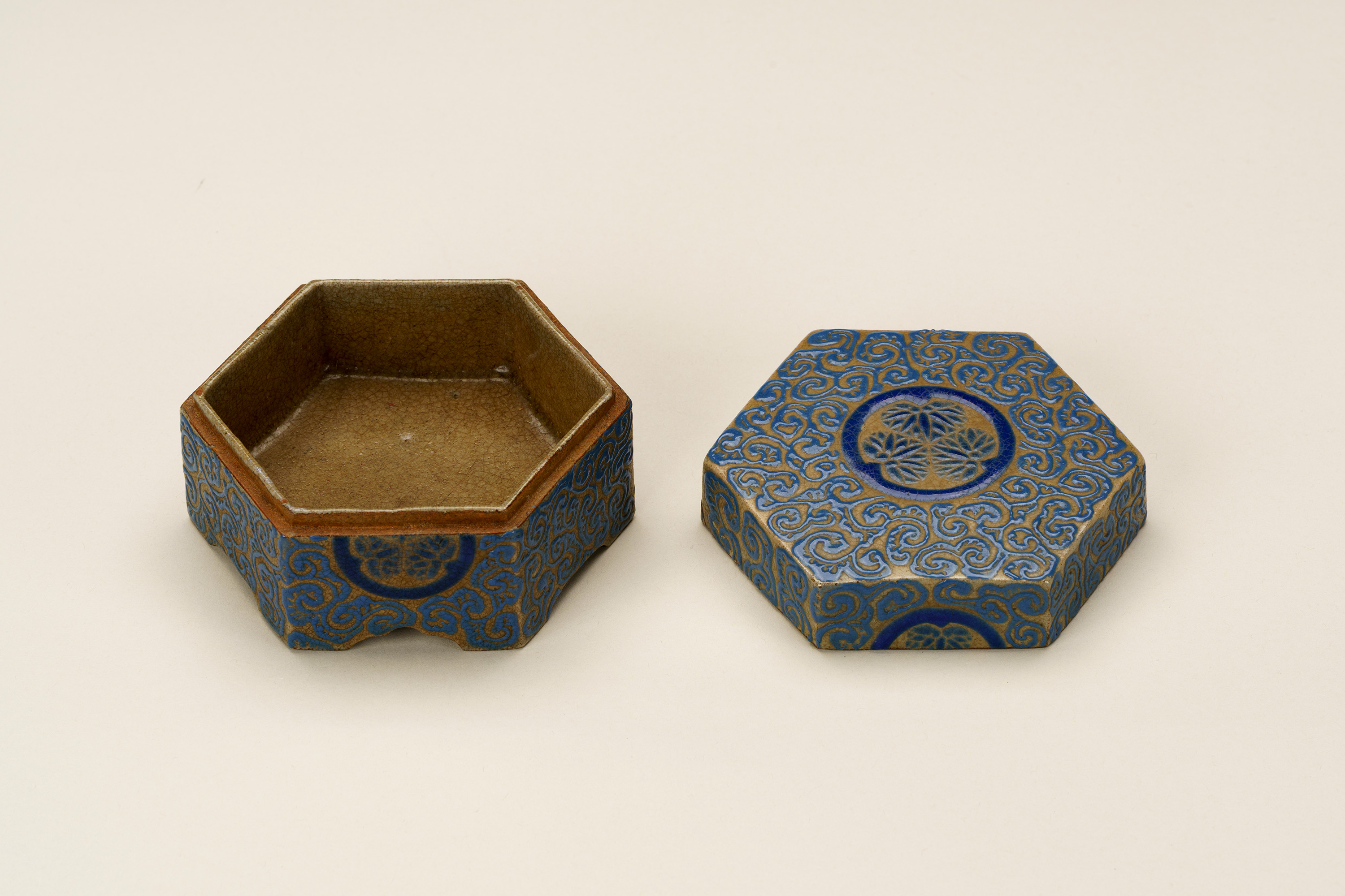高松藩の御用焼物である理兵衛焼(りへえやき)の香合。外形は六角形の「亀甲」としている。灰色の地に深い青色の釉薬(ゆうやく、上薬のこと)で唐草風の文様を全面に描く。蓋の表の中央と、身の正面に高松藩主である松平家の家紋「丸に三葵紋」が表されている。
