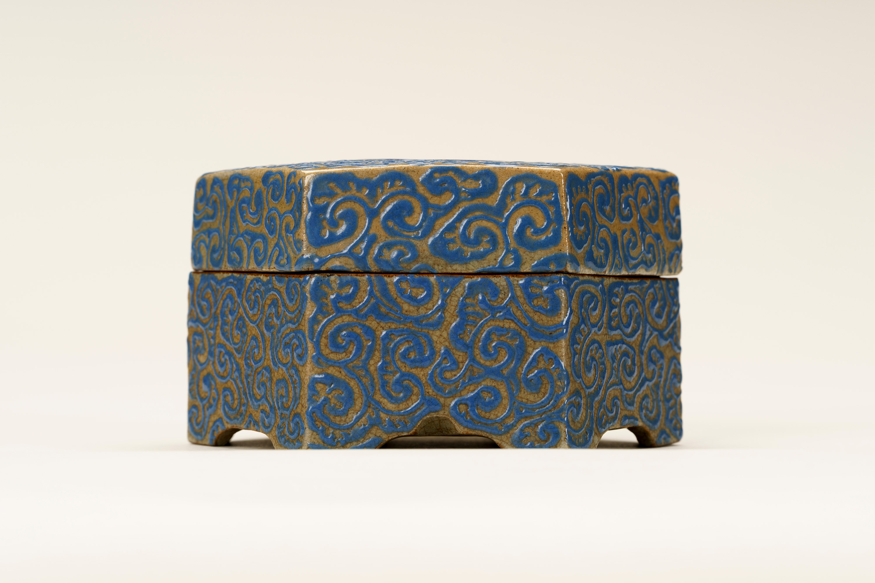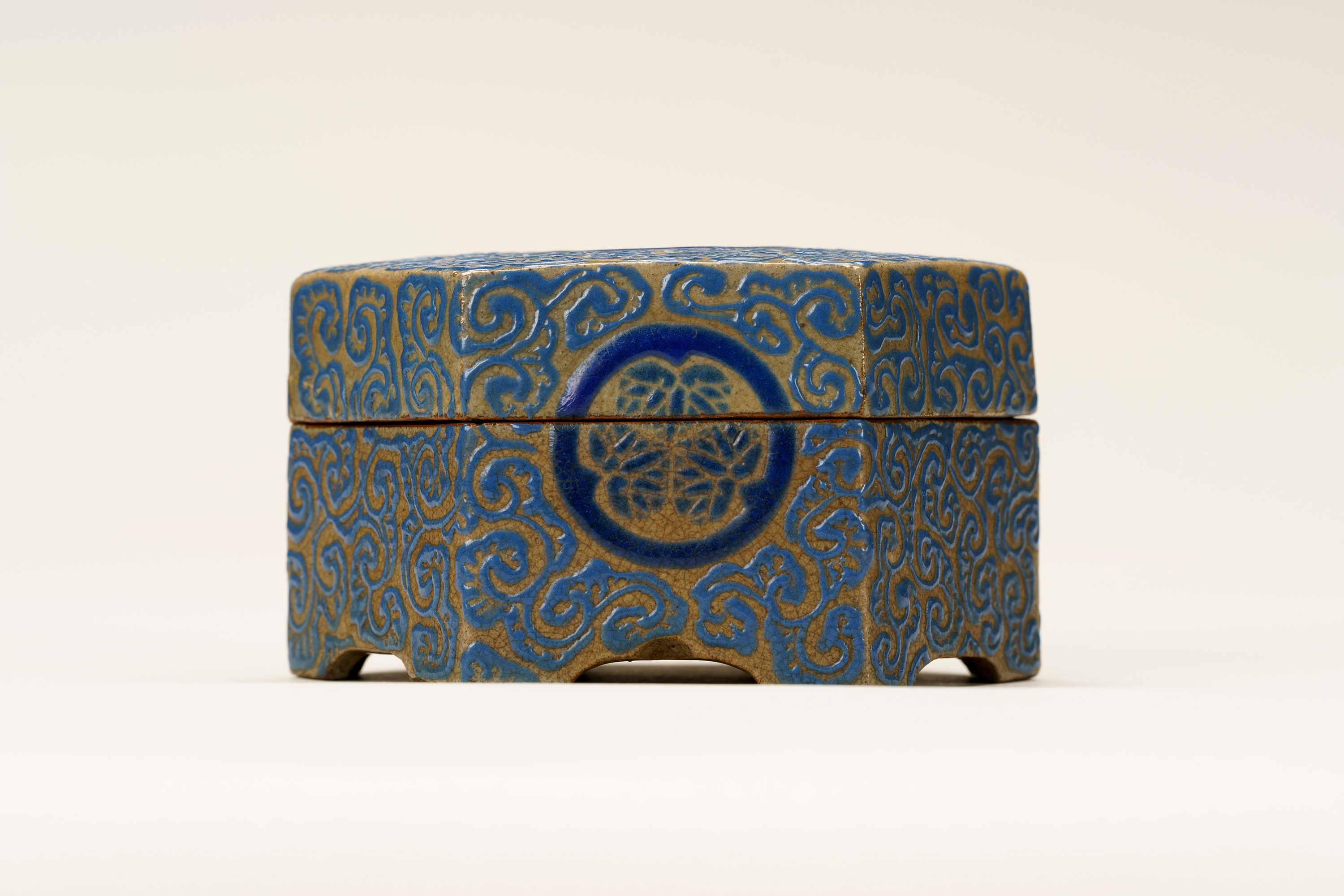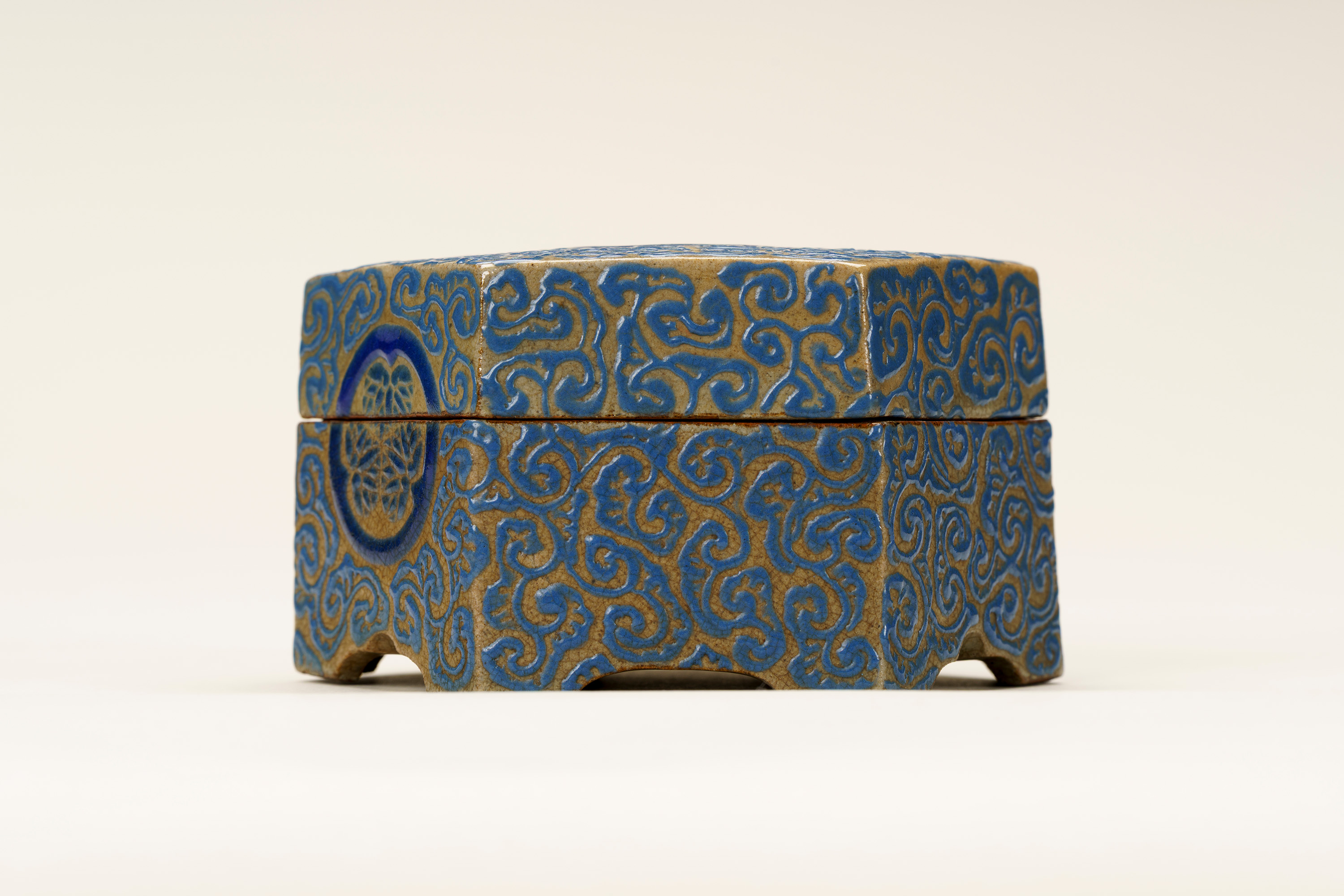 高松藩の御用焼物である理兵衛焼(りへえやき)の香合。外形は六角形の「亀甲」としている。灰色の地に深い青色の釉薬(ゆうやく、上薬のこと)で唐草風の文様を全面に描く。蓋の表の中央と、身の正面に高松藩主である松平家の家紋「丸に三葵紋」が表されている。