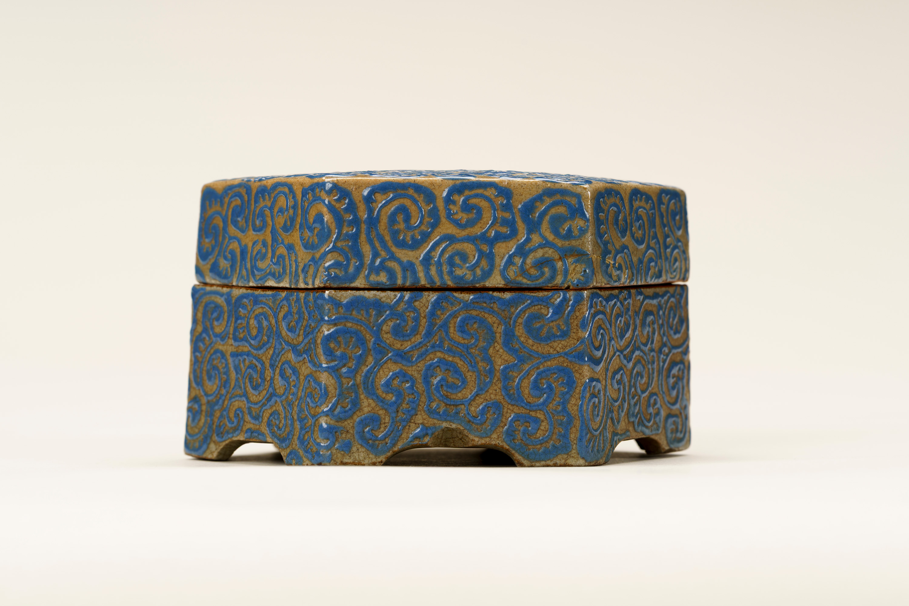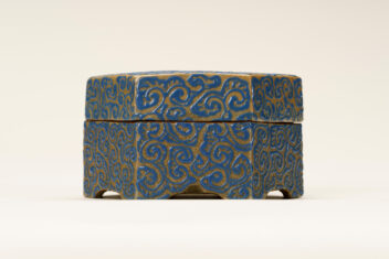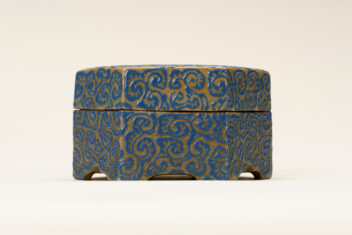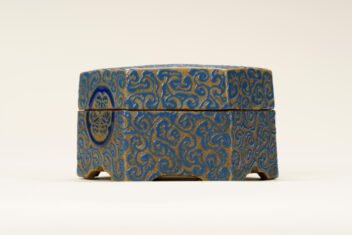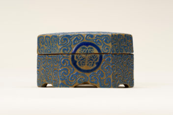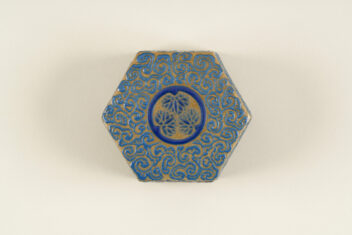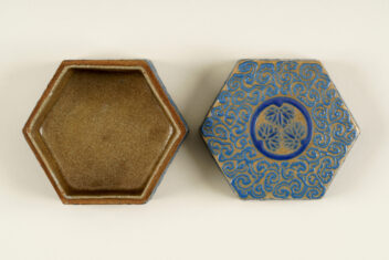 亀甲大香合 きっこう だいこうごう 作者 紀太理兵衛(きた りへえ、生没年不明) 時代 江戸時代 17世紀 品質・員数 陶器 1合 法量(cm) 幅11.2 高6.3 分類 工芸 収蔵番号 MY0#00374 もっと見る もっと見る 解説 高松藩の御用焼物である理兵衛焼(りへえやき)の香合。外形は六角形の「亀甲」としている。灰色の地に深い青色の釉薬(ゆうやく、上薬のこと)で唐草風の文様を全面に描く。蓋の表の中央と、身の正面に高松藩主である松平家の家紋「丸に三葵紋」が表されている。香合は、香を入れる蓋付の器で、陶磁器製の品の他に、漆器や金属製のものもある。茶席を飾る品としても用いられ、小さな作品が多い中、本作は大ぶりである。理兵衛焼は、高松藩主松平家初代頼重(よりしげ)が京から招いた陶工により始められた。陶工が代々「理兵衛」を名乗ったことから「理兵衛焼」と呼ばれる。明治時代に「理平」と改め、現在も続いている。理兵衛焼は、江戸時代の途中から、特徴的な形をした「高」の字(「破風高(はふたか)」と呼ばれる)の印が底に押されるようになるが、本品にはその印がなく、「破風高」を用いる以前の作品とみられる。 関連作品 蒟醬存清林間飛翔箱 堆朱菊桐鳳凰文料紙文庫・硯箱 堆朱鼓箱 彫金初秋盛器 作品をさがす リセット キーワード検索 分類 すべて 絵画(国内) 絵画(国外) 彫刻 工芸 書 デザイン 民俗資料 その他 指定区分 すべて 国宝 重要文化財 重要美術品 県指定 市町指定 検索