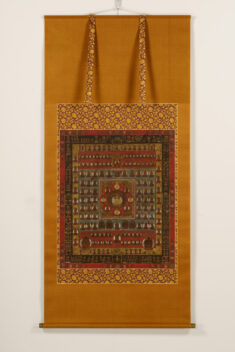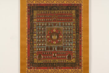 曼荼羅は、密教の世界観を仏の姿や諸尊の配置によって示す図絵であり、慈悲の広がりを表す胎蔵、悟りへの道筋を表す金剛界の2幅からなり、修行者がそれを観想することで悟りへの道を体得できると考えられた。とくに両界曼荼羅は、真言宗の根本道場である高野山や東寺をはじめ、全国の真言寺院に必ず備えられるものとなり、多くの模本や複製が作られた。精緻な彩色を施した大規模な絵画だけでなく、本図のように木版を用いた印刷をもとに、着彩した簡便な曼荼羅も流布し、密教の重要な法具として、修法や学習、信仰の広がりを支えた。