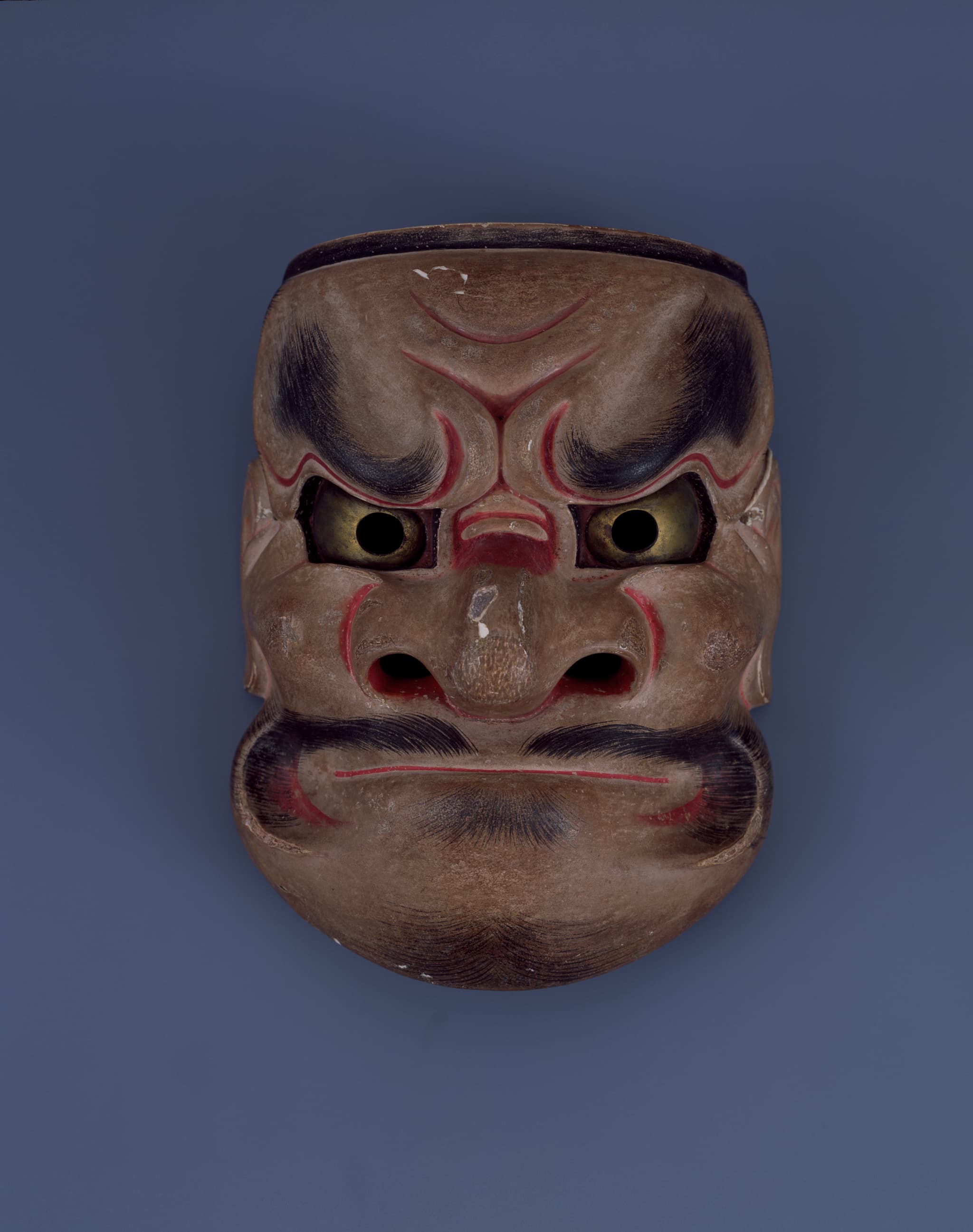 能面 大癋見 のうめん おおべしみ 作者 - 時代 江戸時代 17-18世紀 品質・員数 木造 1面 法量(cm) 縦22.1 横16.9 厚11.3 分類 彫刻 収蔵番号 MY0#00372 解説 江戸時代、能は幕府の式楽(しきがく・儀式用の芸能)として位置づけられ、武家の年中行事や儀礼においては欠かせない芸能であった。そのため、各大名家には、謡本(うたいぼん)はじめ、面(おもて)や楽器・衣裳など、上演に必要な能道具が一定数備えられていた。高松藩主松平家は喜多流(きたりゅう)の能をたしなみ、城内に能舞台を設け、役者、楽師なども抱えられていた。「癋見(べしみ)」とは、口をヘの字形に強く結ぶ「へしむ」に由来する。吽形(うんぎょう)系の鬼神(きじん)面のひとつで〈鞍馬天狗(くらまてんぐ)〉などの天狗役に用いられる。収納木箱のフタ裏に貼られた文書に、将軍徳川家8代吉宗(よしむね)が「毛描(けが)き」つまり、眉や髭を描いたと記されている。吉宗の次男・宗武(むねたけ)を祖とする御三卿(ごさんきょう)の田安徳川家の所有品であったが、近代に入り、宝生(ほうしょう)流の能楽を愛好した、旧高松藩主松平家12代頼壽(よりなが)が入手した。 関連作品 ブロンド 秣 武士は食わねど高楊枝 誕生釈迦仏立像 作品をさがす リセット キーワード検索 分類 すべて 絵画(国内) 絵画(国外) 彫刻 工芸 書 デザイン 民俗資料 その他 指定区分 すべて 国宝 重要文化財 重要美術品 県指定 市町指定 検索
