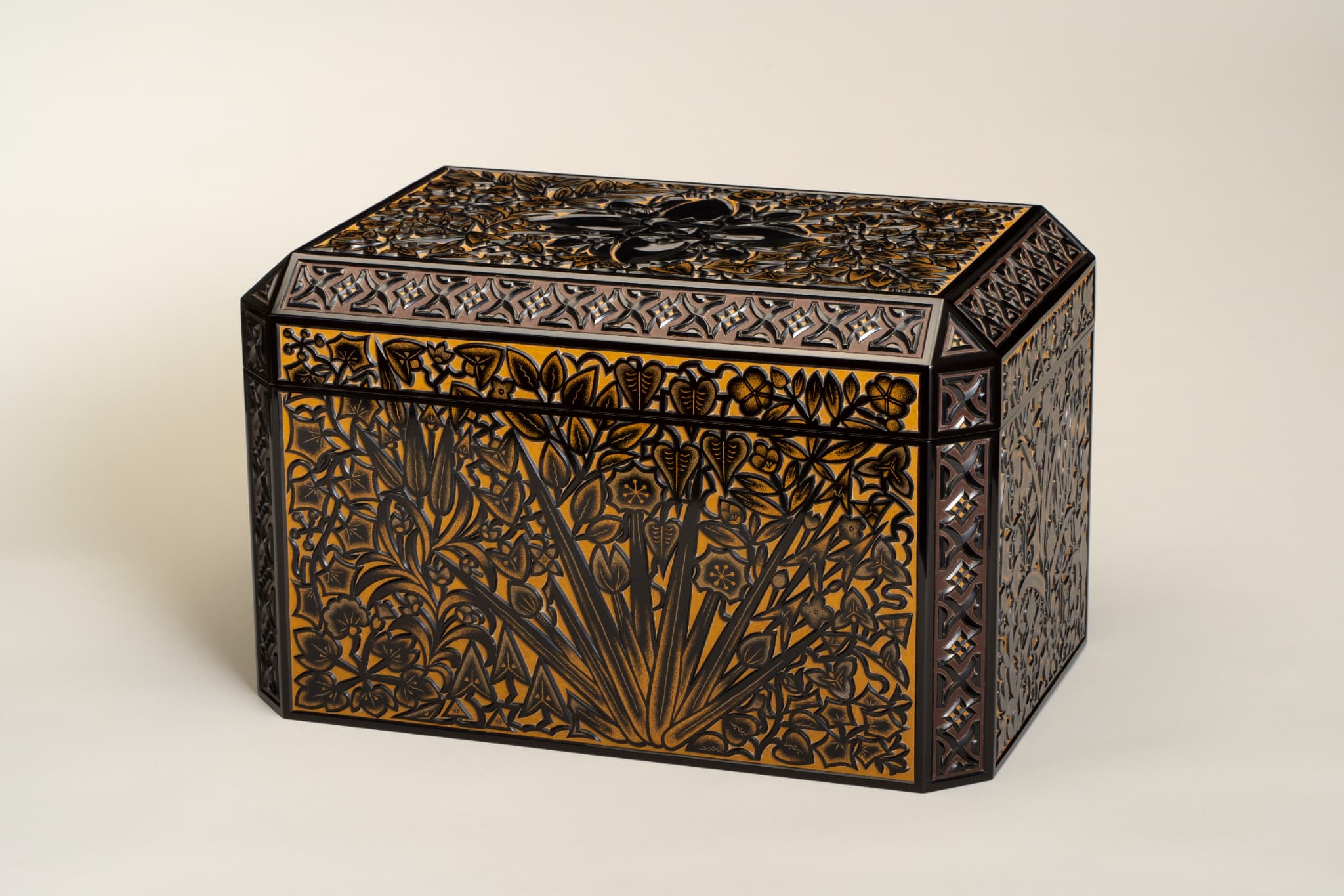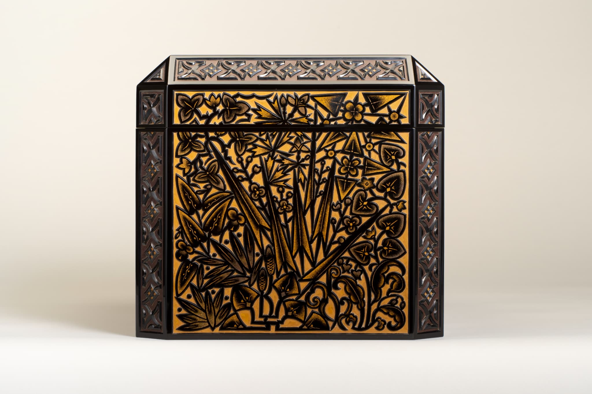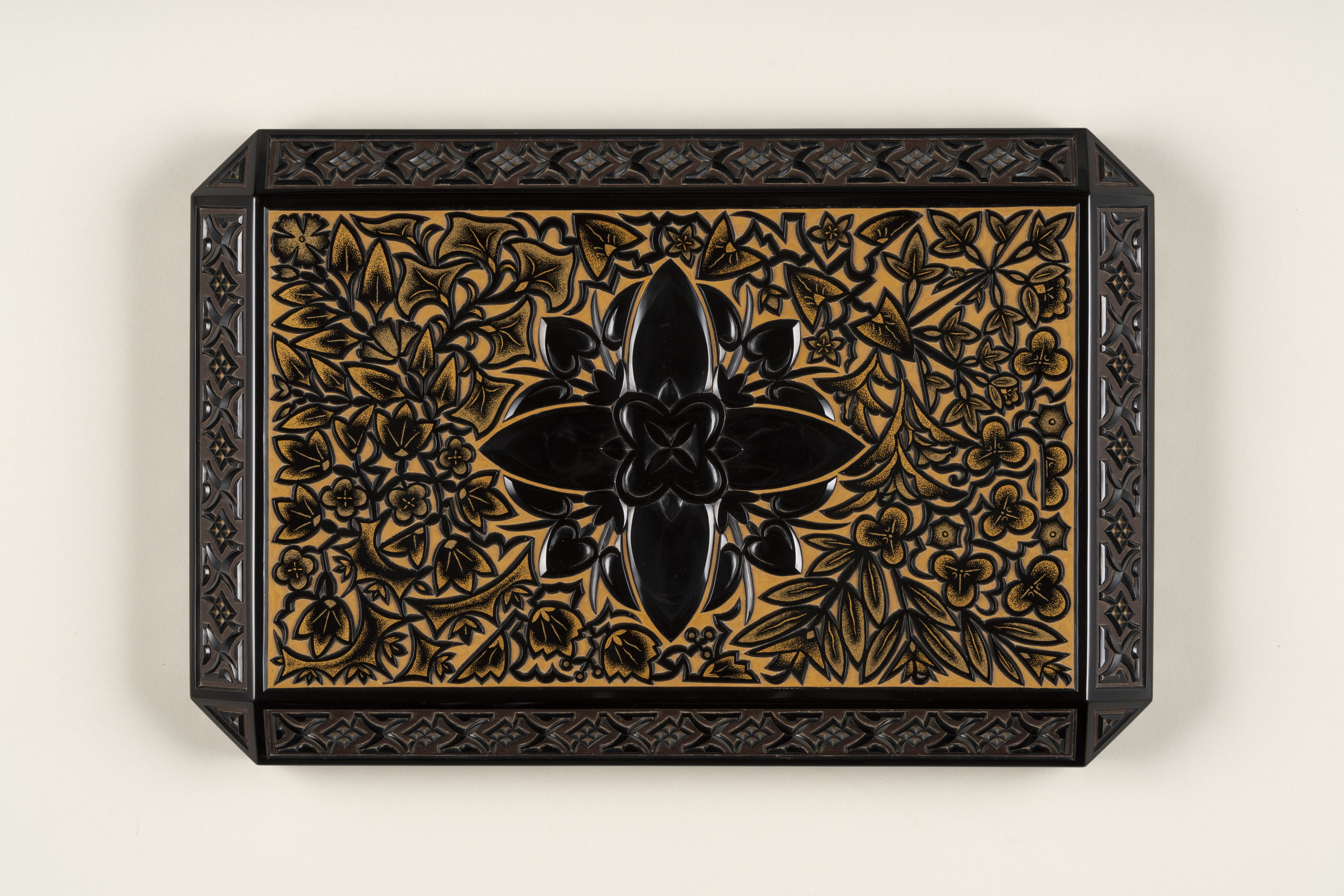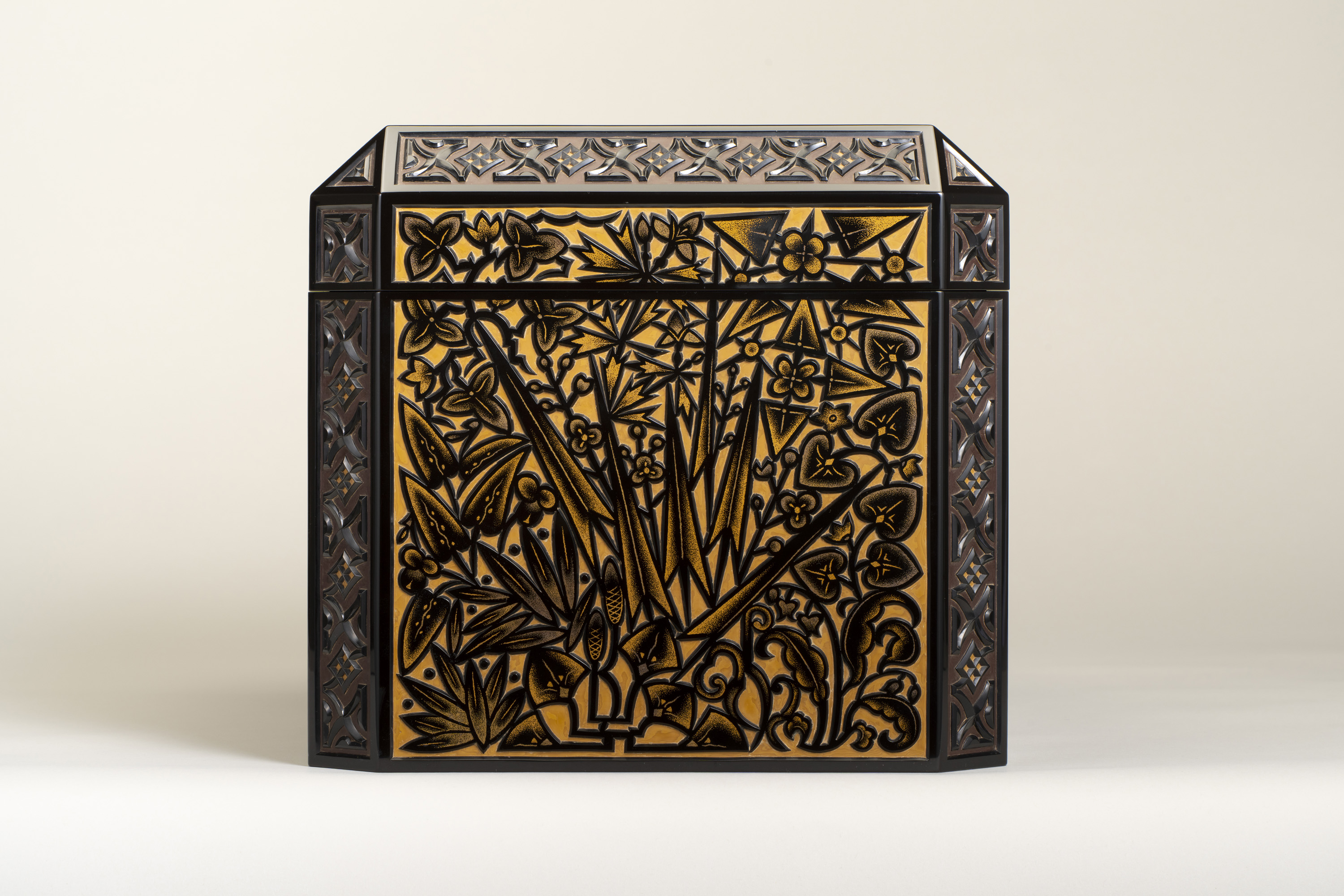 黒漆を塗り重ね、蓋表と身の側面に草花文、面取り部分に幾何学文を彫り出す。さらに花や葉には金の点彫り蒟醬(漆面に蒟醤剣で文様を彫り、色漆を埋め、表面を平らに研いで文様を表現する技法)で装飾を加える。草花文の単純化された意匠等に、構成主義やアール・デコの影響が見られる。