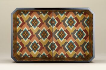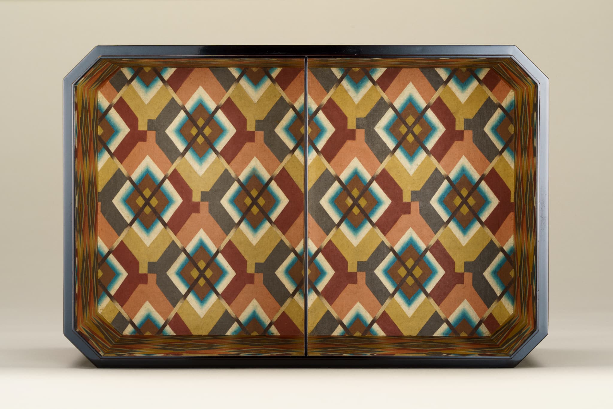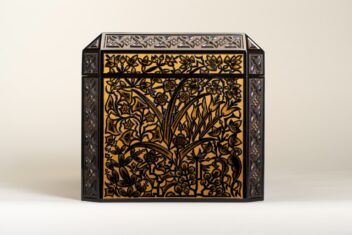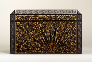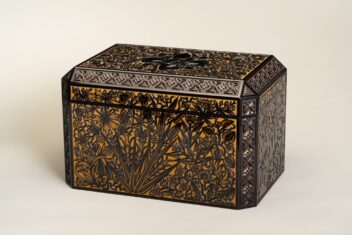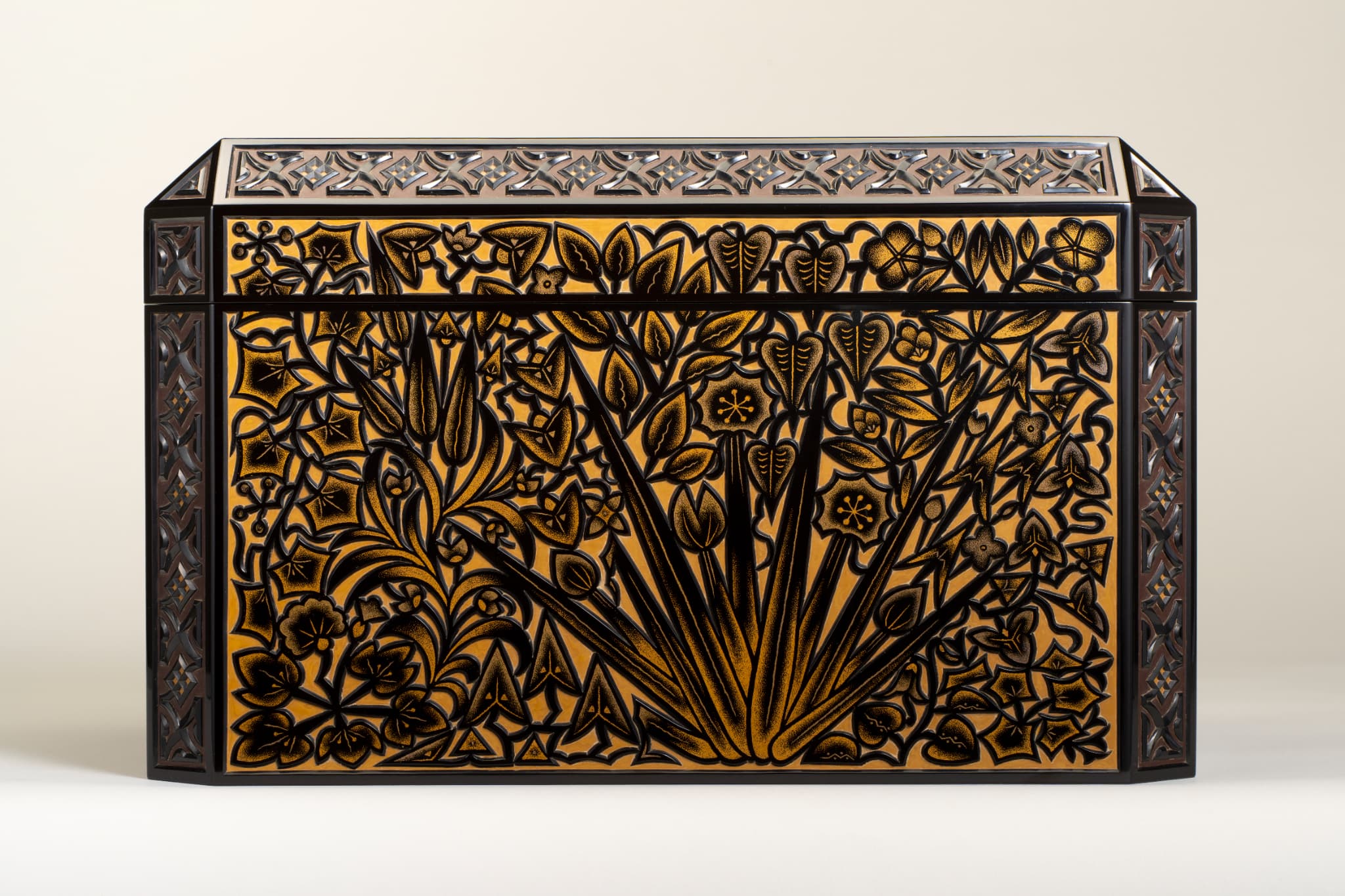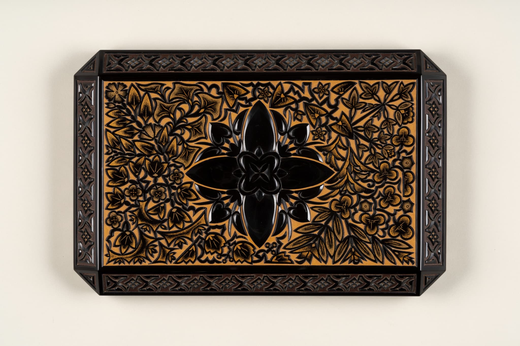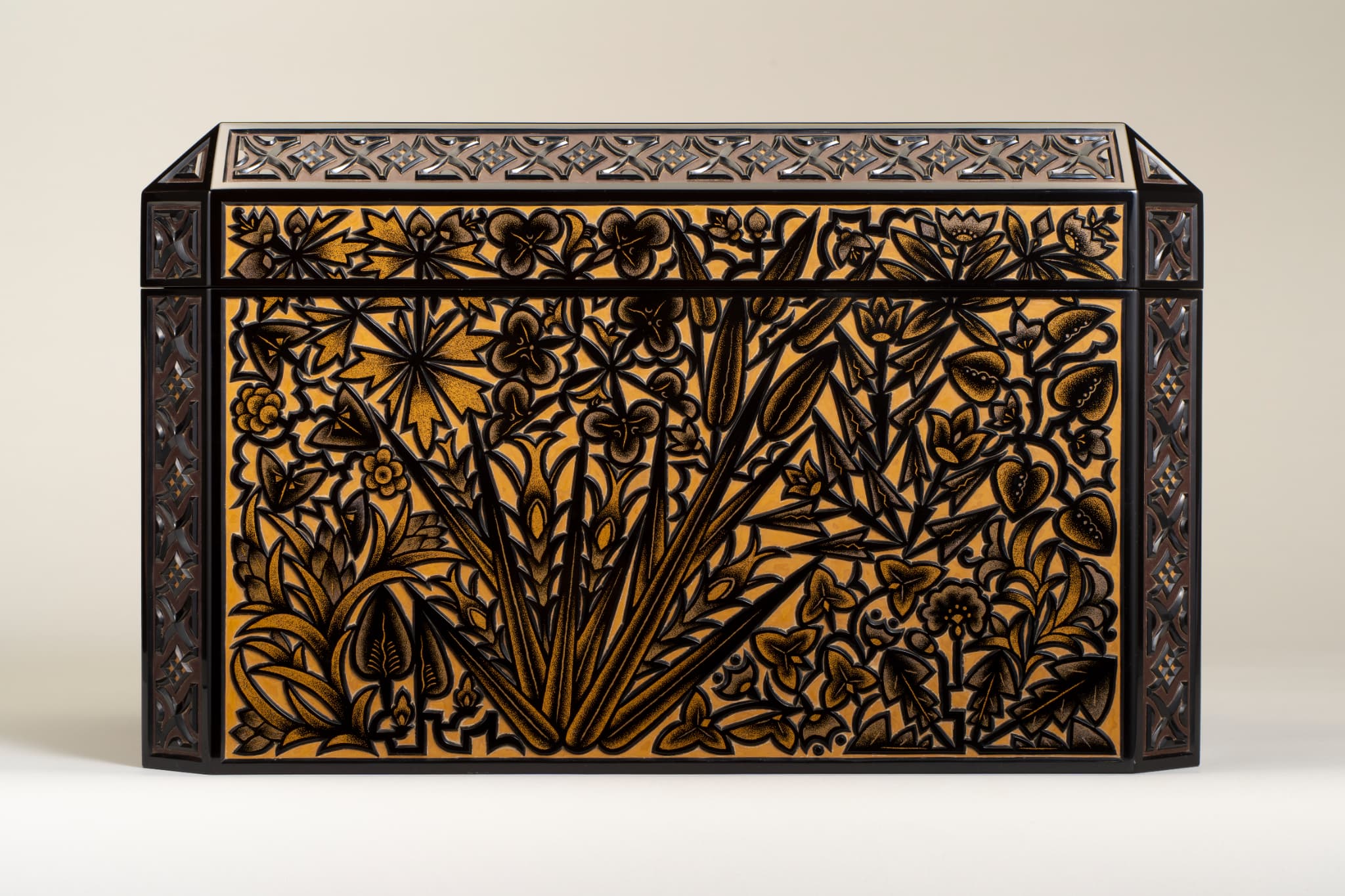 黒漆を塗り重ね、蓋表と身の側面に草花文、面取り部分に幾何学文を彫り出す。さらに花や葉には金の点彫り蒟醬(漆面に蒟醤剣で文様を彫り、色漆を埋め、表面を平らに研いで文様を表現する技法)で装飾を加える。草花文の単純化された意匠等に、構成主義やアール・デコの影響が見られる。