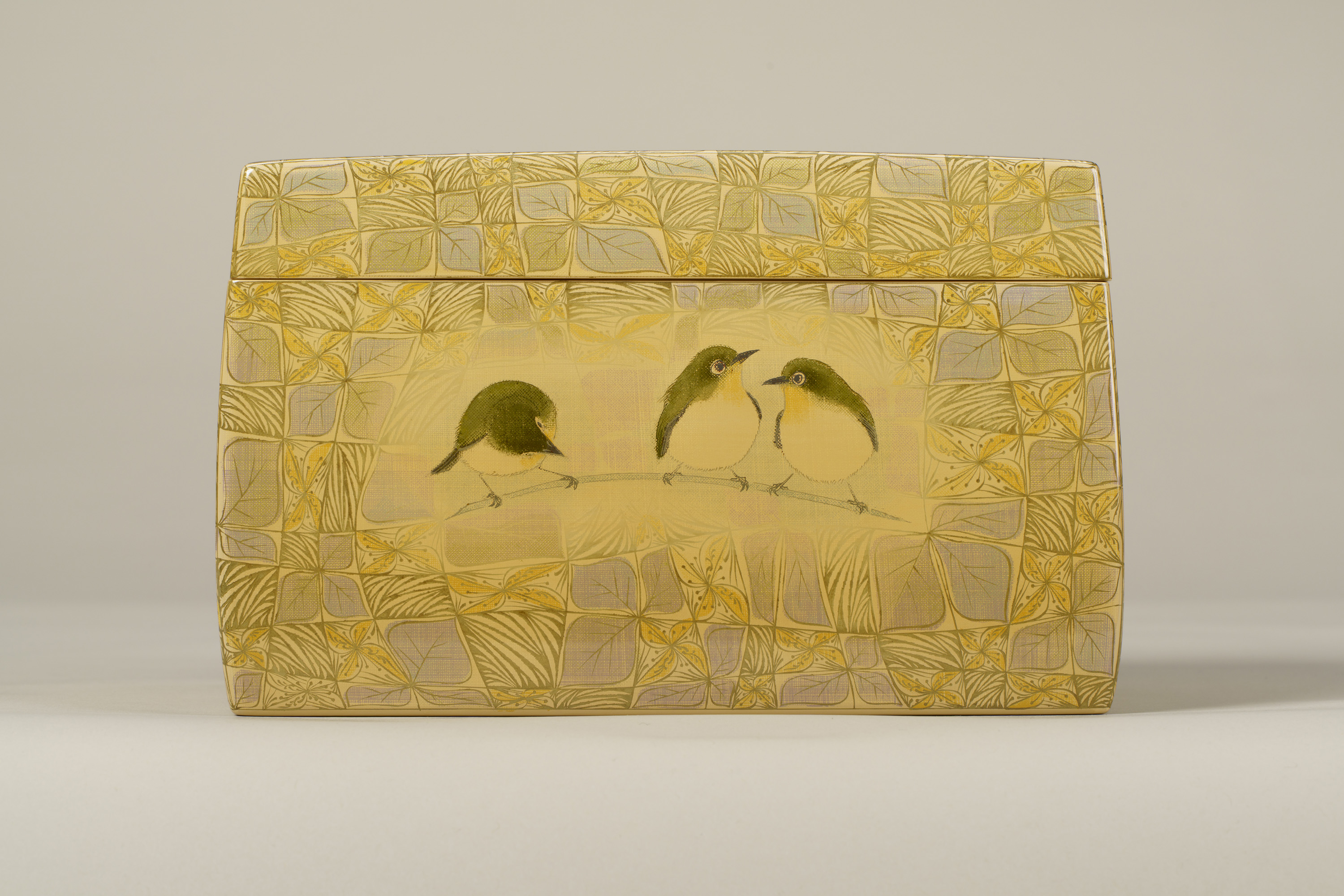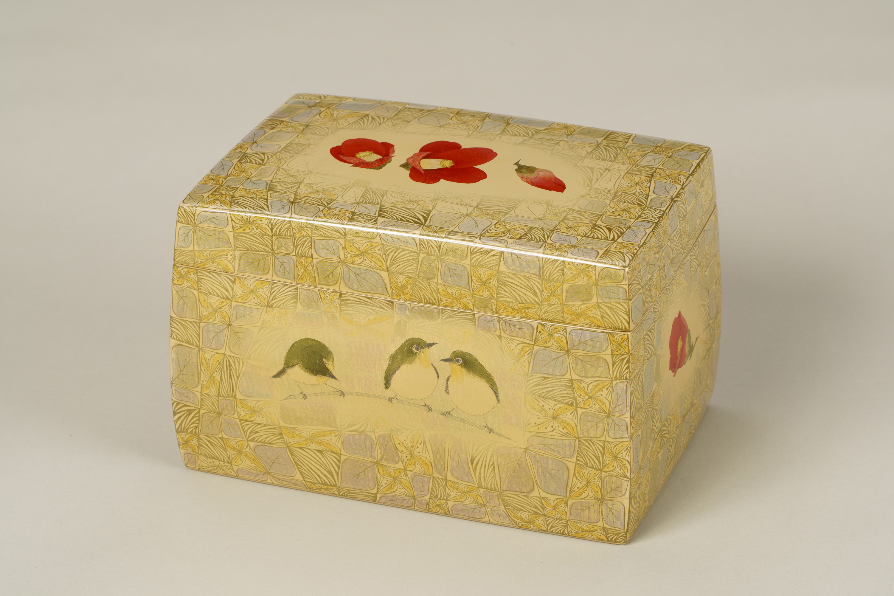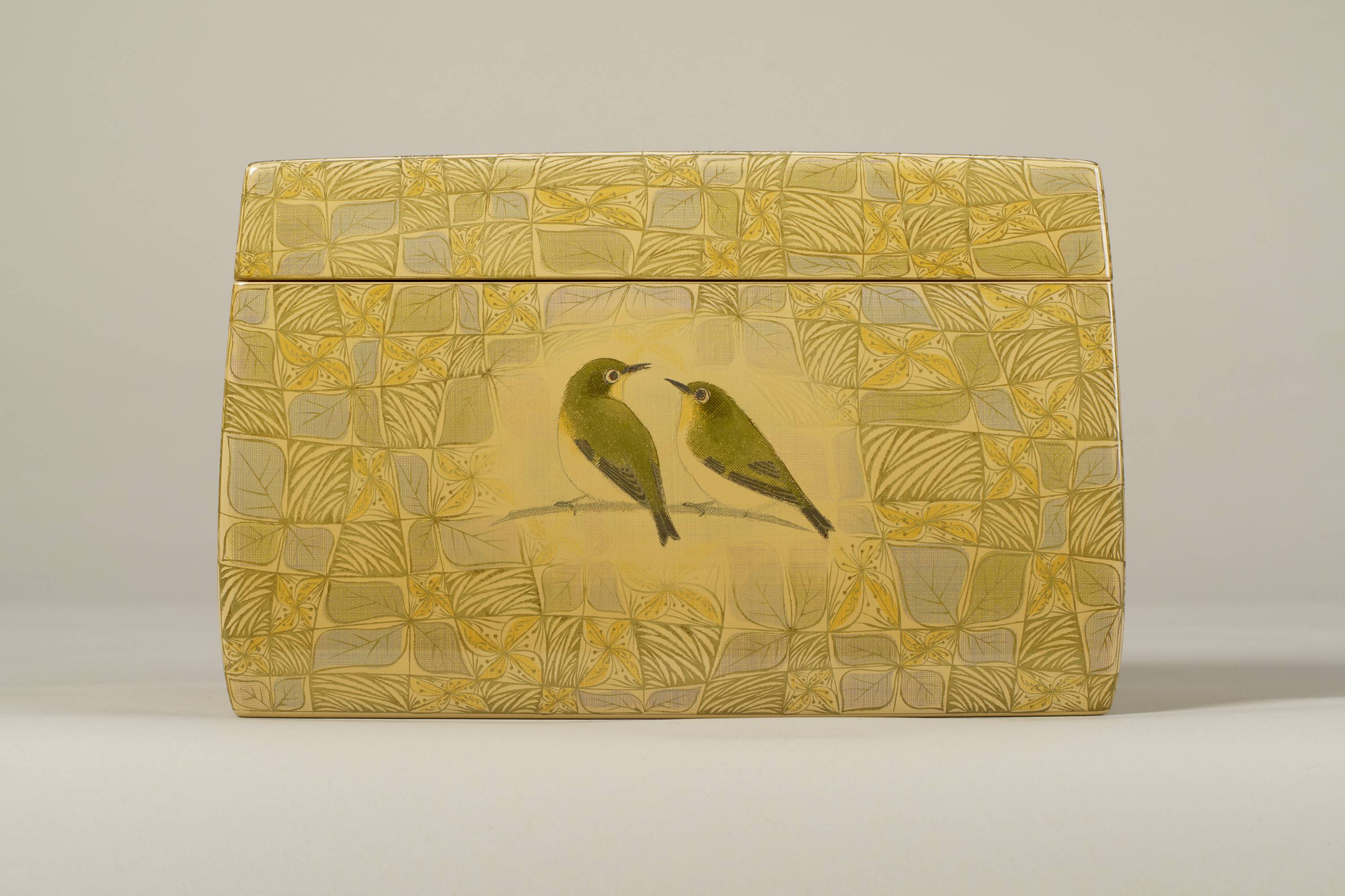 素地は、2mmの太さの竹ひごを編んだものを二重にして作った箱。蓋表には、作者が発案した布目彫蒟醬(ぬのめぼりきんま)でメジロを表現し、内側は籃胎の竹ひごで編んだ複雑な文様を見せる。竹の柔軟性によって中に入れた茶道具を保護することも考えられている。