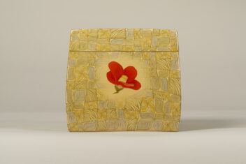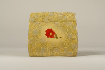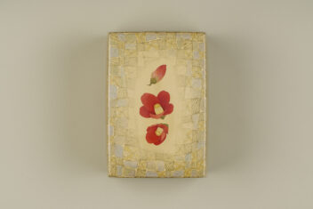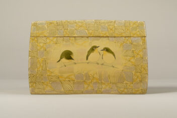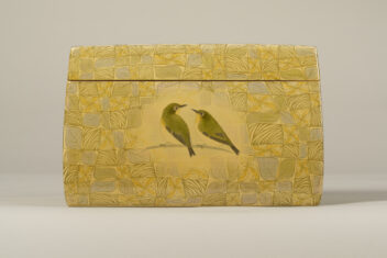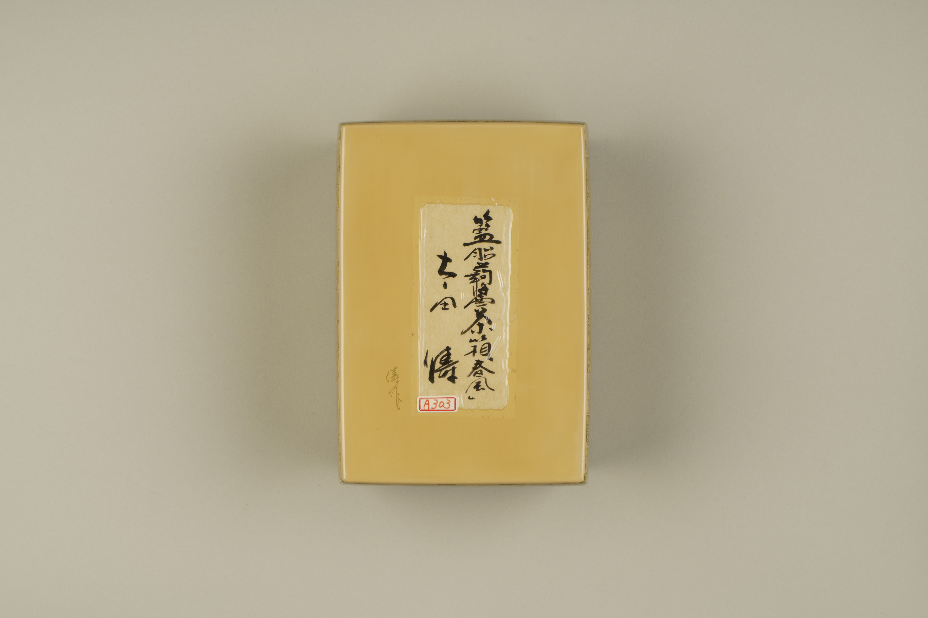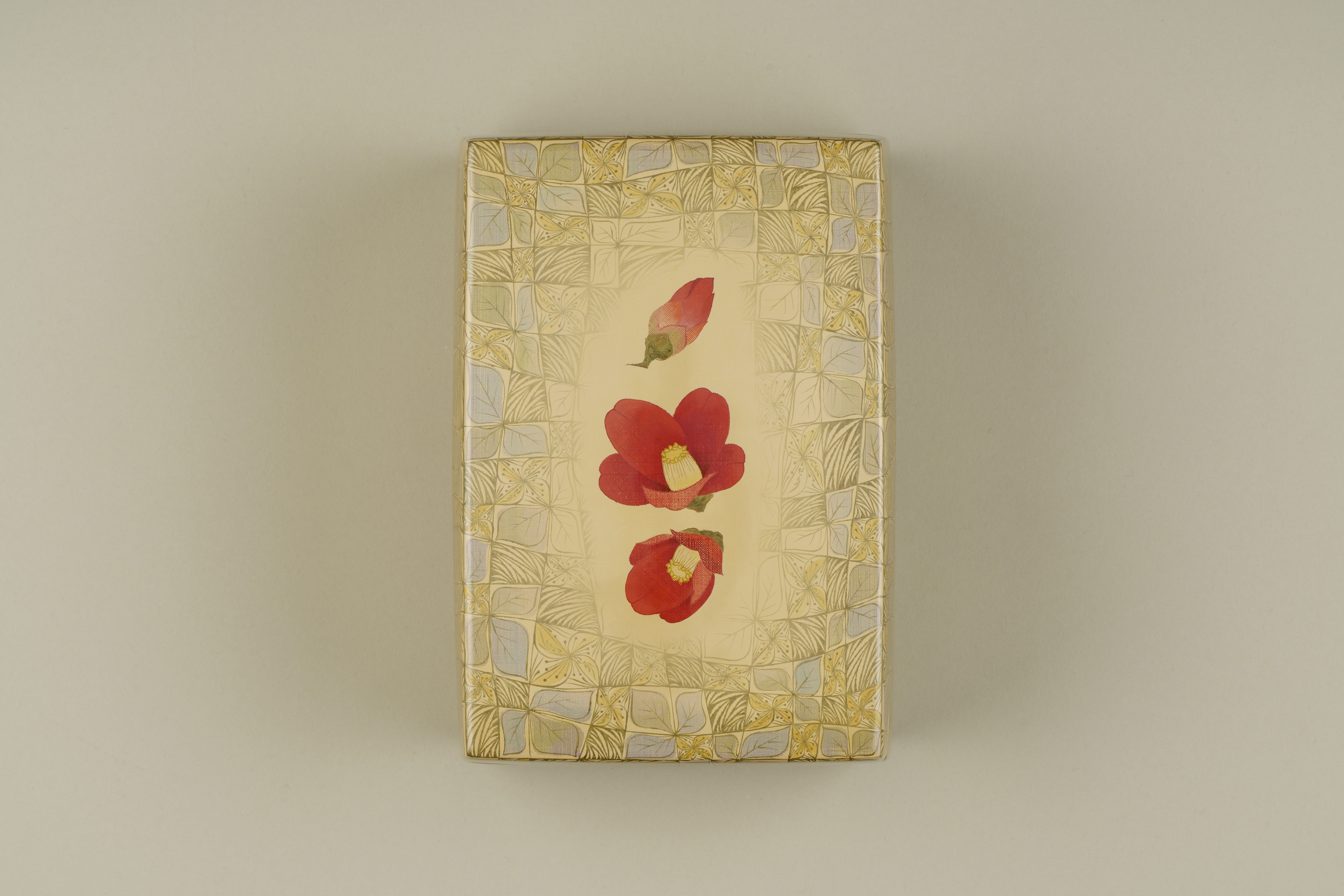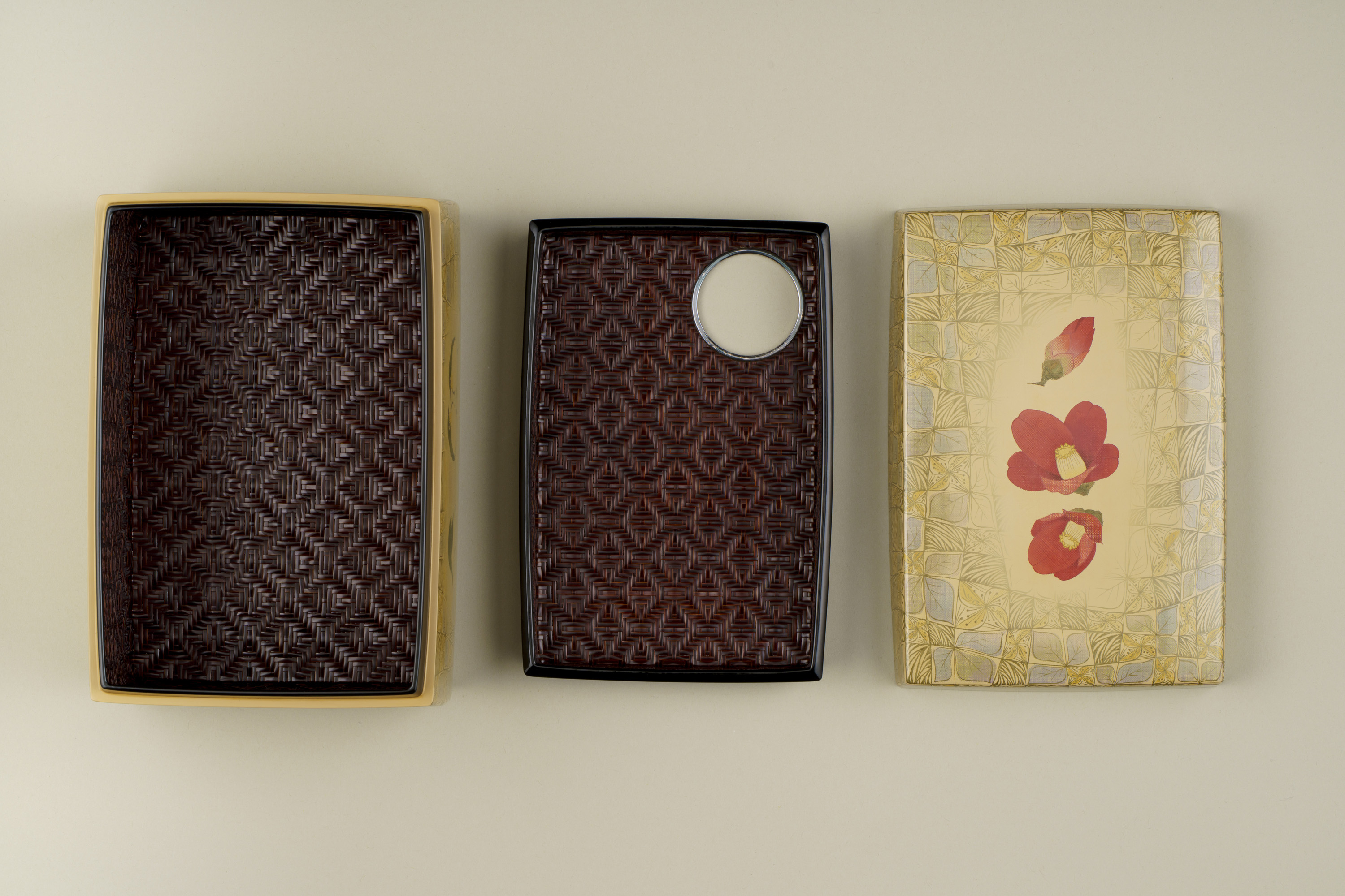 素地は、2mmの太さの竹ひごを編んだものを二重にして作った箱。蓋表には、作者が発案した布目彫蒟醬(ぬのめぼりきんま)でメジロを表現し、内側は籃胎の竹ひごで編んだ複雑な文様を見せる。竹の柔軟性によって中に入れた茶道具を保護することも考えられている。