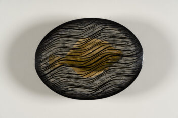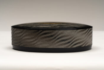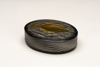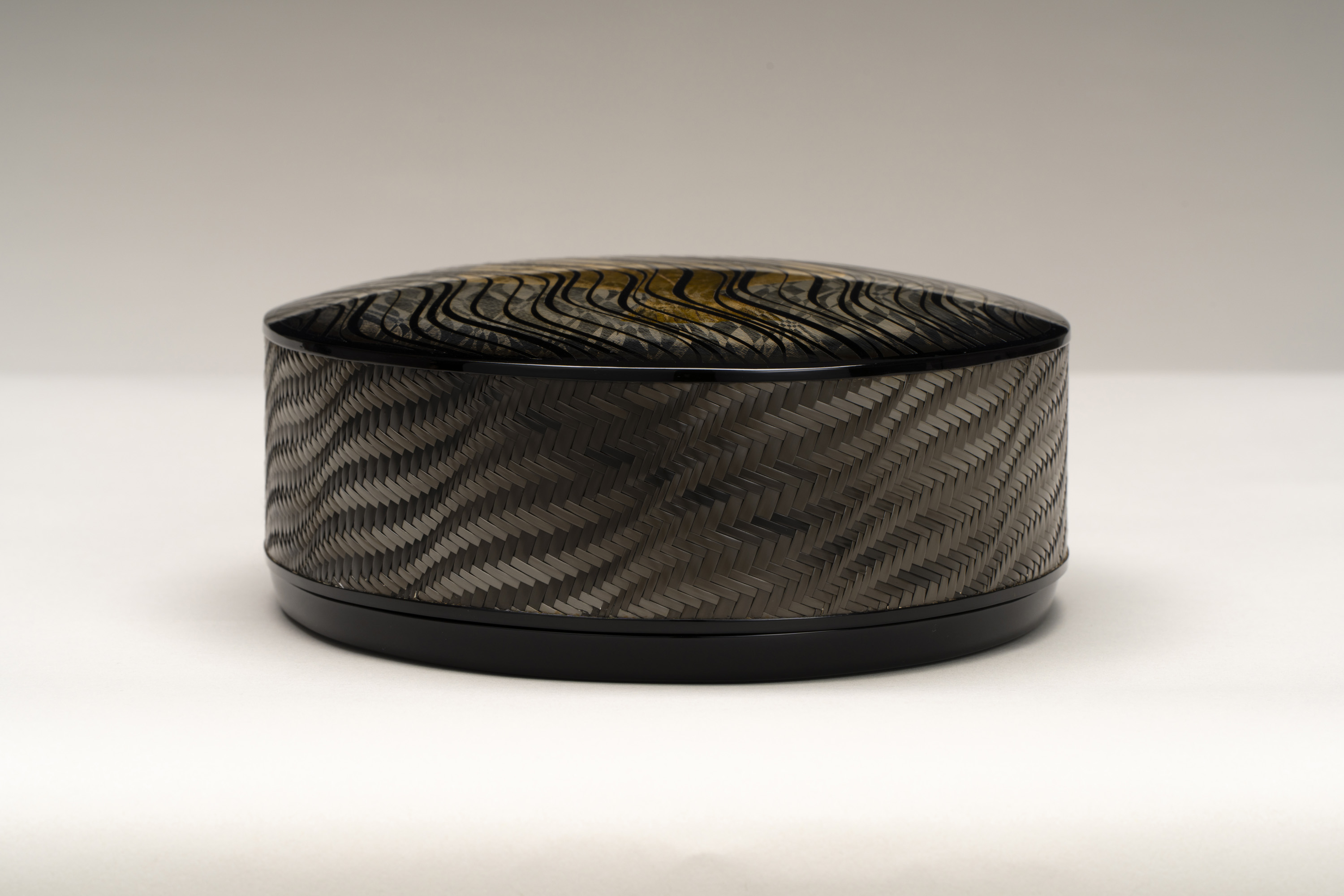 作者は高松市生まれ。香川県立高松工芸高等学校、香川県漆芸研究所で漆芸技法を学んだ後、蒟醬の太田 儔(おおた ひとし)に師事。竹ひごで編んだ素地に漆を塗り重ね、蒟醬で文様をあらわす籃胎蒟醬の技法を学ぶ。令和2年(2020)重要無形文化財「蒟醬」保持者認定。