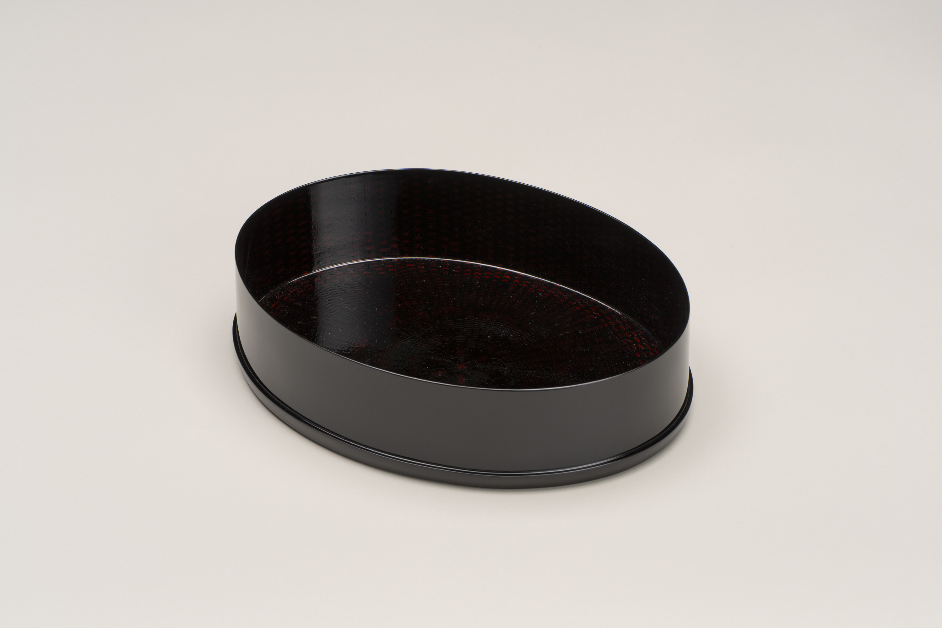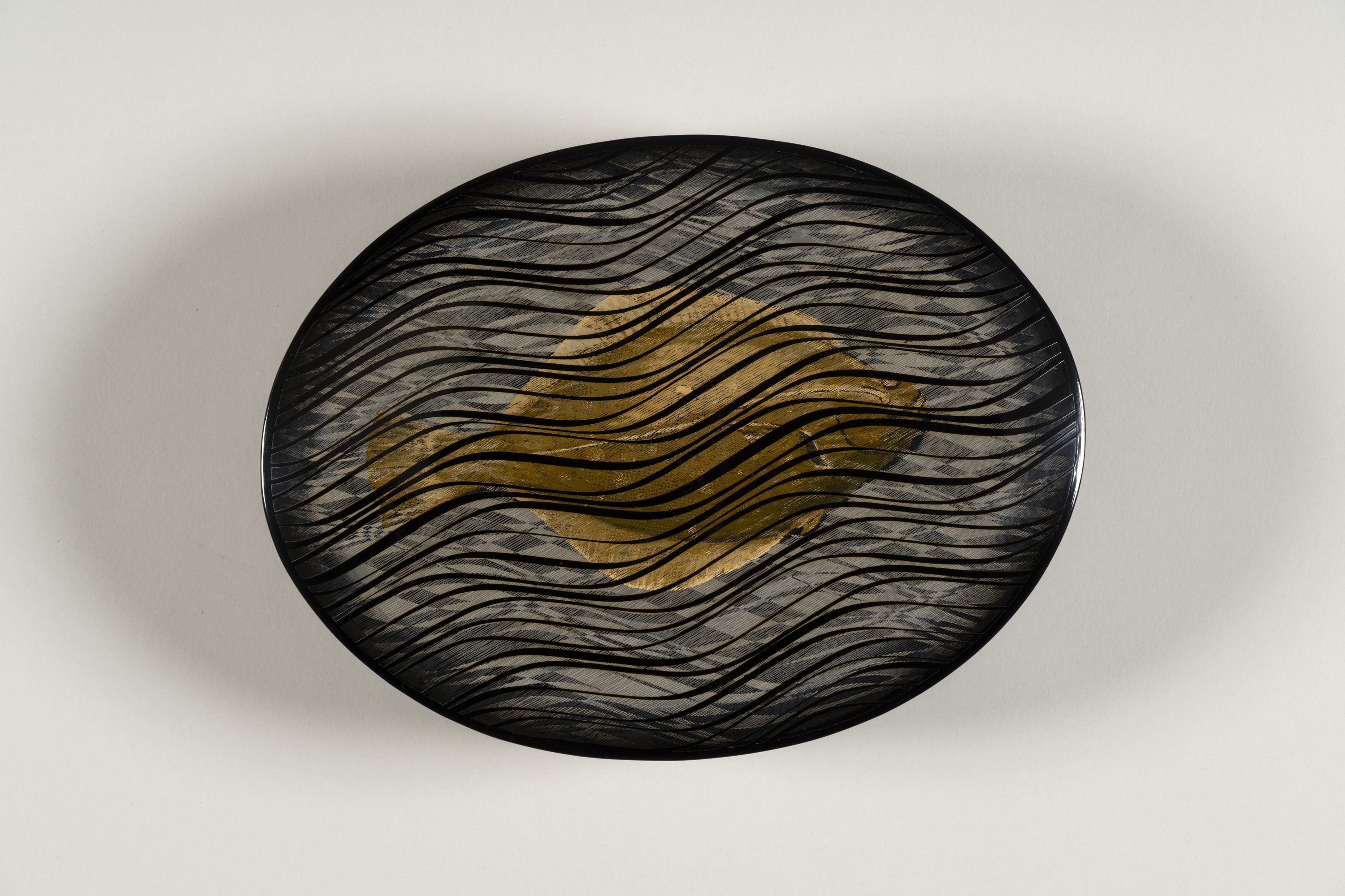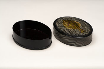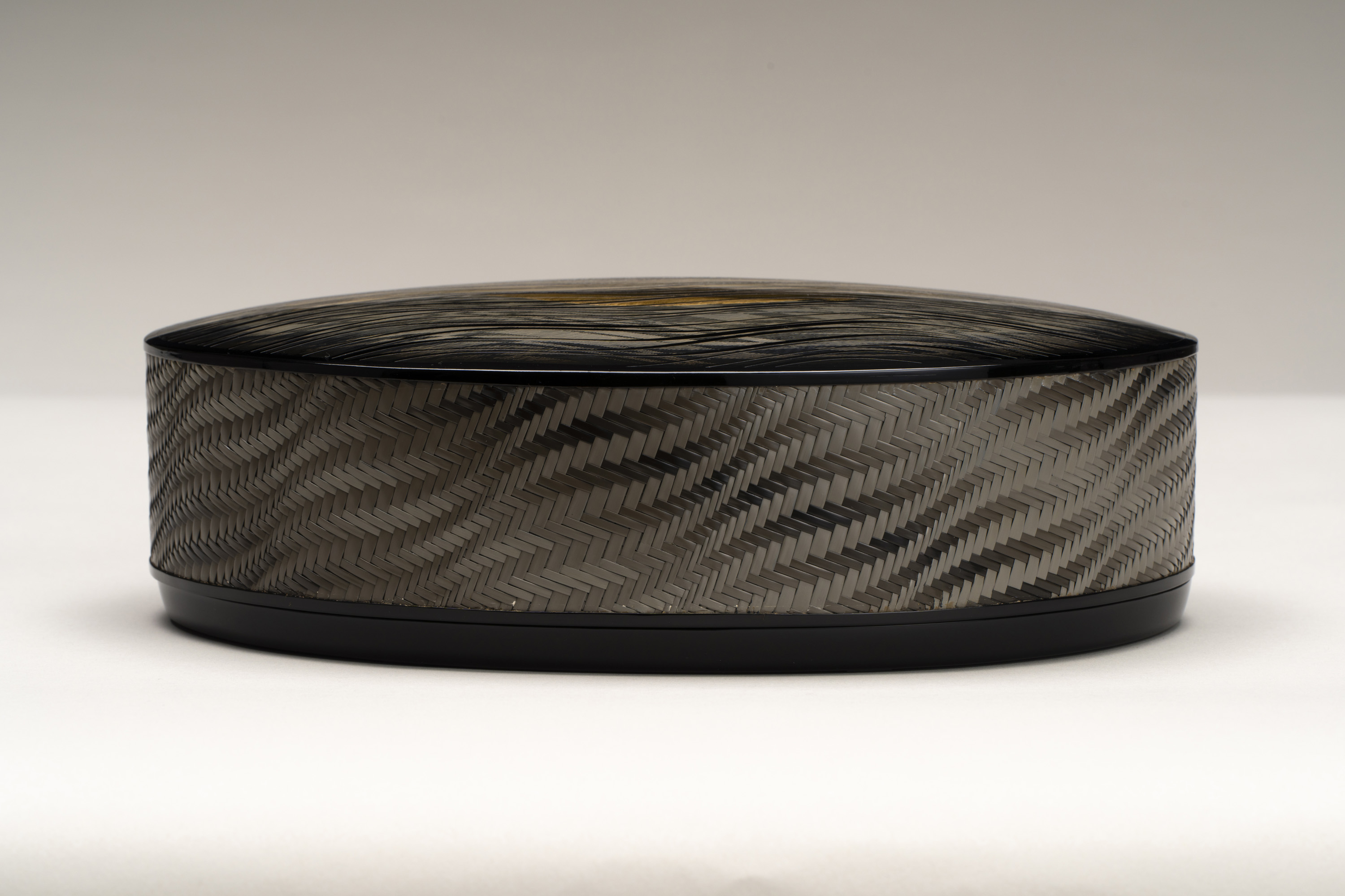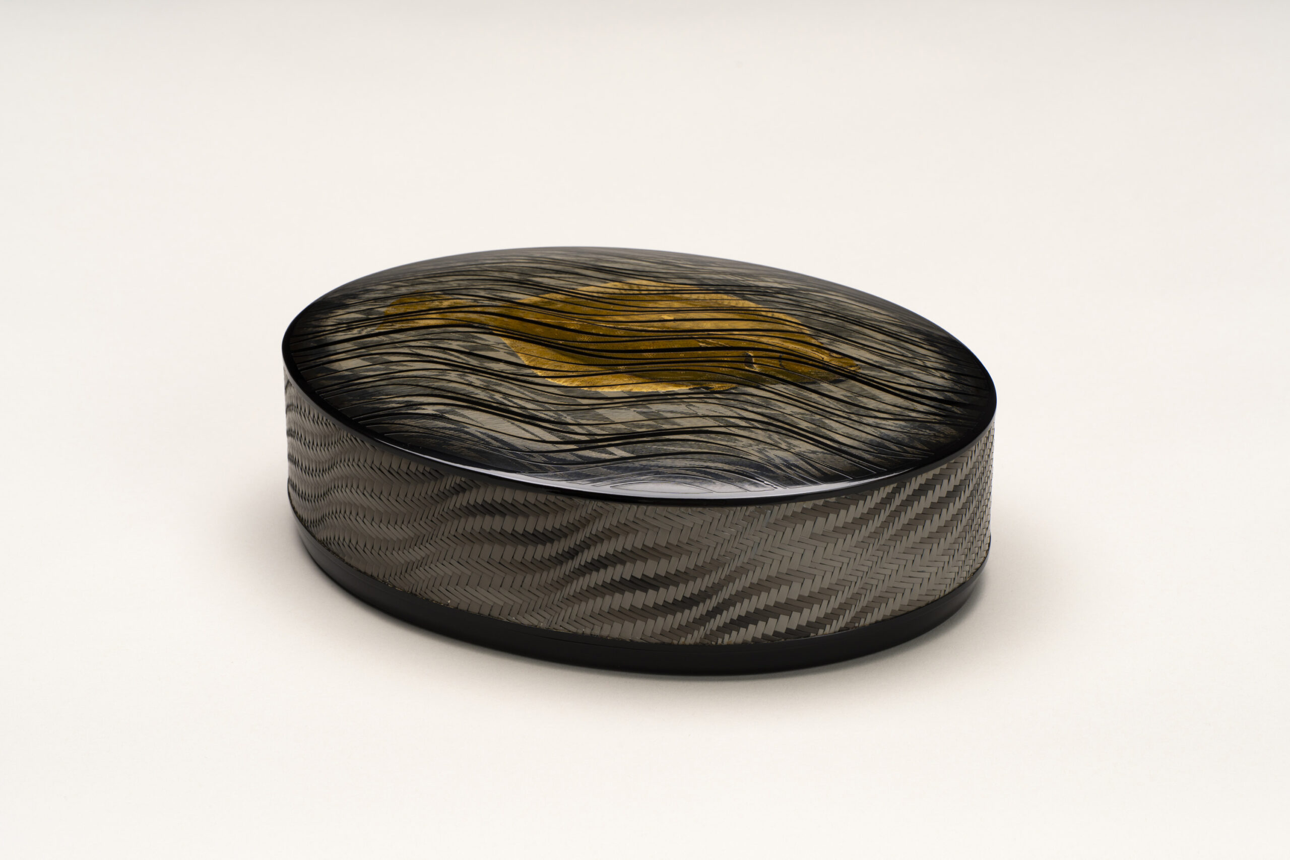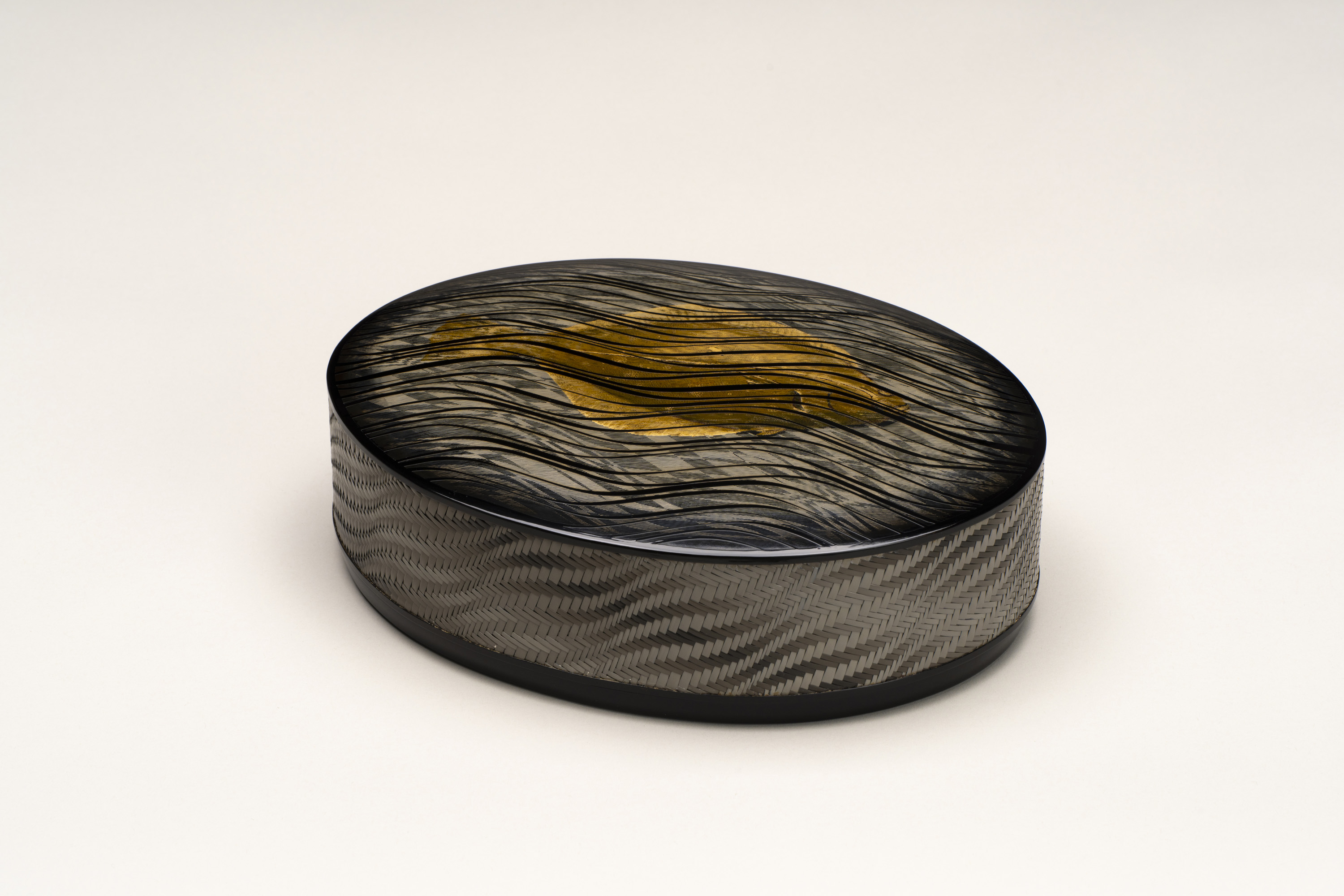 籃胎蒟醬網代編飾箱 らんたい きんま あじろあみ かざりばこ 作者 大谷 早人(おおたに はやと、1954-) 時代 平成6年(1994) 品質・員数 漆 1合 法量(cm) 縦27.5 横21.0 高8.0 分類 工芸 収蔵番号 BK1#01449 もっと見る もっと見る 解説 蓋表には蒟醬(きんま)技法によって、水中で泳ぐカレイが描かれる。側面には紫色のグラデーションとなるように竹ひごで波の文様が編まれ、蓋表の波と合わせたダブルイメージでカレイが漂う波間の情景が、箱全体に表現されている。作者は高松市生まれ。香川県立高松工芸高等学校、香川県漆芸研究所で漆芸技法を学んだ後、蒟醬の太田 儔(おおた ひとし)に師事。竹ひごで編んだ素地に漆を塗り重ね、蒟醬で文様をあらわす籃胎蒟醬の技法を学ぶ。令和2年(2020)重要無形文化財「蒟醬」保持者認定。籃胎の編目を表現として生かしつつ、蒟醬で編目に呼応した模様の展開や、竹ひごと同じ色調の漆を用いた色埋めを行う等、籃胎と蒟醬を調和させた作品で、新たな世界を切り拓いている。 関連作品 堆朱鼓箱 源内焼 三春駒香炉 青貝微塵塗鞘および大小拵 太刀 銘 真守造 作品をさがす リセット キーワード検索 分類 すべて 絵画(国内) 絵画(国外) 彫刻 工芸 書 デザイン 民俗資料 その他 指定区分 すべて 国宝 重要文化財 重要美術品 県指定 市町指定 検索