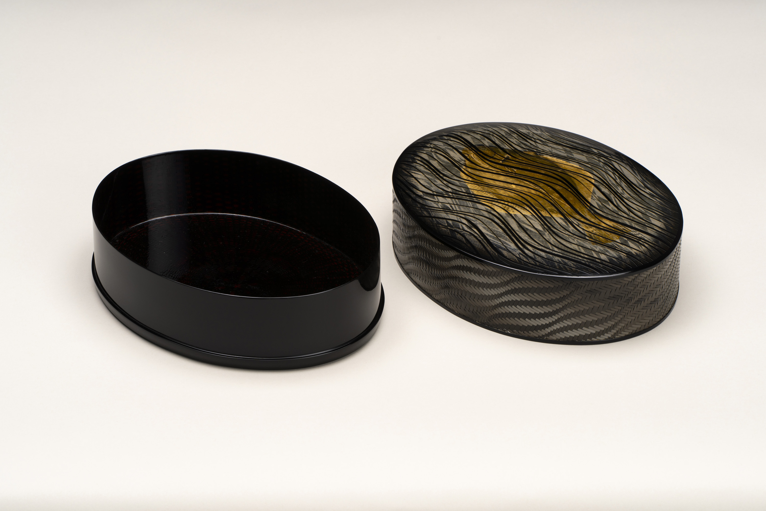蓋表には蒟醬(きんま)技法によって、水中で泳ぐカレイが描かれる。側面には紫色のグラデーションとなるように竹ひごで波の文様が編まれ、蓋表の波と合わせたダブルイメージでカレイが漂う波間の情景が、箱全体に表現されている。
