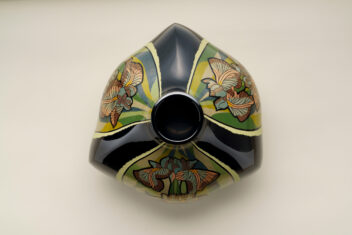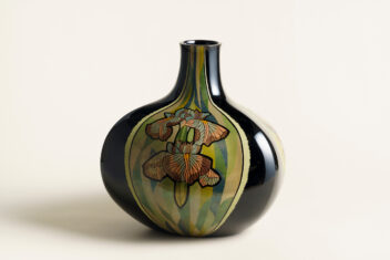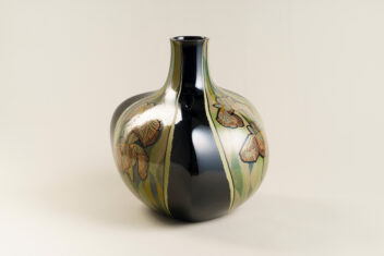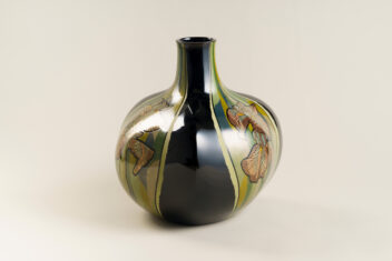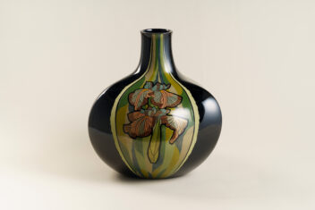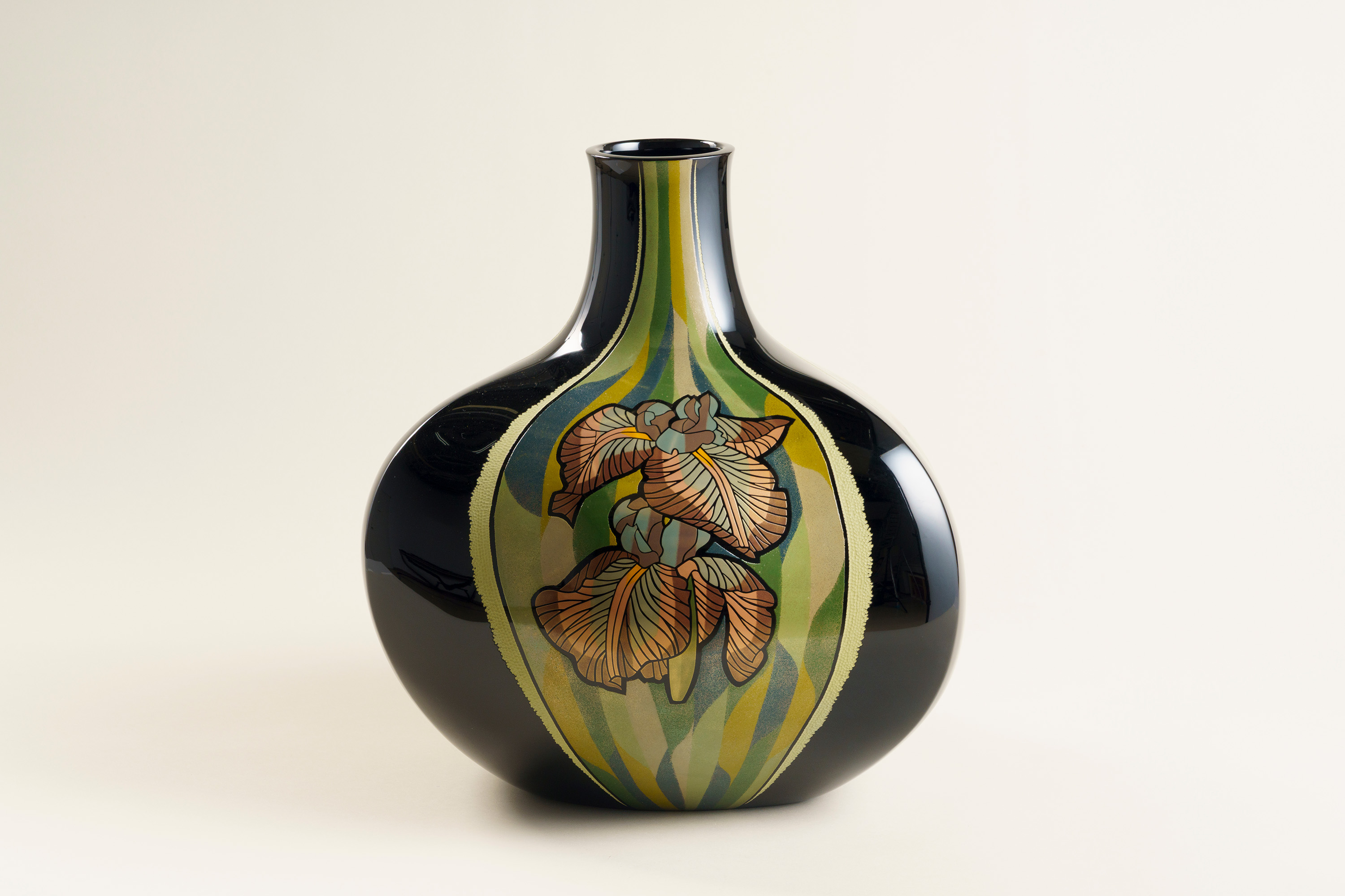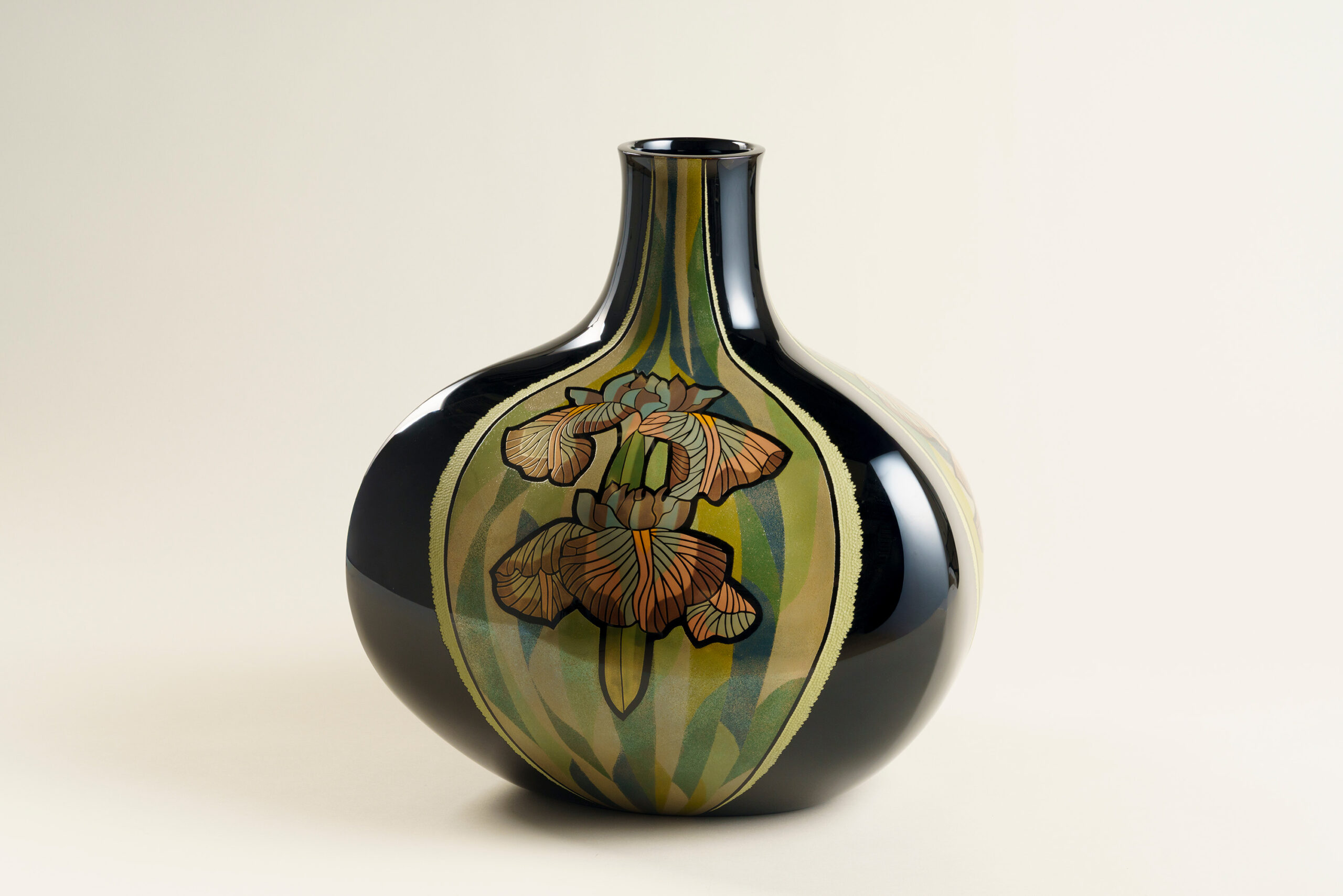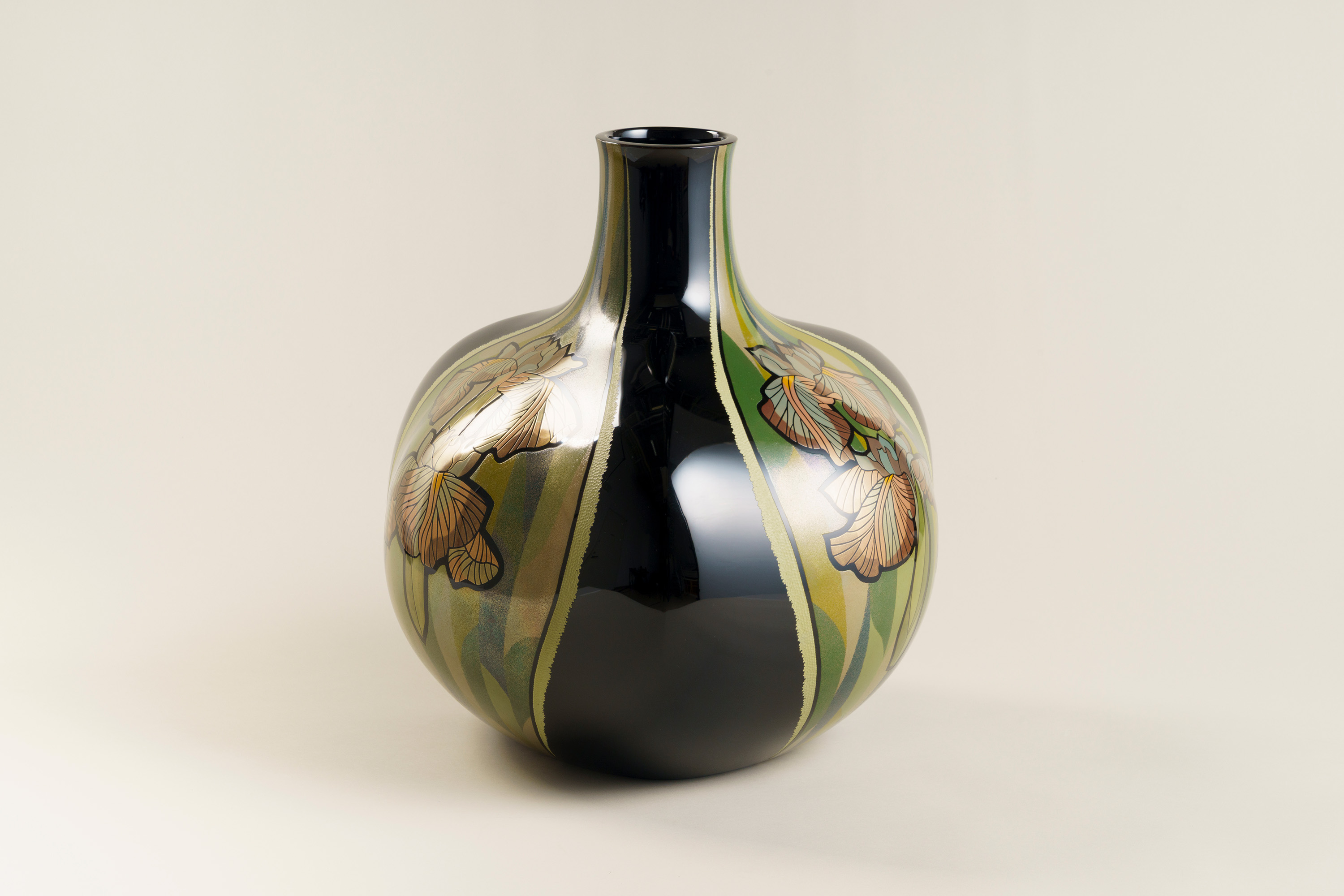 花菖蒲の意匠で装飾した、ニンニクのような姿の壺。柔らかな曲線の造形を表すのに、漆と麻布で型取りして形づくりをする乾漆(かんしつ)の技法を用いる。つややかな黒漆に彫刻刀で小気味よく素彫りし、つやと荒彫りによって漆の質感の違いを対照的に見せる。花菖蒲は、模様の輪郭を線刻してモチーフの立体感を表す香川の漆芸技法のひとつである存清(ぞんせい)によって表現される。