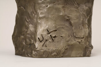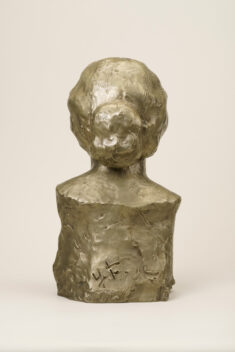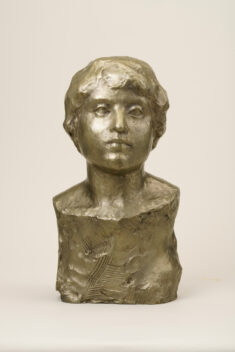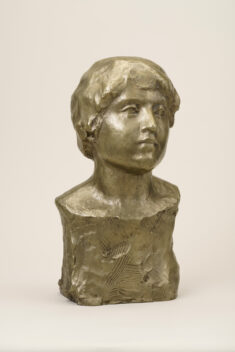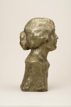 温かさをたたえた眼差しと気品があふれる女性の頭像。フランス留学時の制作で、帰国後も石膏のまま愛蔵していたという。近代彫刻の父、ロダンを敬愛し、その制作を傍らで学びつつも、作者の作品にはロダンのような情動的な激しさはなく、穏やかな肉付けで、安定的な重さが感じられる温厚な作風である。本作は白銅の作品で、没後35年となる昭和45年(1970)に鋳造された。
