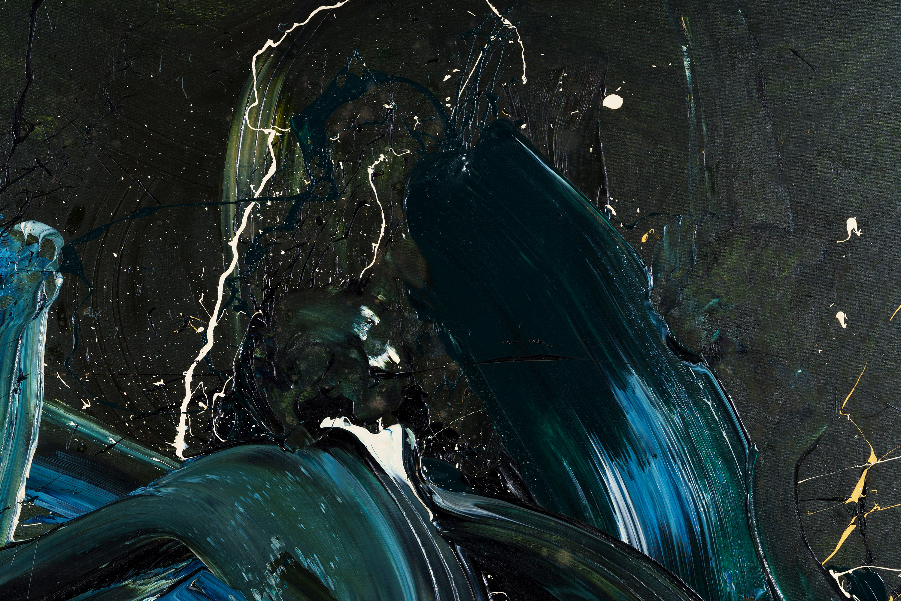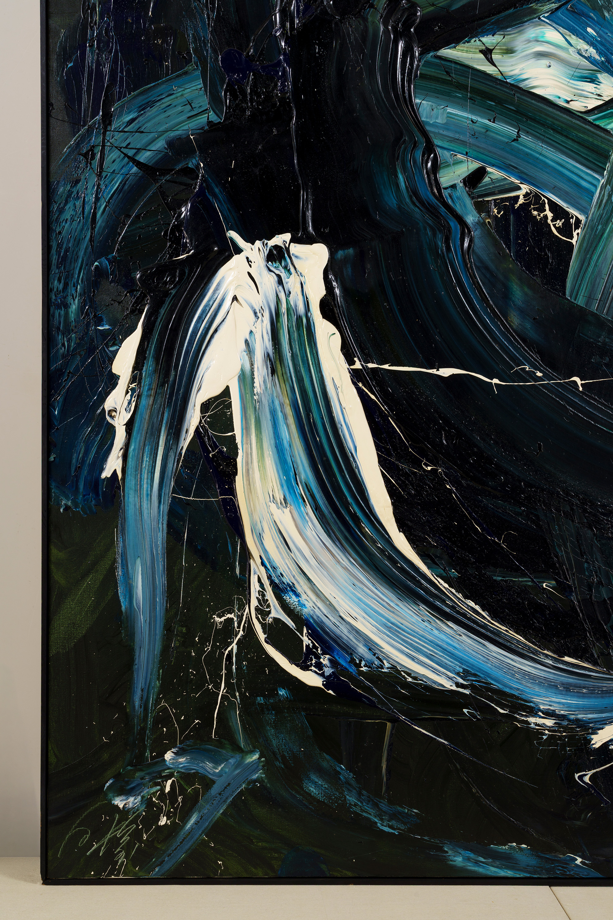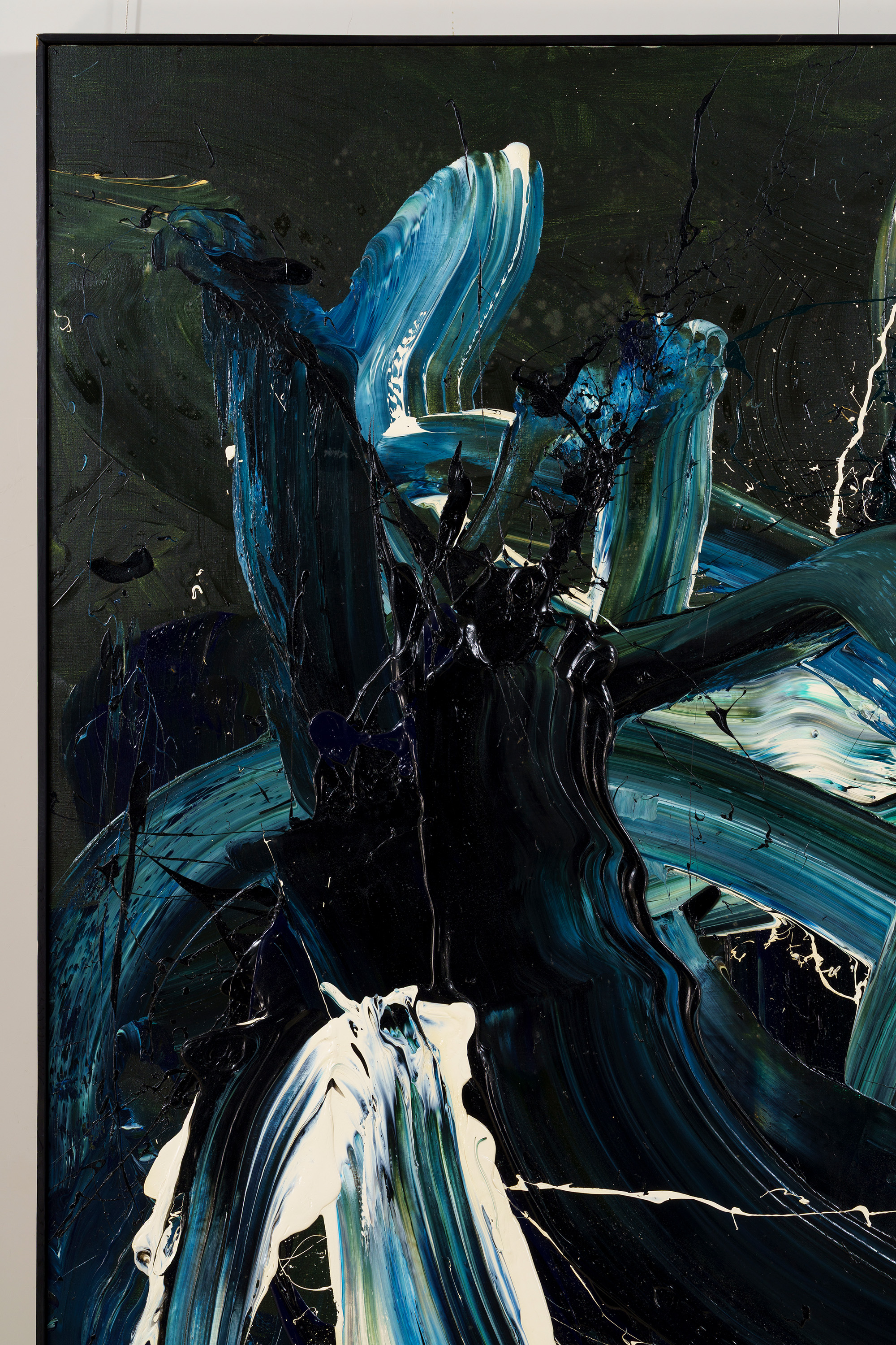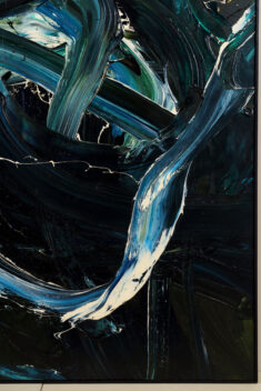 深い紺地に同じ紺や白の絵の具が、円を描くように混ざり合っている。甘露軍荼利は密教における五大明王の一尊であり、また甘露とはインド神話では不死の霊薬で、神々の力を集めて大海を攪拌することによって作り出されるという。床にキャンバス(麻布)を広げ、そこに足で描いた作品である。大きく全身を動かすことで、激しくうねった動きのある画面を生み出している。