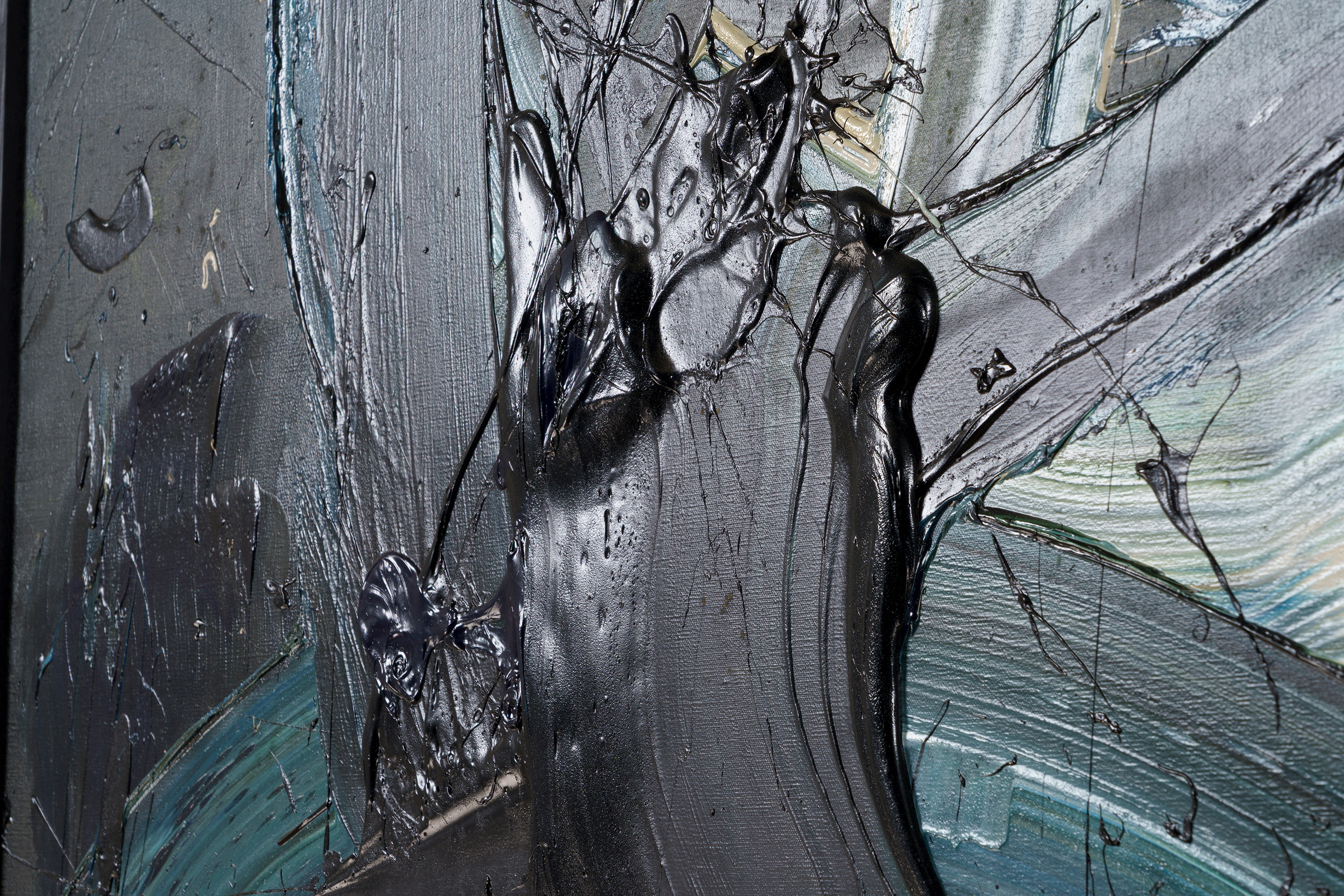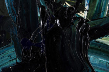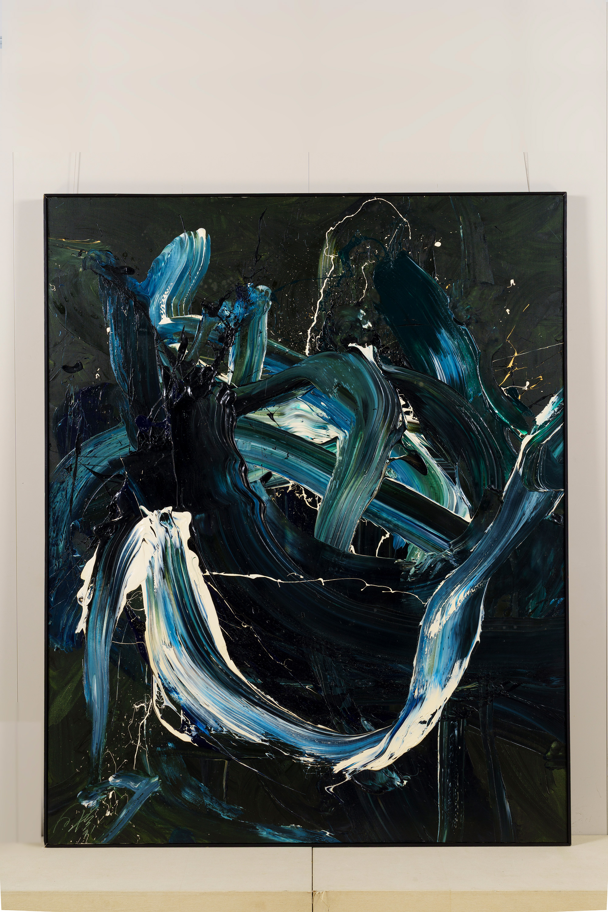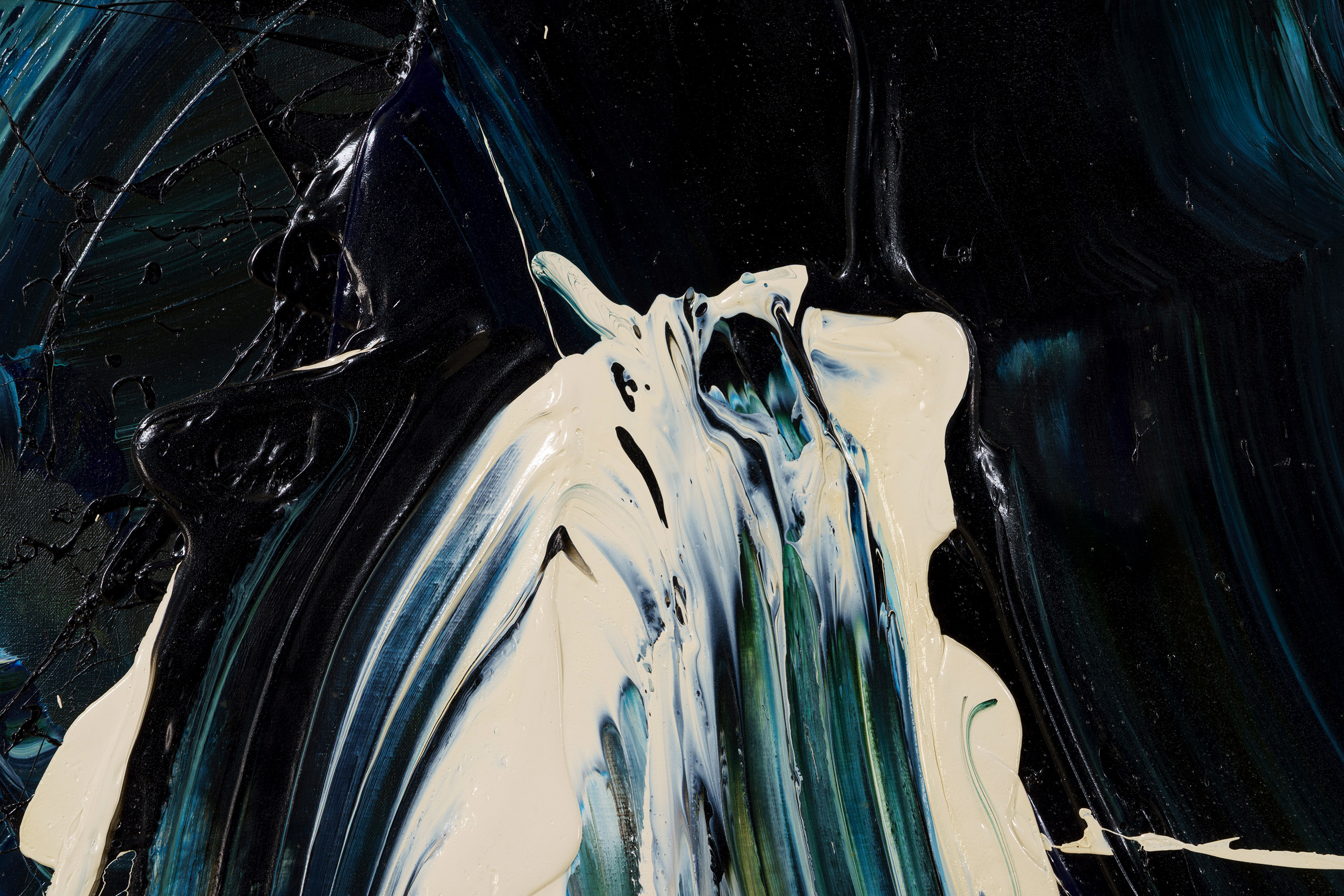 深い紺地に同じ紺や白の絵の具が、円を描くように混ざり合っている。甘露軍荼利は密教における五大明王の一尊であり、また甘露とはインド神話では不死の霊薬で、神々の力を集めて大海を攪拌することによって作り出されるという。床にキャンバス(麻布)を広げ、そこに足で描いた作品である。大きく全身を動かすことで、激しくうねった動きのある画面を生み出している。