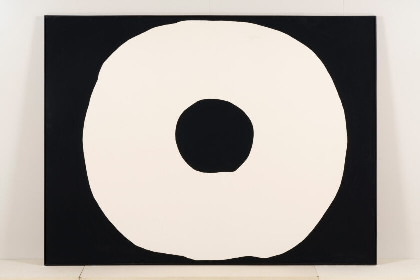 一見すると、黒地に白の絵の具をのせたように見えるが、実際には白い下地を残したうえで黒の油絵具を重ねて描いている。このように、絵画を見る者が想像する描き方と実際の描き方を異なるものにすることで、見る者に「描く」ことを問いかけている。