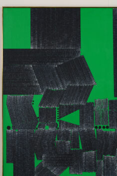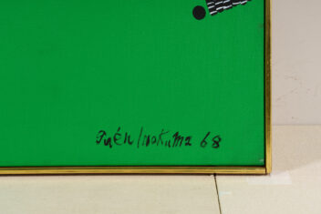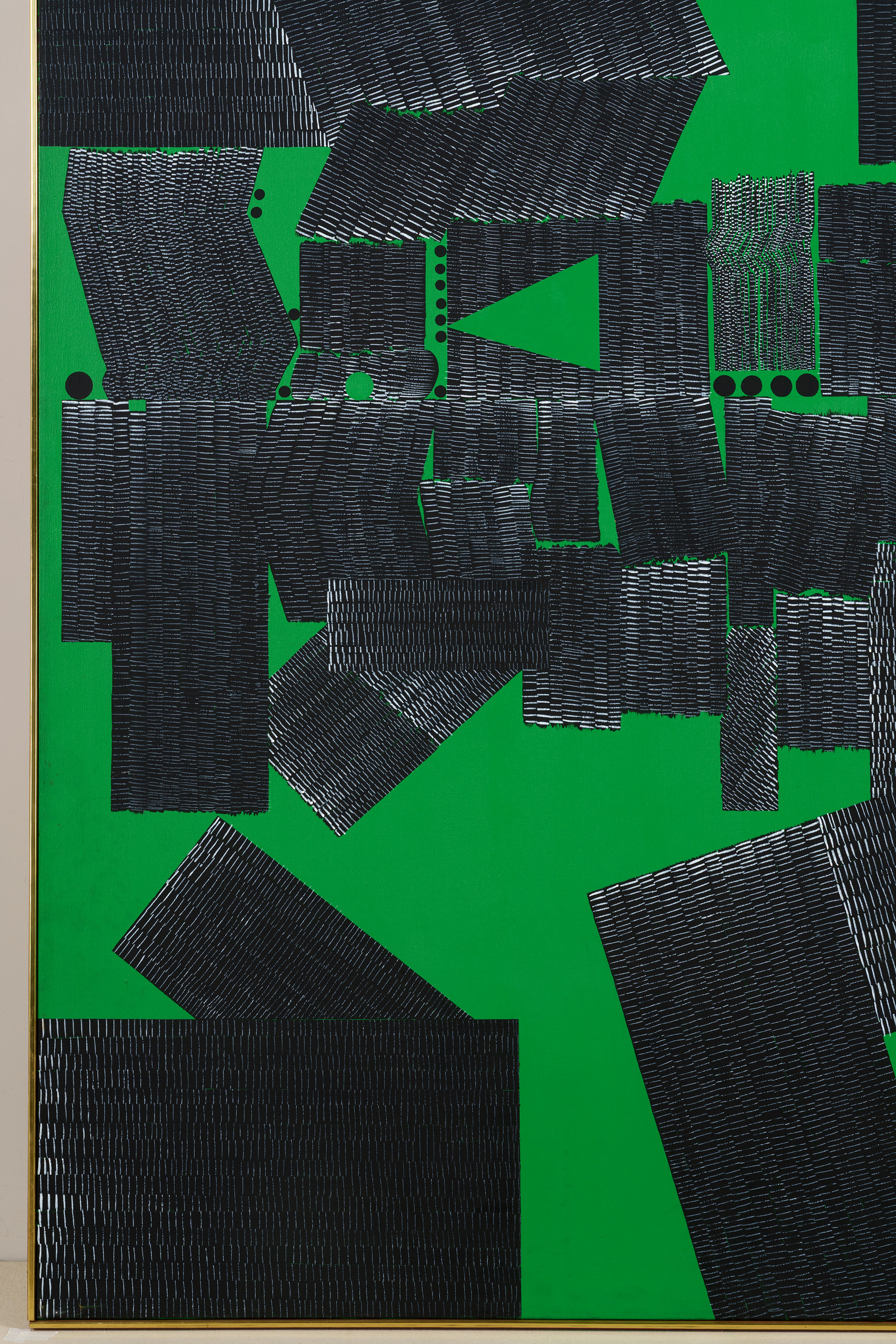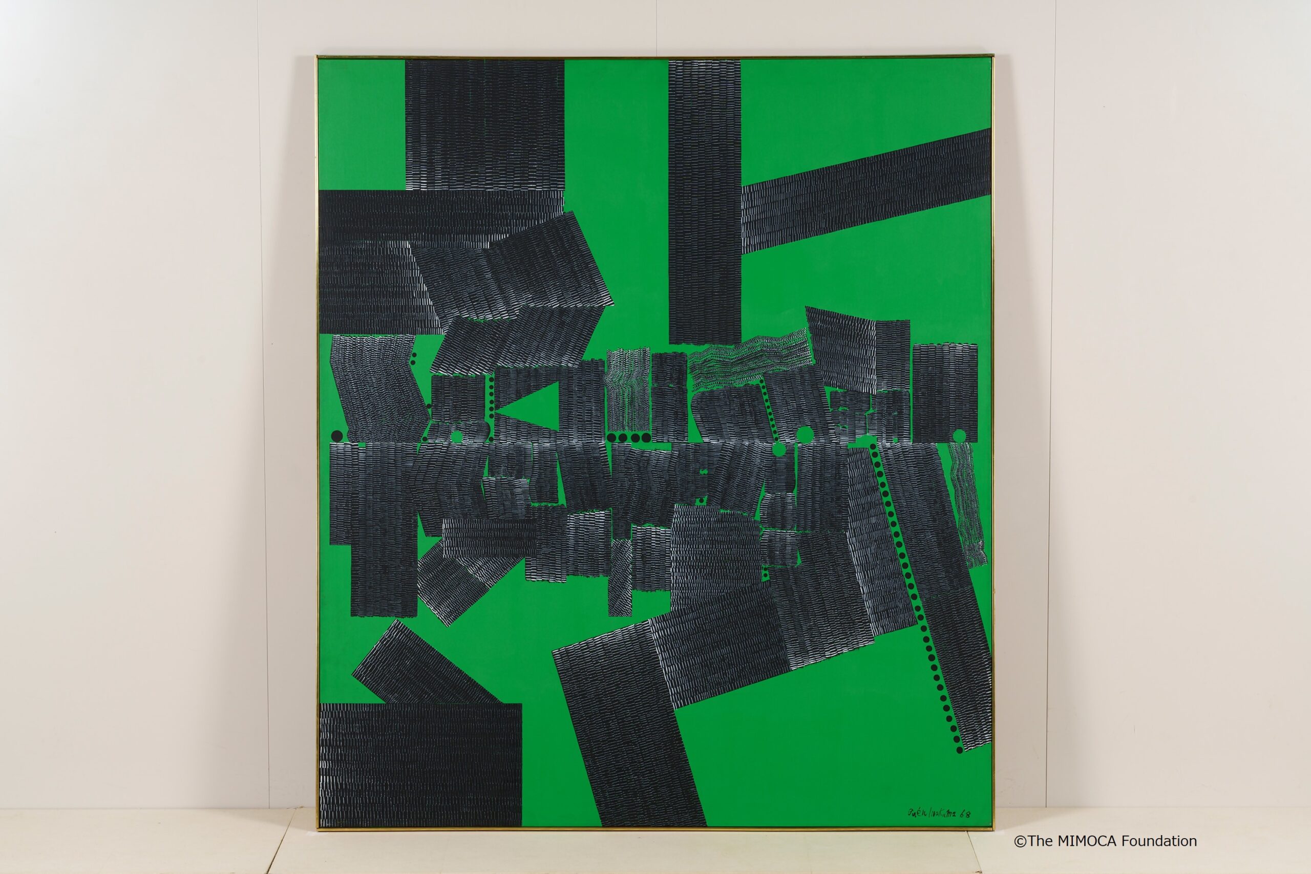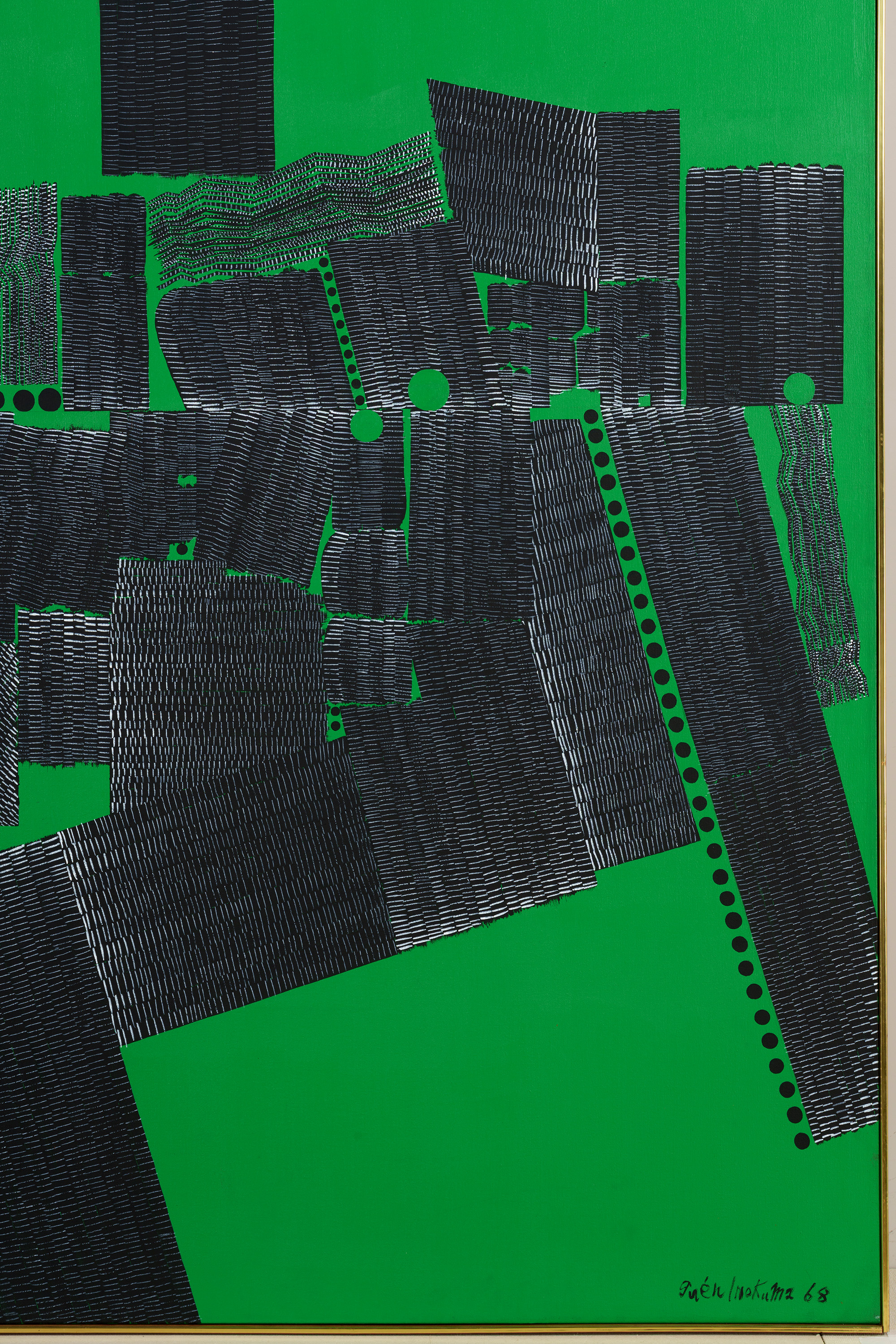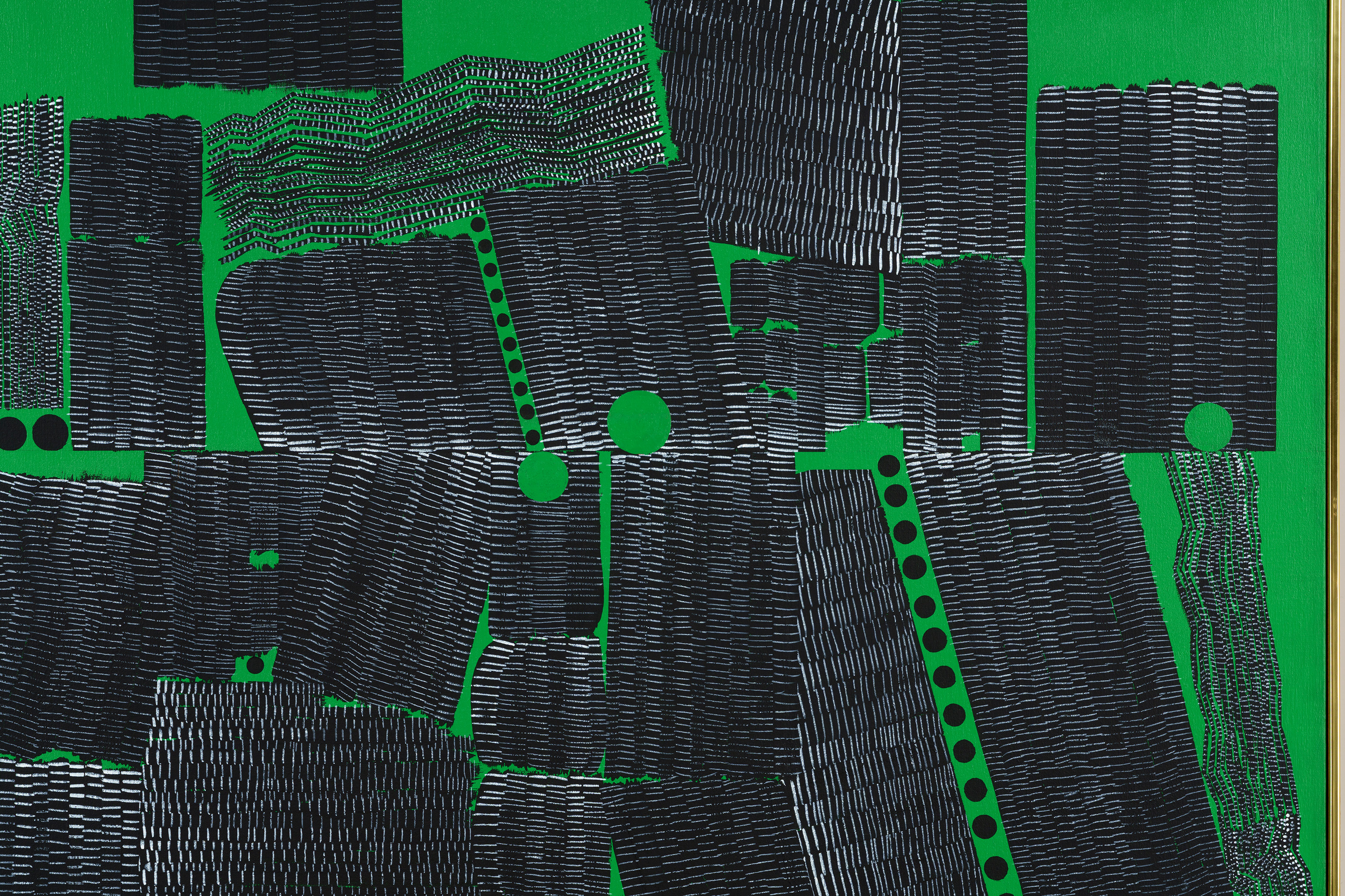 均一に緑色に塗られた背景に、縦・横・斜めの黒線が並んでいる。向き、長さ、太さもさまざまな黒線の間には、黒丸も現れている。こうして生まれた画面は、模様のようにも地図のようにも見える。作者のニューヨーク滞在13年目の作品である。