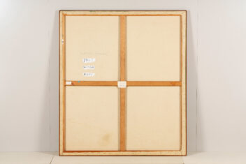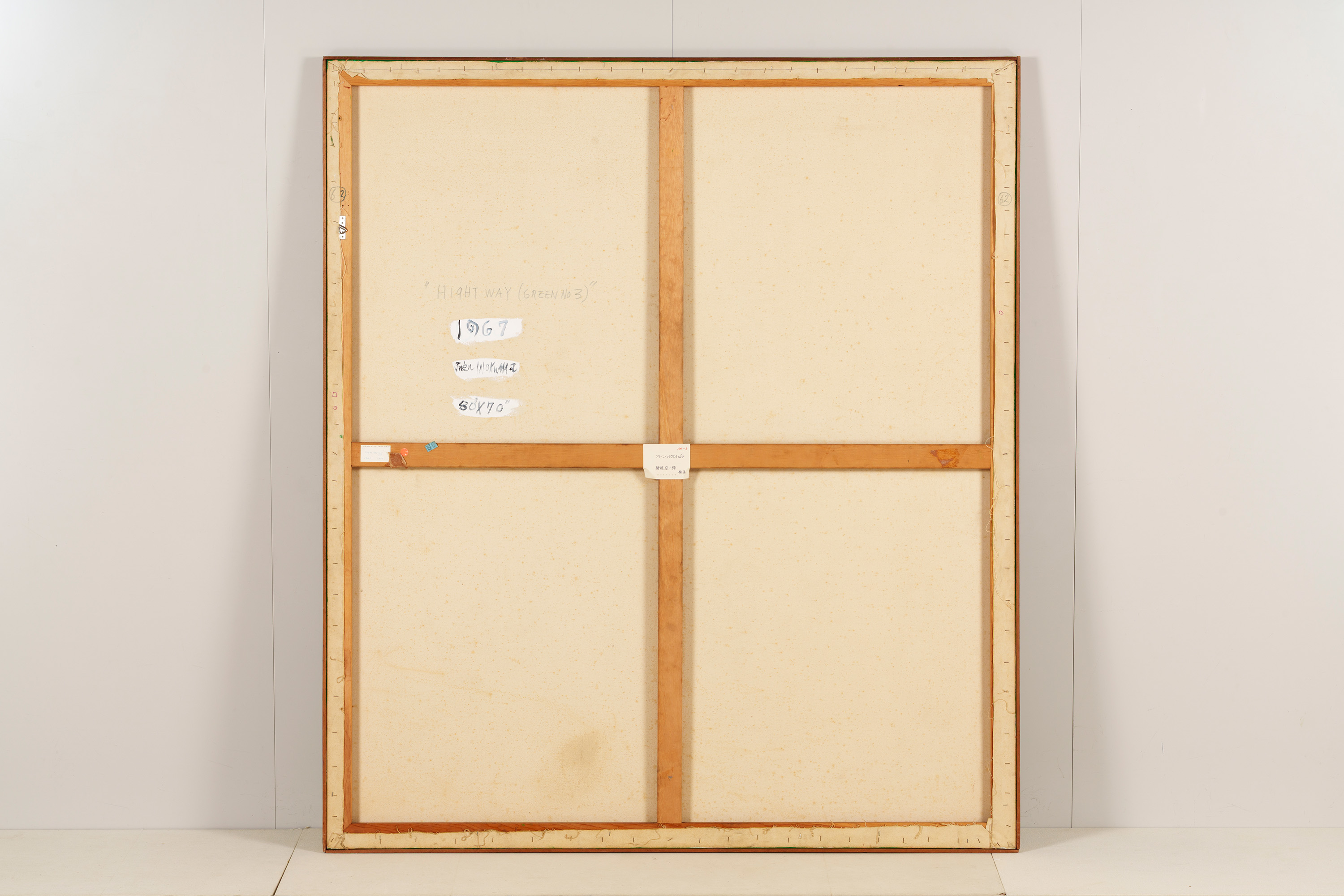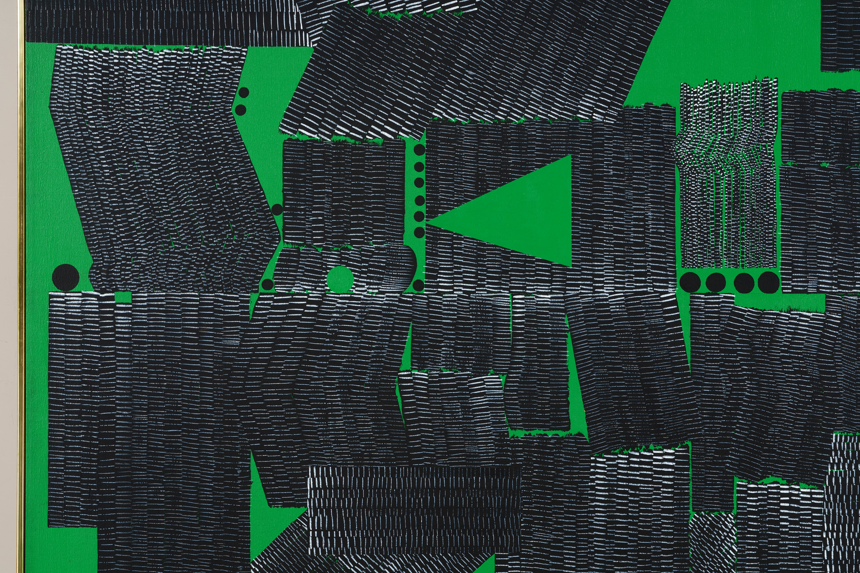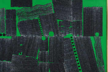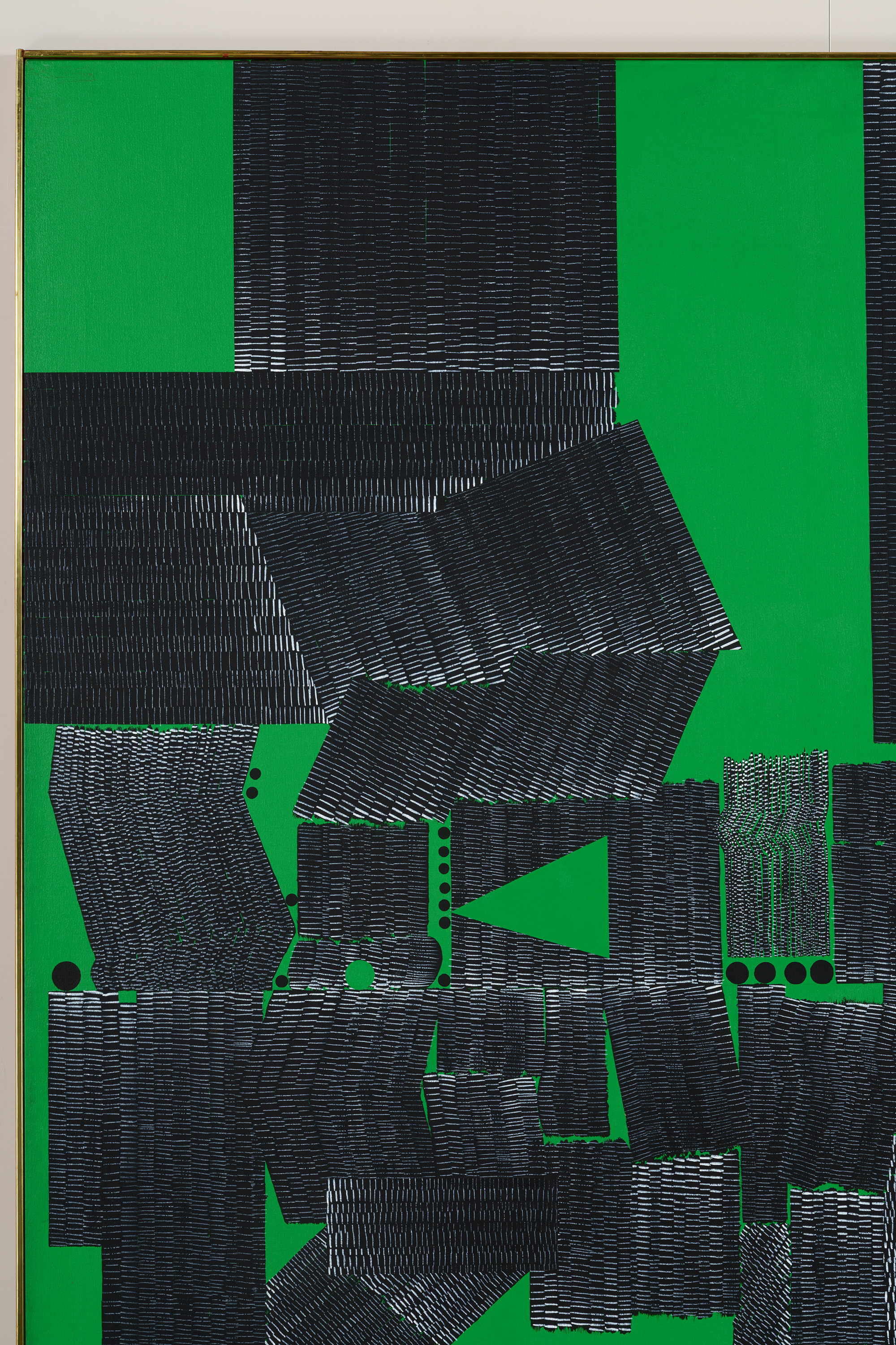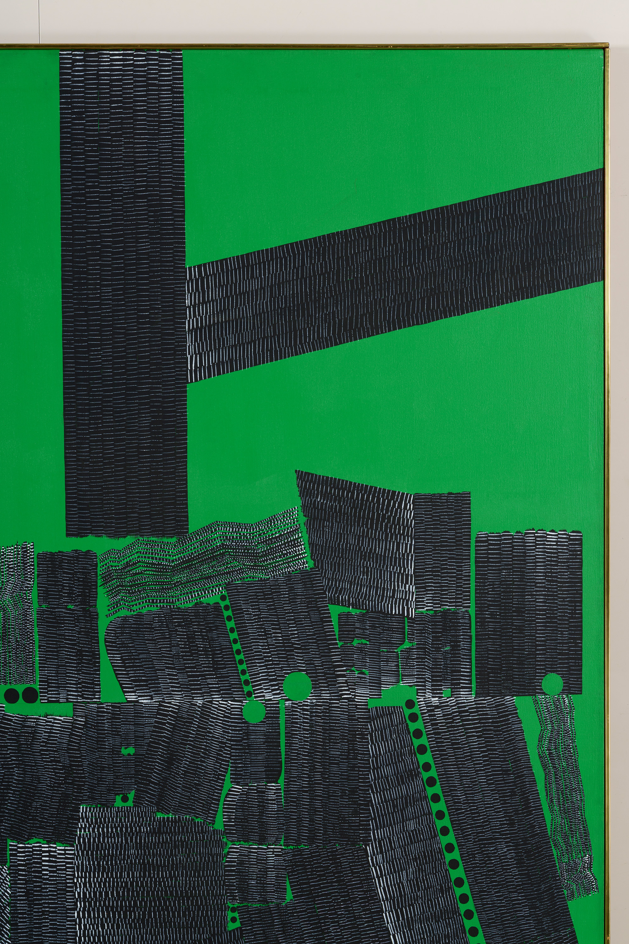 均一に緑色に塗られた背景に、縦・横・斜めの黒線が並んでいる。向き、長さ、太さもさまざまな黒線の間には、黒丸も現れている。こうして生まれた画面は、模様のようにも地図のようにも見える。作者のニューヨーク滞在13年目の作品である。