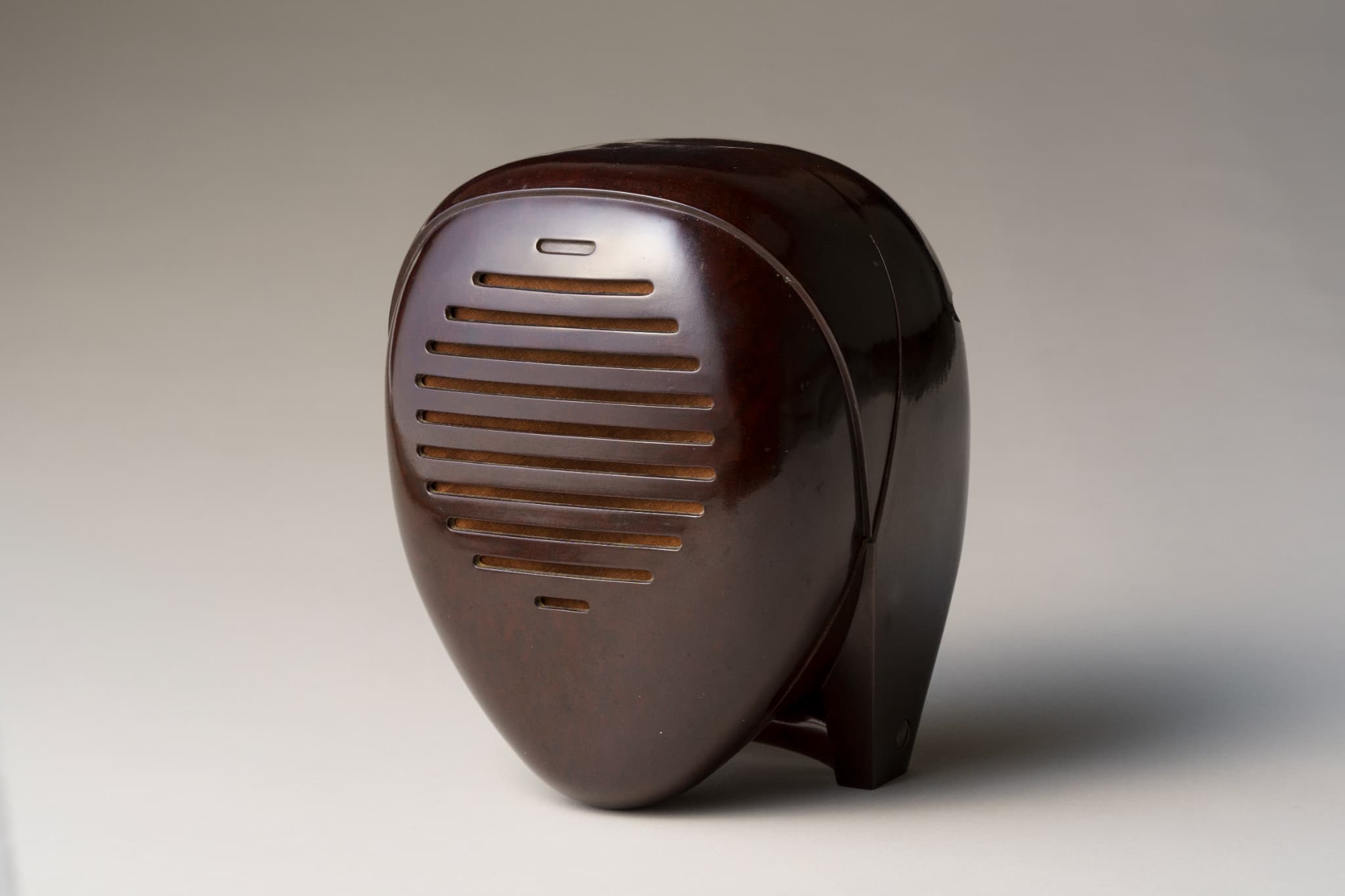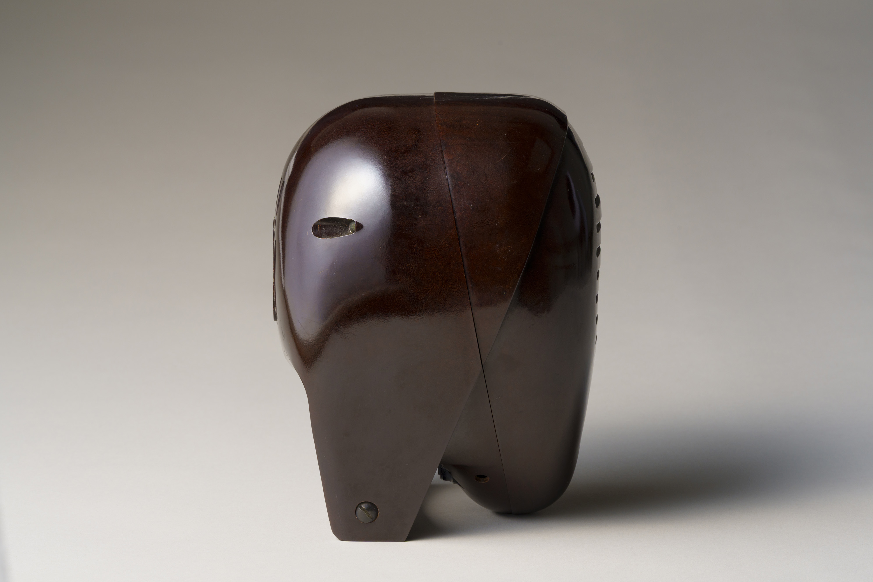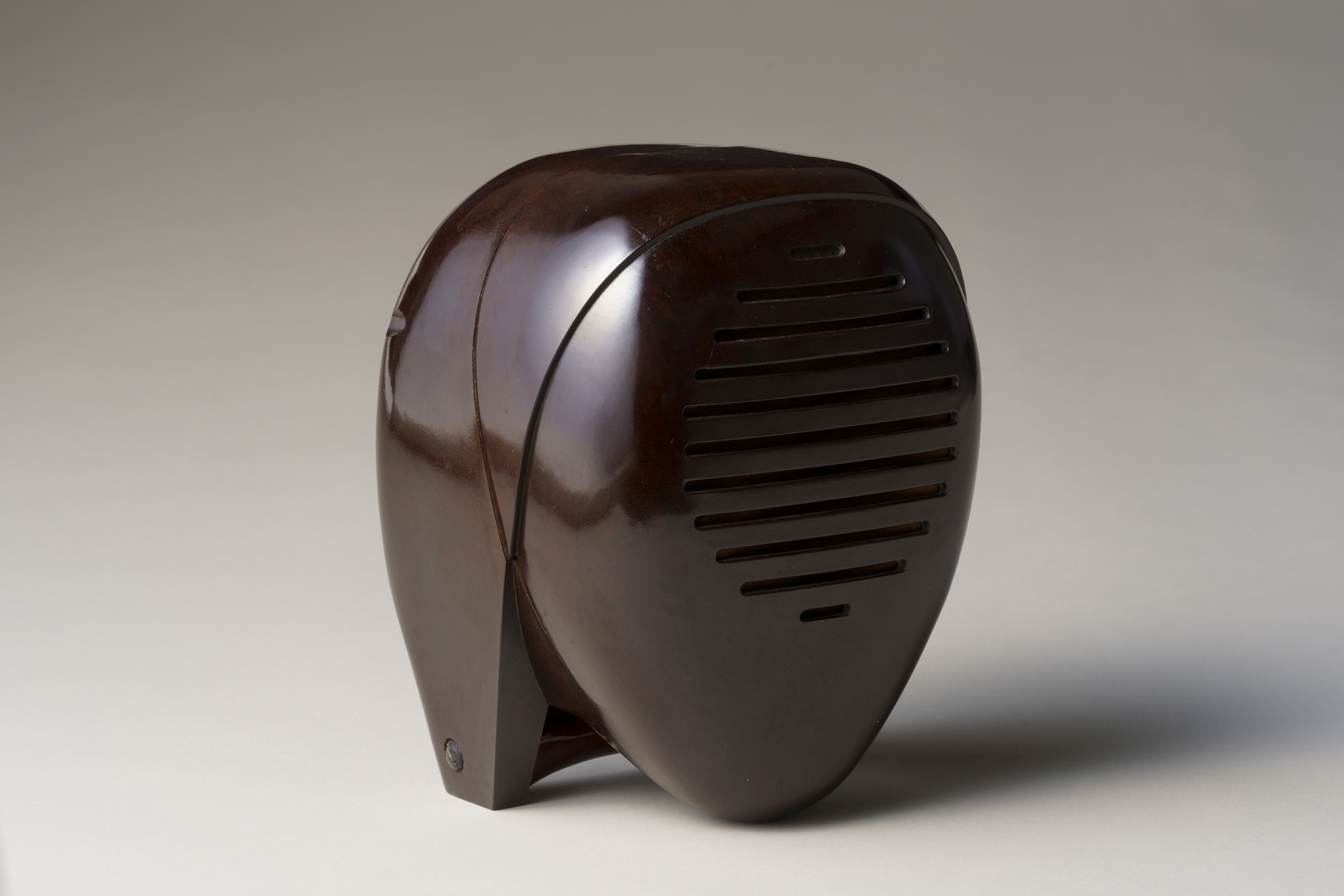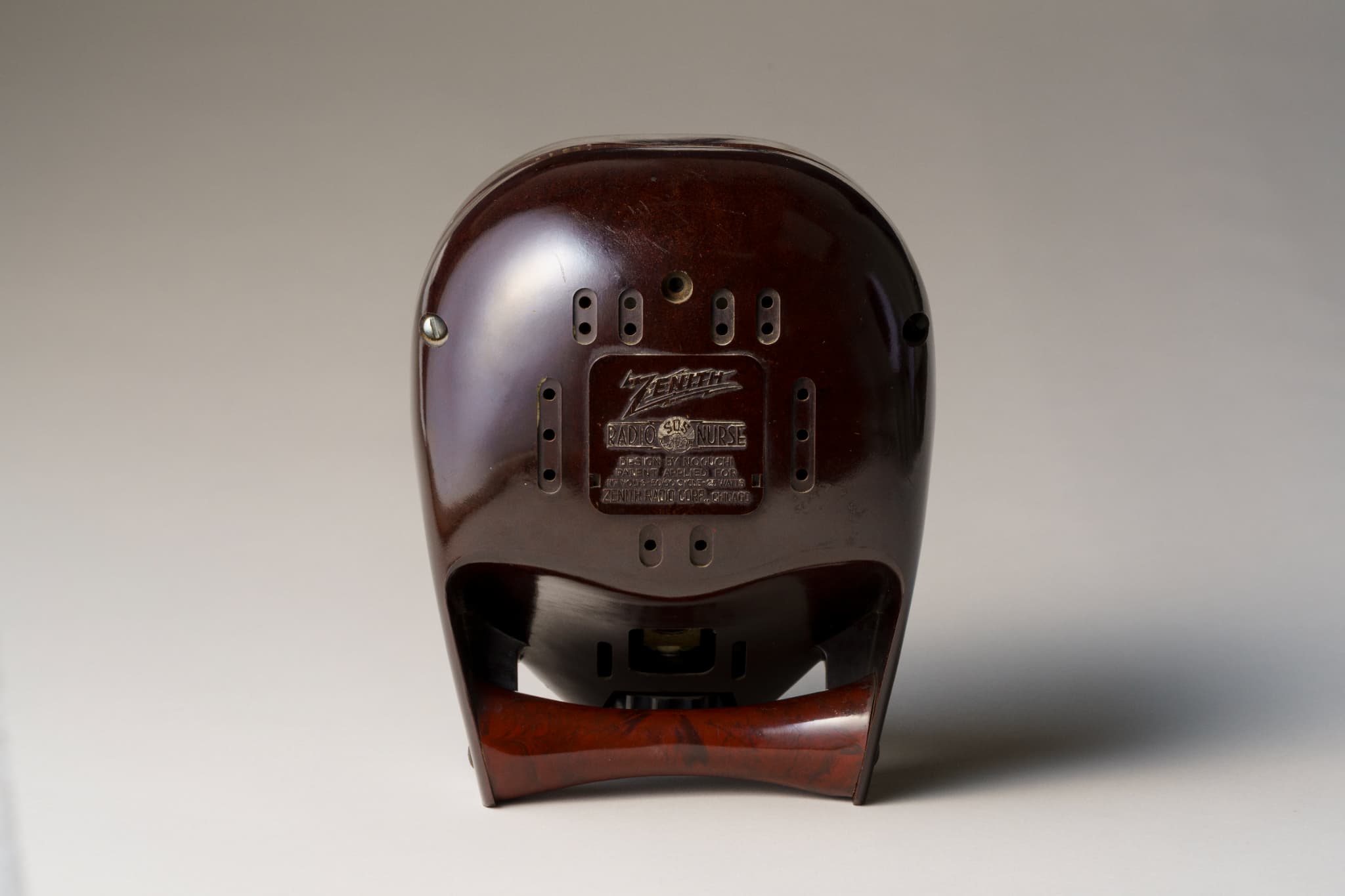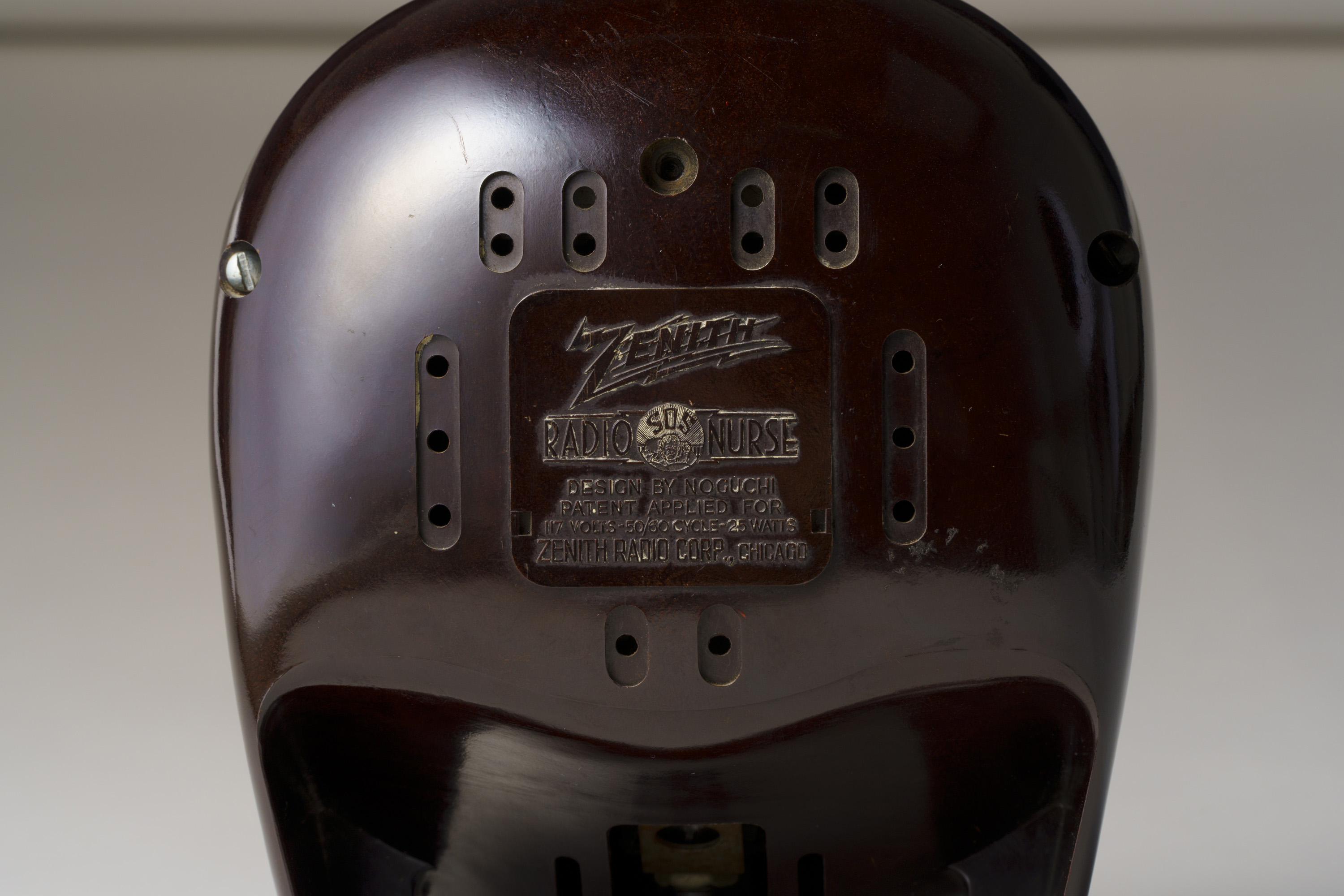 滑らかで丸みを帯びた造り。尼僧にも剣道の防具の面にも見える、近未来的な立体造形である。イサム・ノグチが手掛けたプロダクトデザインで、アメリカのラジオメーカーであるゼニス社の製品である。家の中の離れた場所で収音機が拾った音を、本機が受信・拡声するスピーカーの役割を果たすオーディオモニターであり、当館ではスピーカーのみを所蔵する。大西洋無着陸単独横断で有名な飛行士リンドバーグの幼い子どもの誘拐事件を契機に、制作されたとされる。