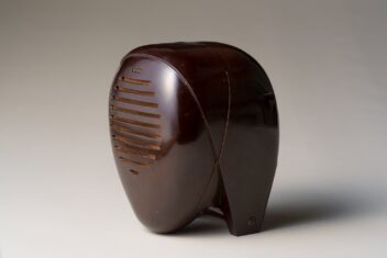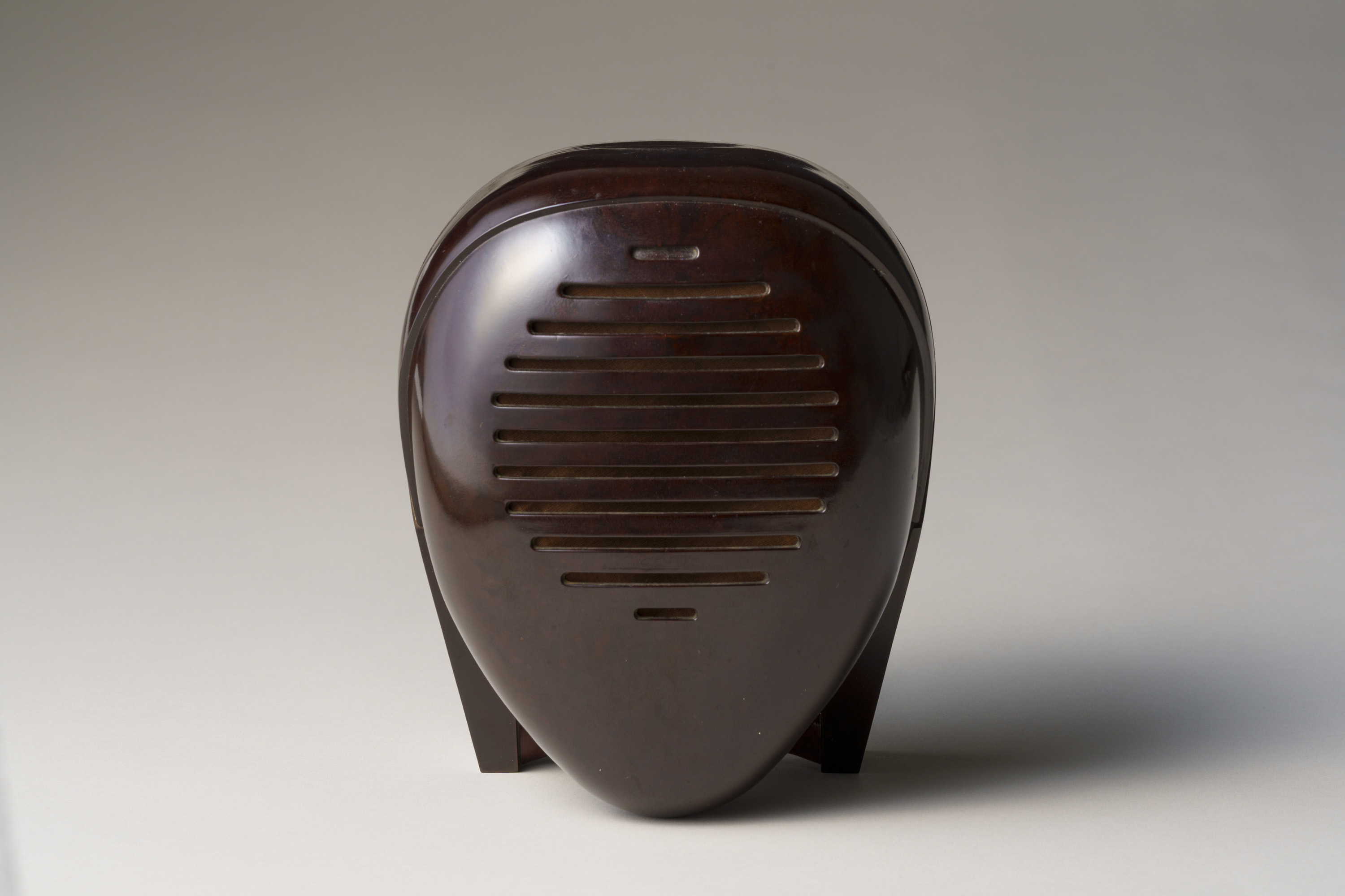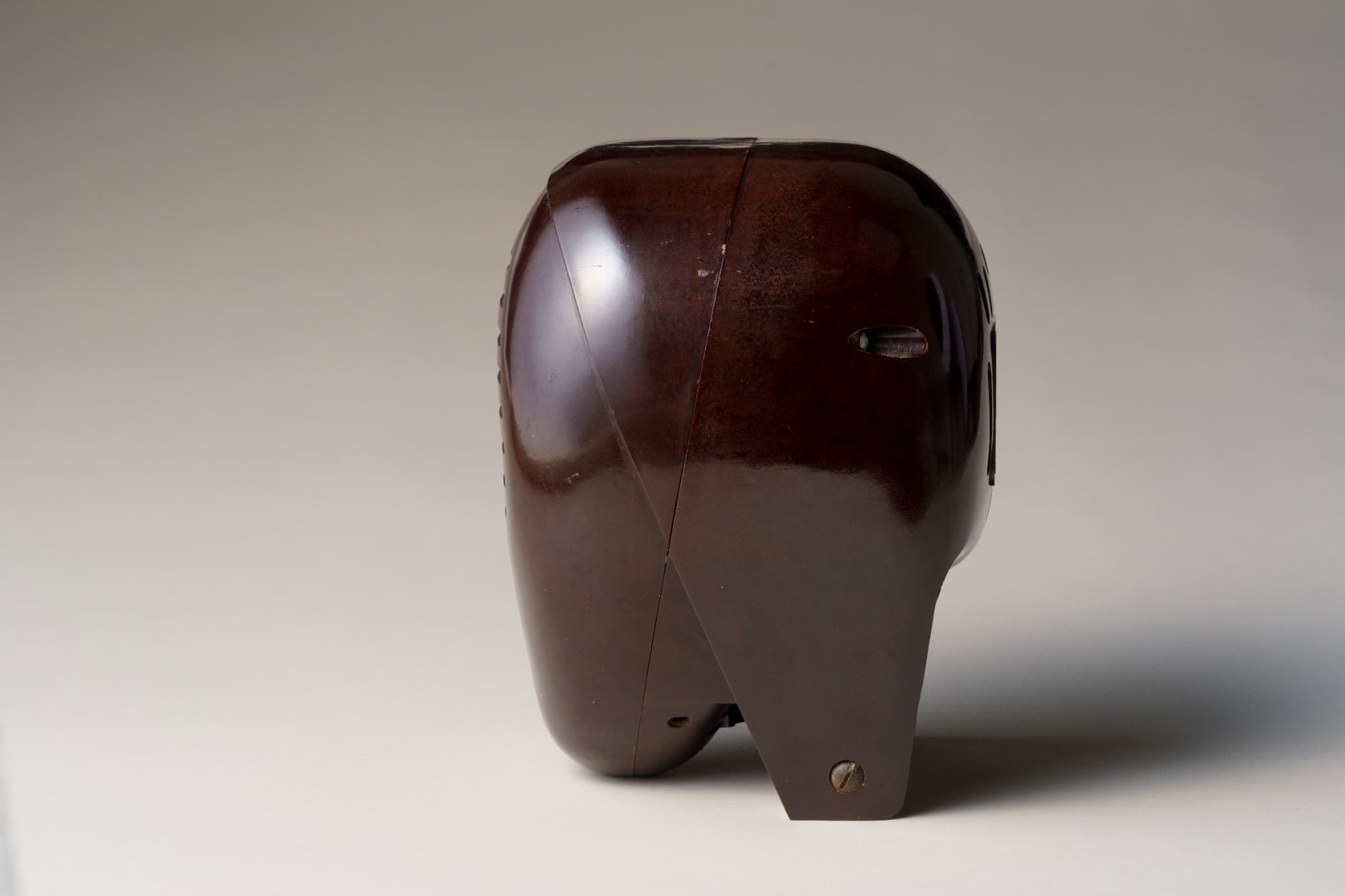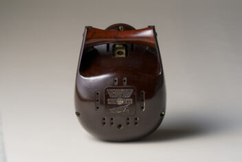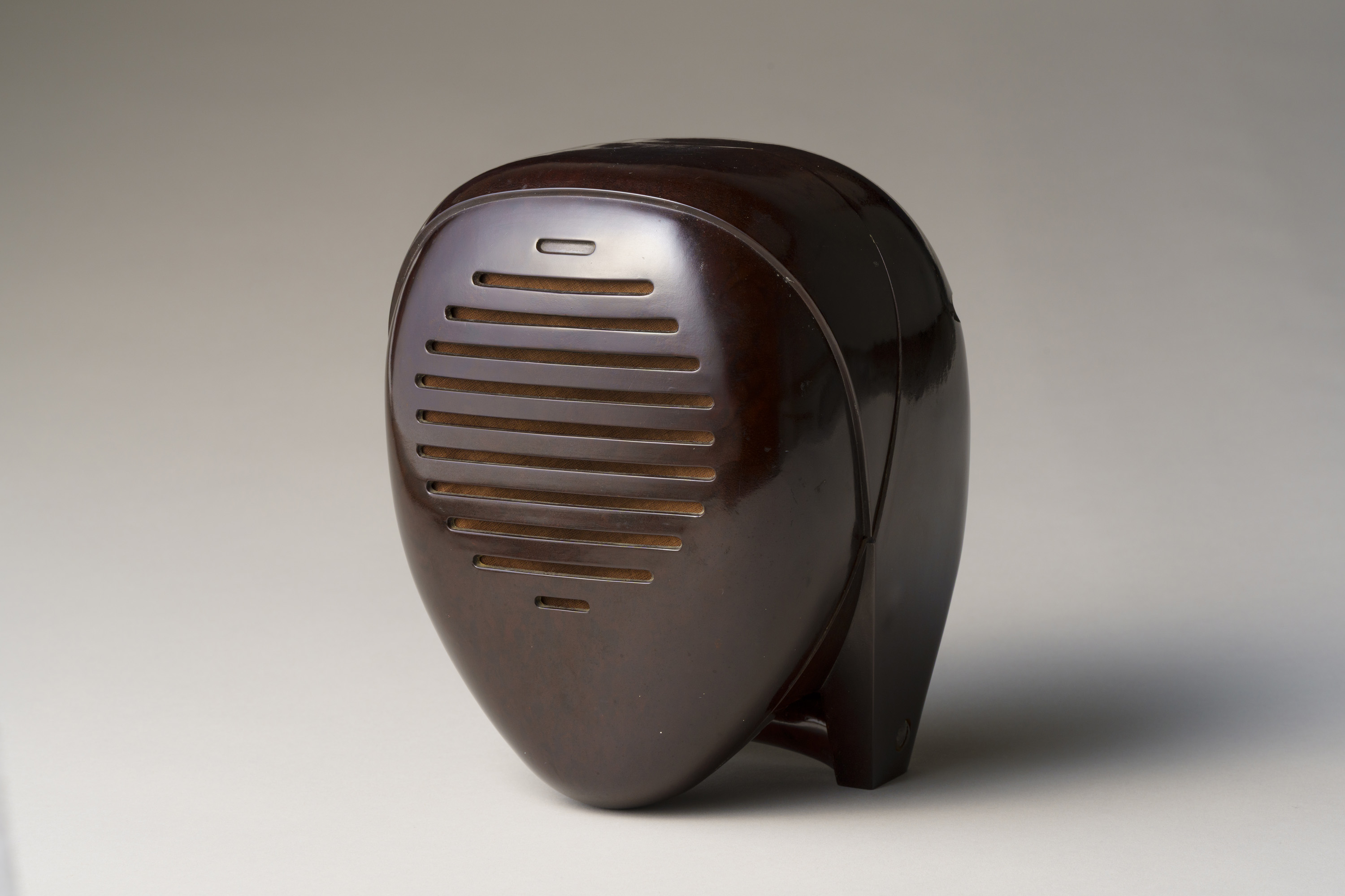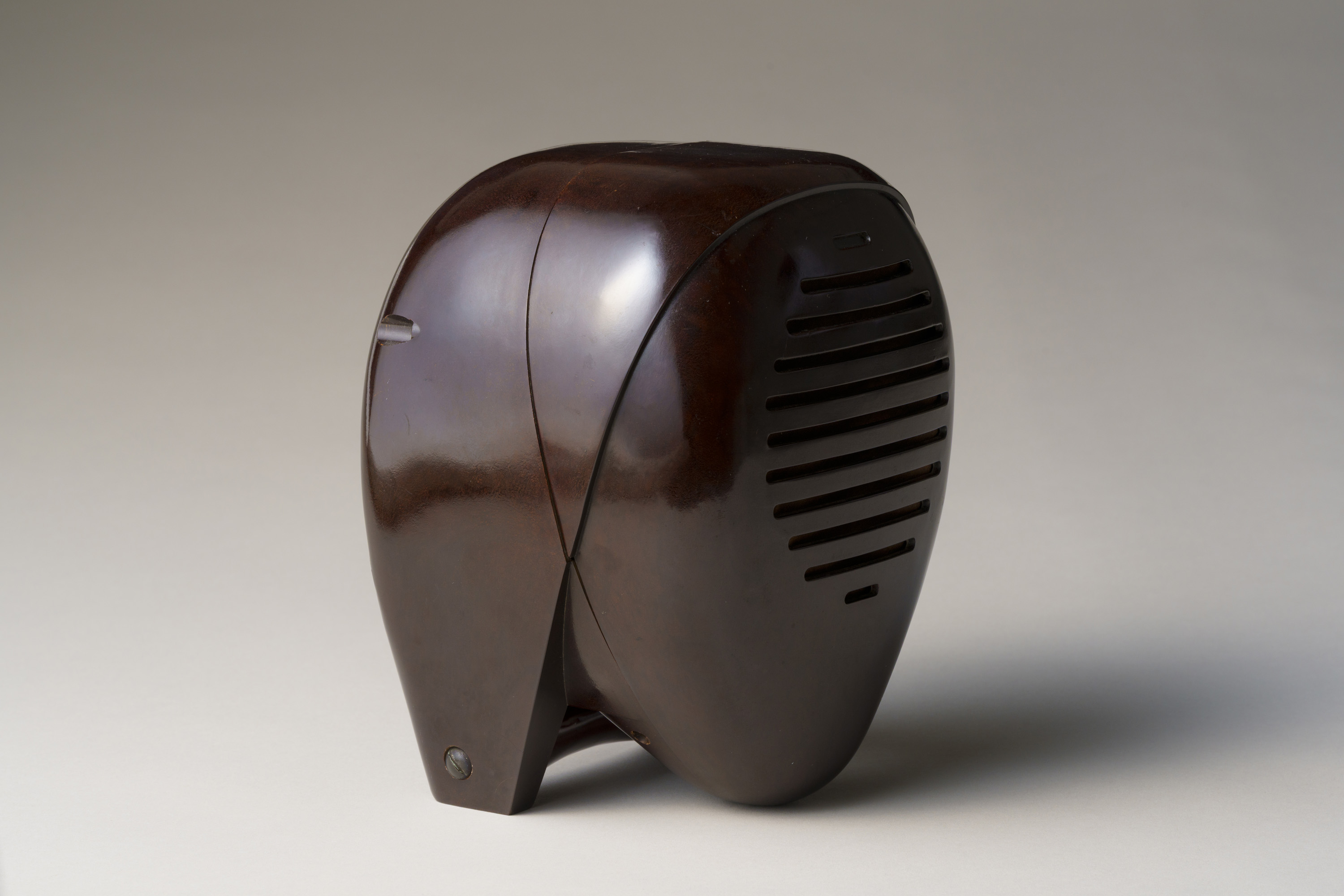 滑らかで丸みを帯びた造り。尼僧にも剣道の防具の面にも見える、近未来的な立体造形である。イサム・ノグチが手掛けたプロダクトデザインで、アメリカのラジオメーカーであるゼニス社の製品である。家の中の離れた場所で収音機が拾った音を、本機が受信・拡声するスピーカーの役割を果たすオーディオモニターであり、当館ではスピーカーのみを所蔵する。大西洋無着陸単独横断で有名な飛行士リンドバーグの幼い子どもの誘拐事件を契機に、制作されたとされる。