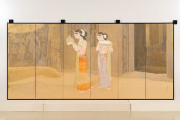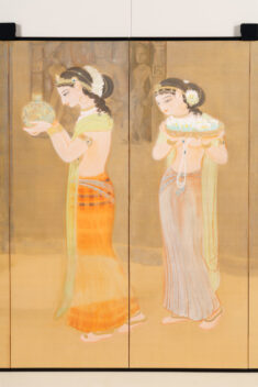 窟院の朝 くついん の あさ 作者 野生司香雪(のうす こうせつ、1885-1975) 時代 大正9年(1920) 品質・員数 絹本彩色、6曲1双 法量(cm) (各)縦167.0 横366.0 分類 絵画(国内) 収蔵番号 BK1#00202 もっと見る もっと見る 解説 丘陵や山崖を掘り開いて作られた石窟寺院において、朝もやの中を2人の女性が供物(くもつ)を手にして静かに歩む様子などが描かれる。描かれる絵絹の裏側に金箔を貼り込む裏箔の技法を用いることによって、直接的な金の輝きが抑えられ、柔らかな朝もやの日差しが表現されている。仏教美術研究のためにインドに渡り、アジャンタの石窟寺院の壁画などを模写し、帰国後に描いた作品である。この作品中に描かれた壁面のレリーフも、正確な取材に基づいている。作者は香川郡檀紙村(現・高松市)に生まれ、僧侶の父から仏教の教えを学び育った。明治41年(1908)、東京美術学校(現・東京藝術大学)美術日本画科を卒業。大正6ー7年(1917ー1918)に渡印。昭和7ー11年(1932ー1936)には、ブッダが最初に説法を唱えた聖地とされるインド・サールナートに建立された初転法輪寺(ムルガンダ・クティ寺院)で壁画を制作した。 関連作品 春雪 晩夏 渡舟 梅樹 作品をさがす リセット キーワード検索 分類 すべて 絵画(国内) 絵画(国外) 彫刻 工芸 書 デザイン 民俗資料 その他 指定区分 すべて 国宝 重要文化財 重要美術品 県指定 市町指定 検索