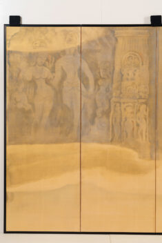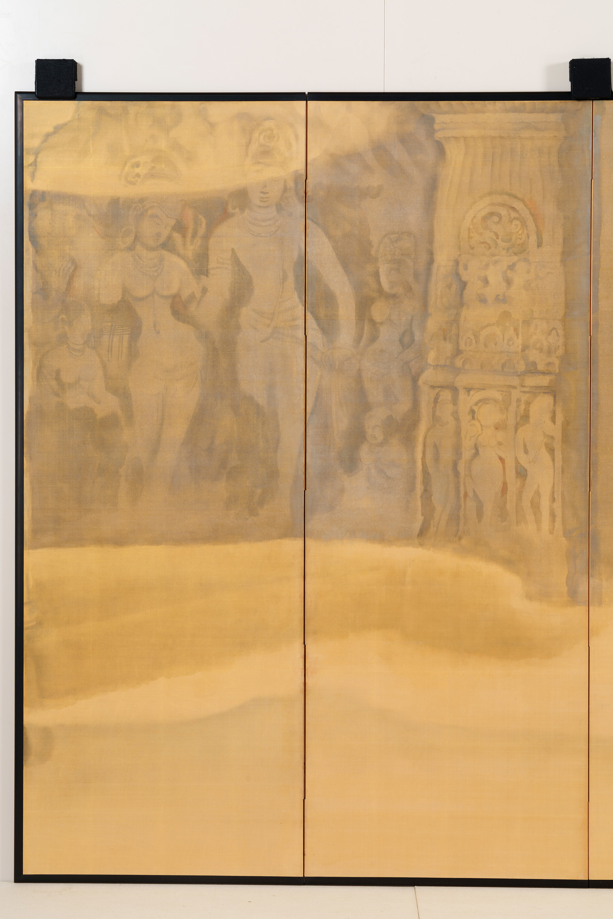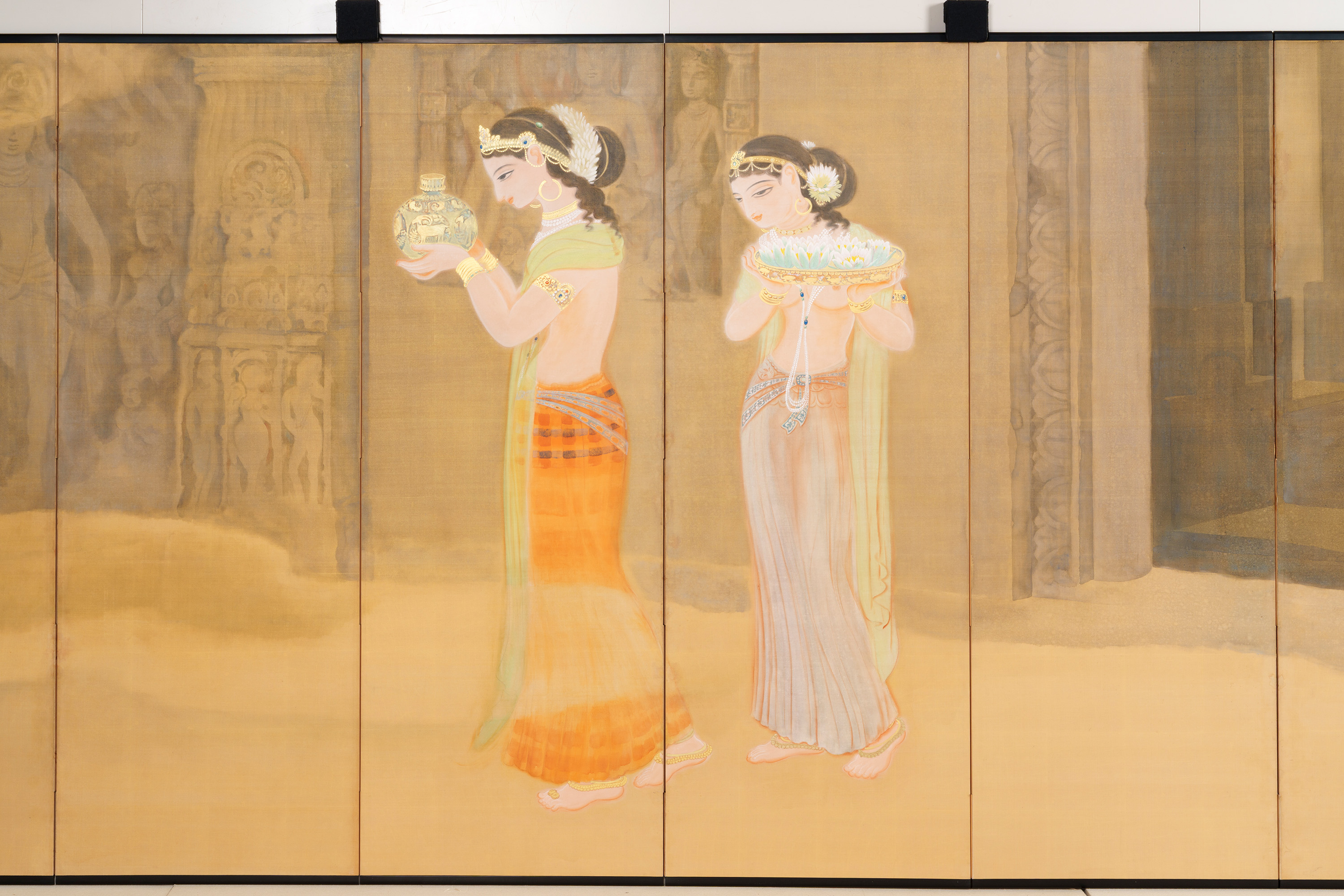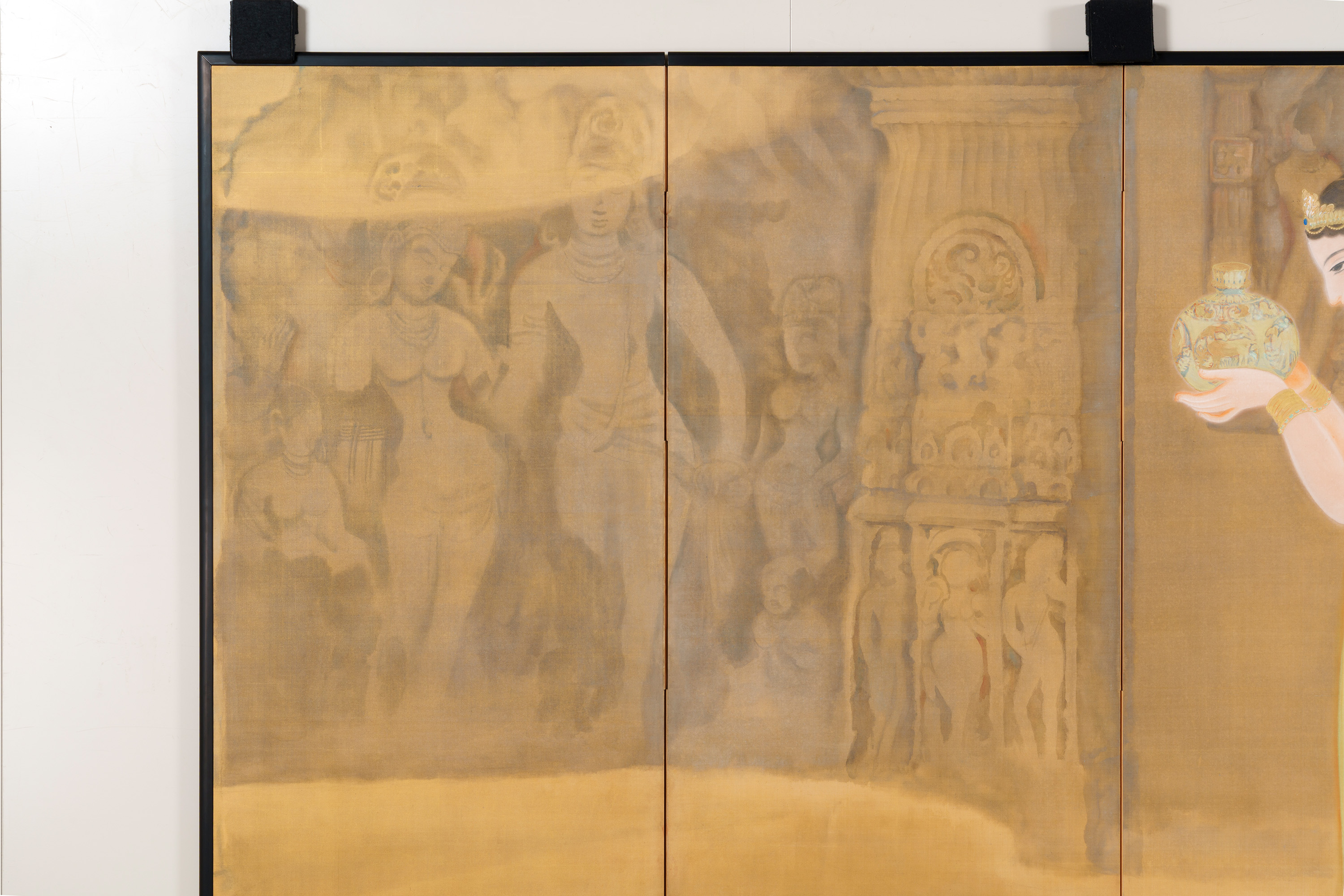 丘陵や山崖を掘り開いて作られた石窟寺院において、朝もやの中を2人の女性が供物(くもつ)を手にして静かに歩む様子などが描かれる。描かれる絵絹の裏側に金箔を貼り込む裏箔の技法を用いることによって、直接的な金の輝きが抑えられ、柔らかな朝もやの日差しが表現されている。仏教美術研究のためにインドに渡り、アジャンタの石窟寺院の壁画などを模写し、帰国後に描いた作品である。この作品中に描かれた壁面のレリーフも、正確な取材に基づいている。