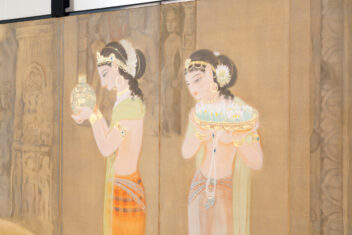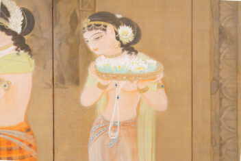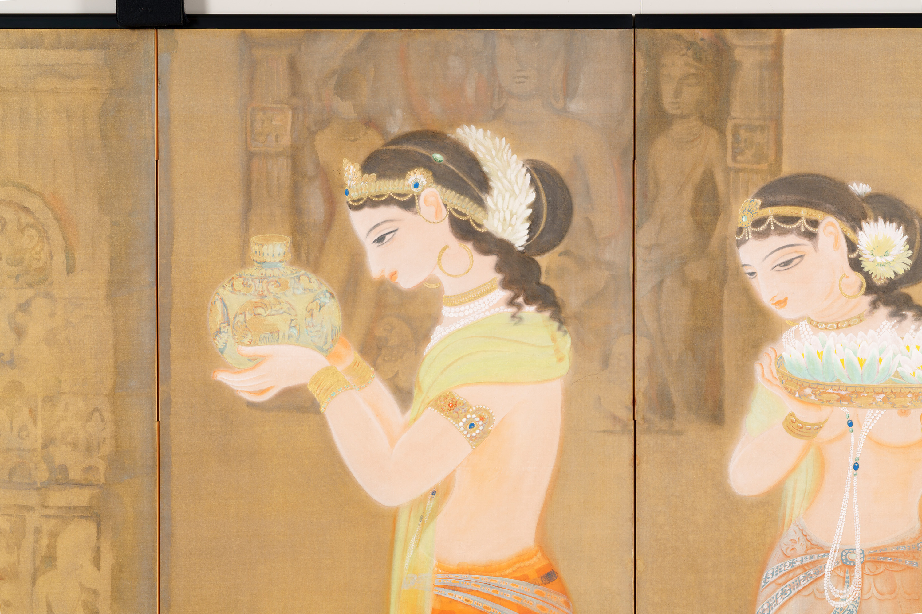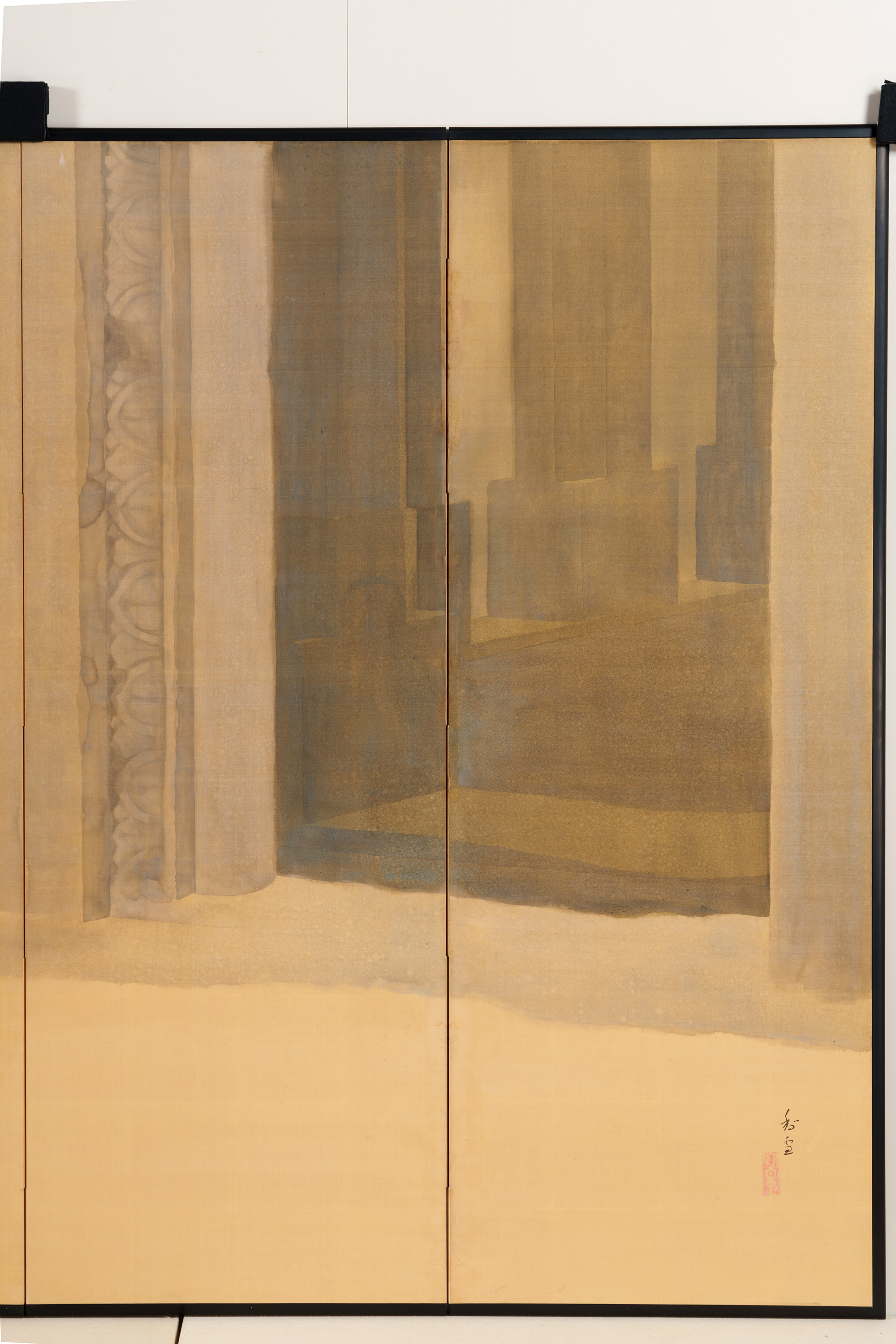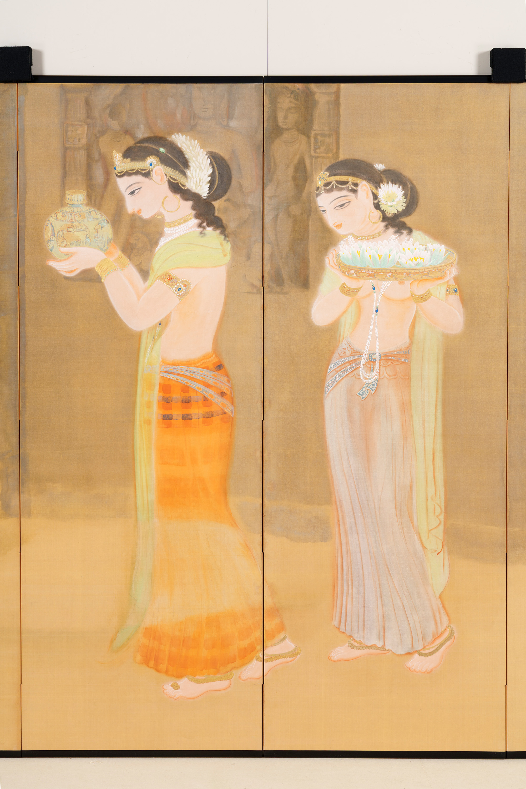 丘陵や山崖を掘り開いて作られた石窟寺院において、朝もやの中を2人の女性が供物(くもつ)を手にして静かに歩む様子などが描かれる。描かれる絵絹の裏側に金箔を貼り込む裏箔の技法を用いることによって、直接的な金の輝きが抑えられ、柔らかな朝もやの日差しが表現されている。仏教美術研究のためにインドに渡り、アジャンタの石窟寺院の壁画などを模写し、帰国後に描いた作品である。この作品中に描かれた壁面のレリーフも、正確な取材に基づいている。