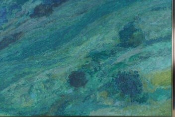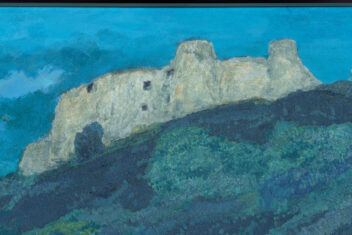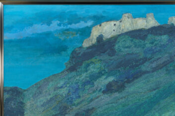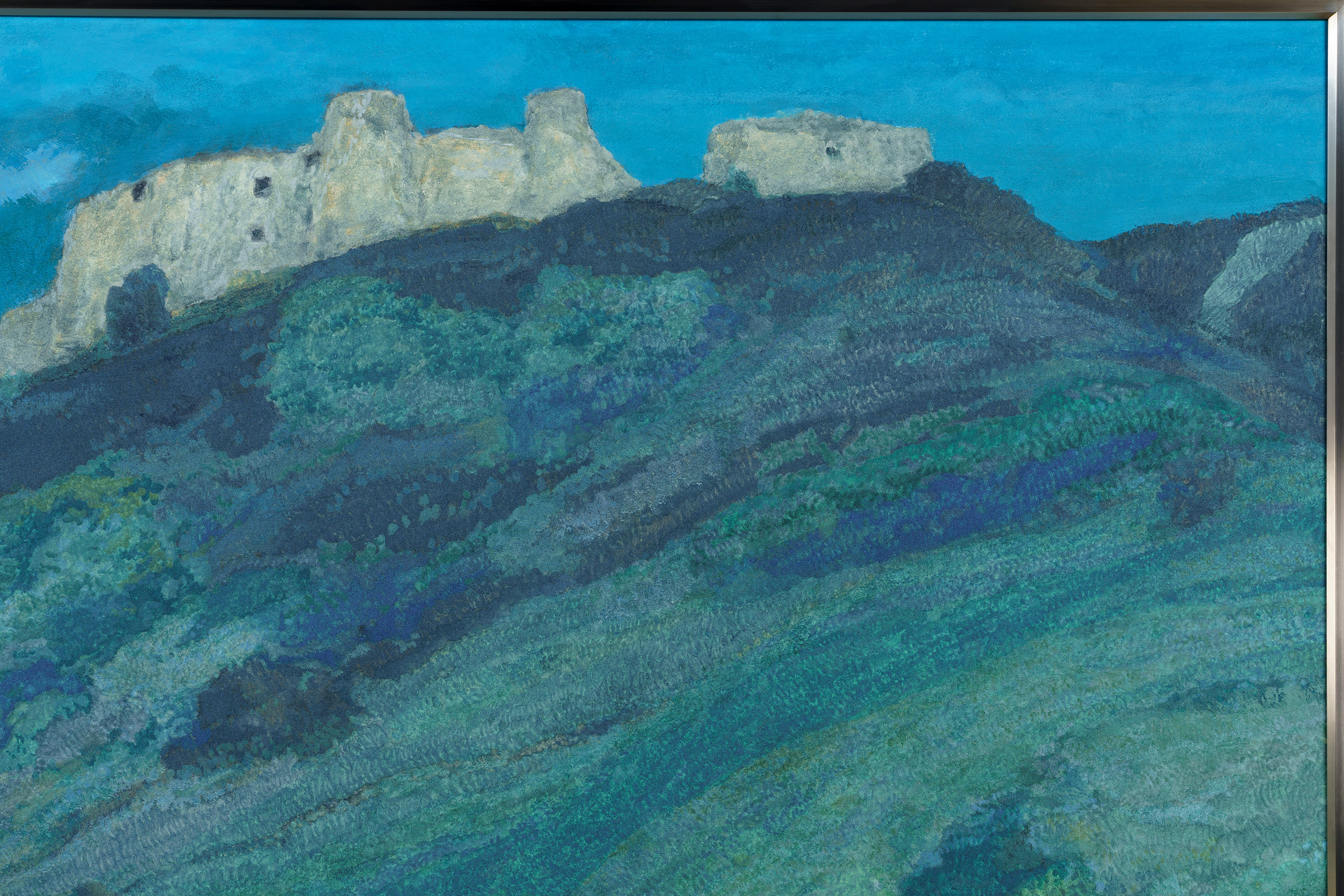丘の頂に古城が見える。仰ぎ見ると、視線は真っ青な大空に抜ける。仰視へ誘う構図や、横に流れる筆跡からは風の流れが感じられるようである。かつて人の出入りがあった城は、現在では自然の中の一風景に溶け込んでいる。作者は日常の中で見過ごしがちな風景に漂う気配を探究した。