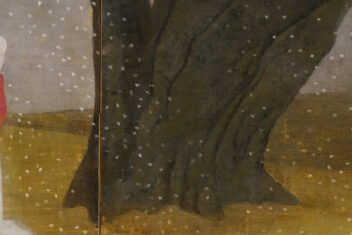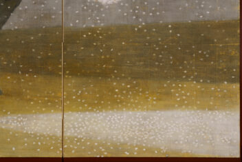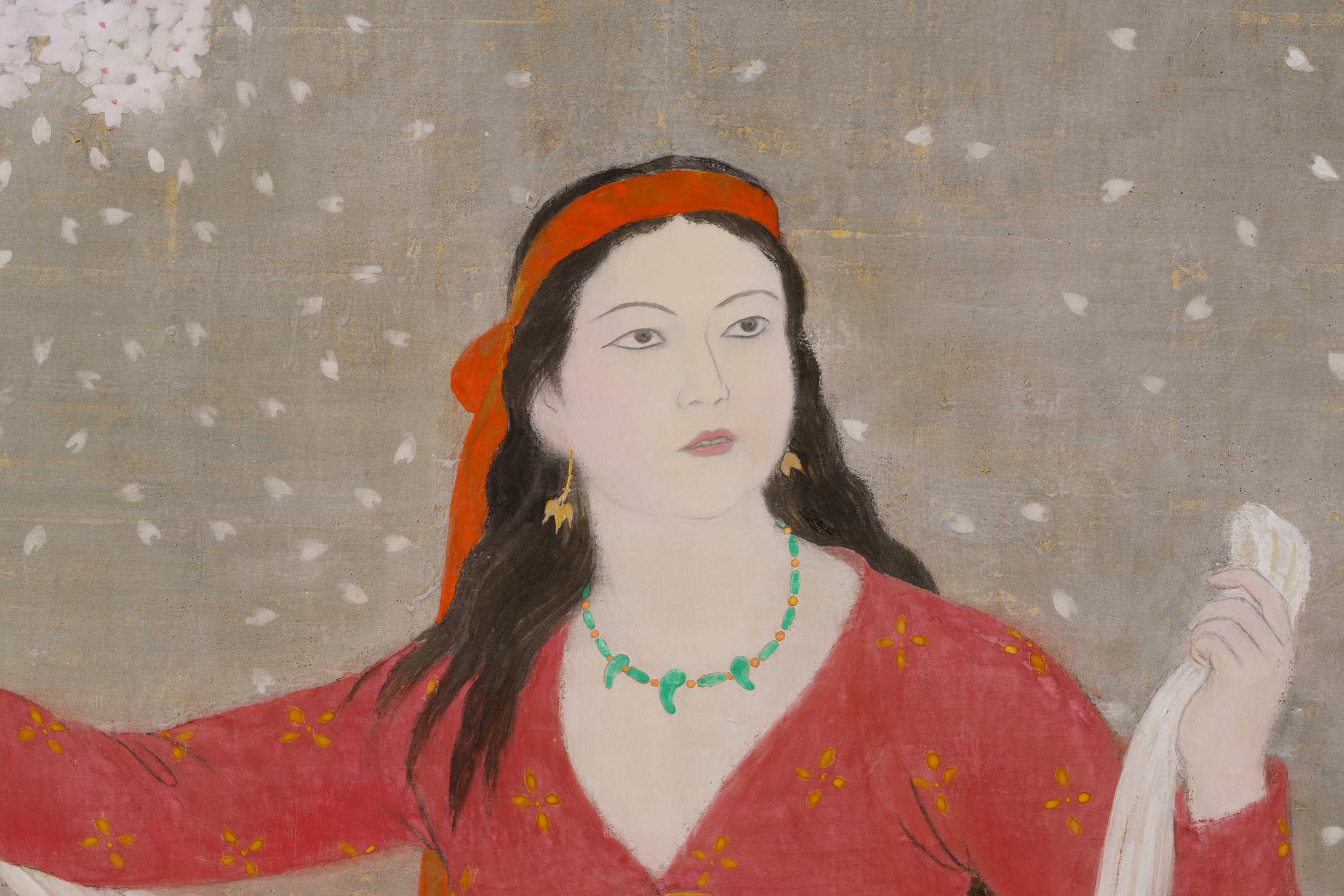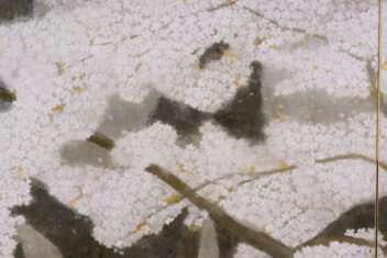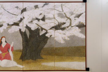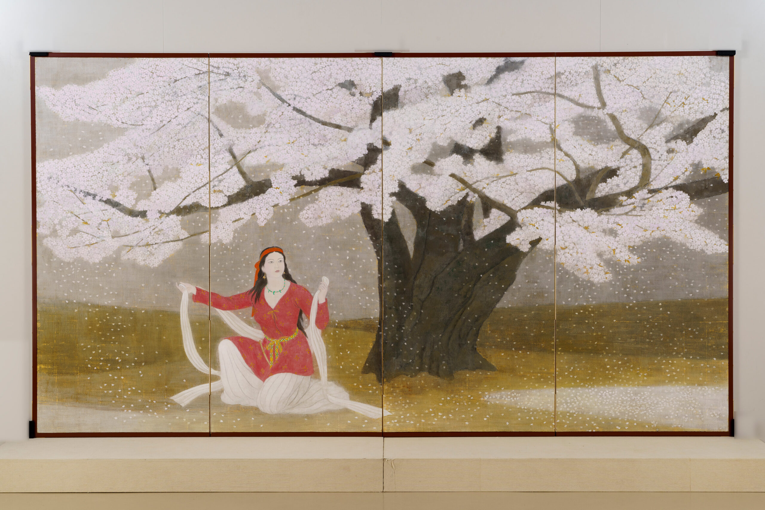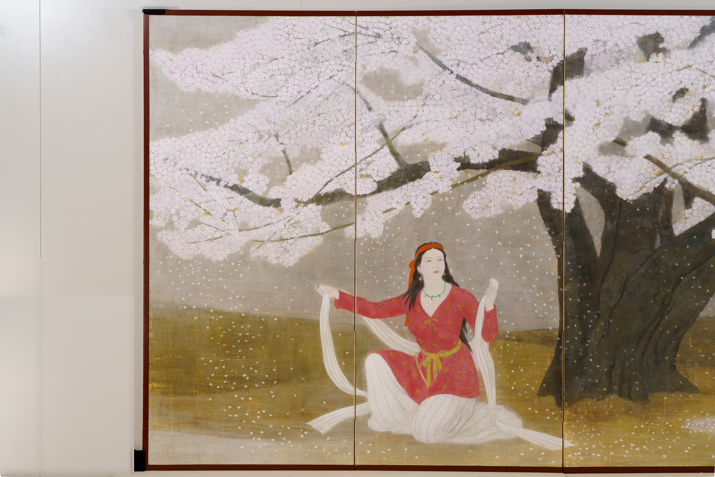 本作では、桜の大樹の下で古代衣装の女性が花を咲かせるように両腕を広げている。神話の世界を通して、生き生きとした女性の生命力がみなぎる作品である。