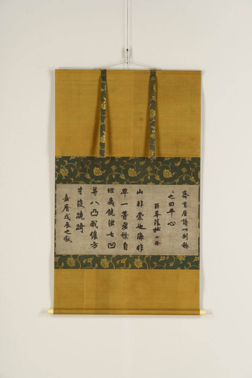 Fujiwara Sari, a celebrated master calligrapher who stands alongside Ono no Tōfū (Michikaze) and Fujiwara no Kōzei (Yukinari), composed a poem and committed it to paper on March 14, 969 (Anna 2), during a poetry gathering hosted by his grandfather, Fujiwara no Saneyori, the Grand Minister of State. The assigned theme was “Flowers and light meeting across the water,” and participants were free to compose poem in the wa-kan nini format, either in waka or in Chinese-style verse. Sari chose to write a seven-character quatrain depicting a spring scene of cherry blossoms reflected on the surface of water. He was twenty-six years old at the time. This piece is not only the earliest surviving example of Sari’s calligraphy, but also the oldest extant shikaishi. While influenced by the style of Ono no Tōfū, the slender and graceful brushstrokes already reveal the emergence of the Japanese calligraphic aesthetic. The work has been passed down within the Takamatsu Matsudaira family.