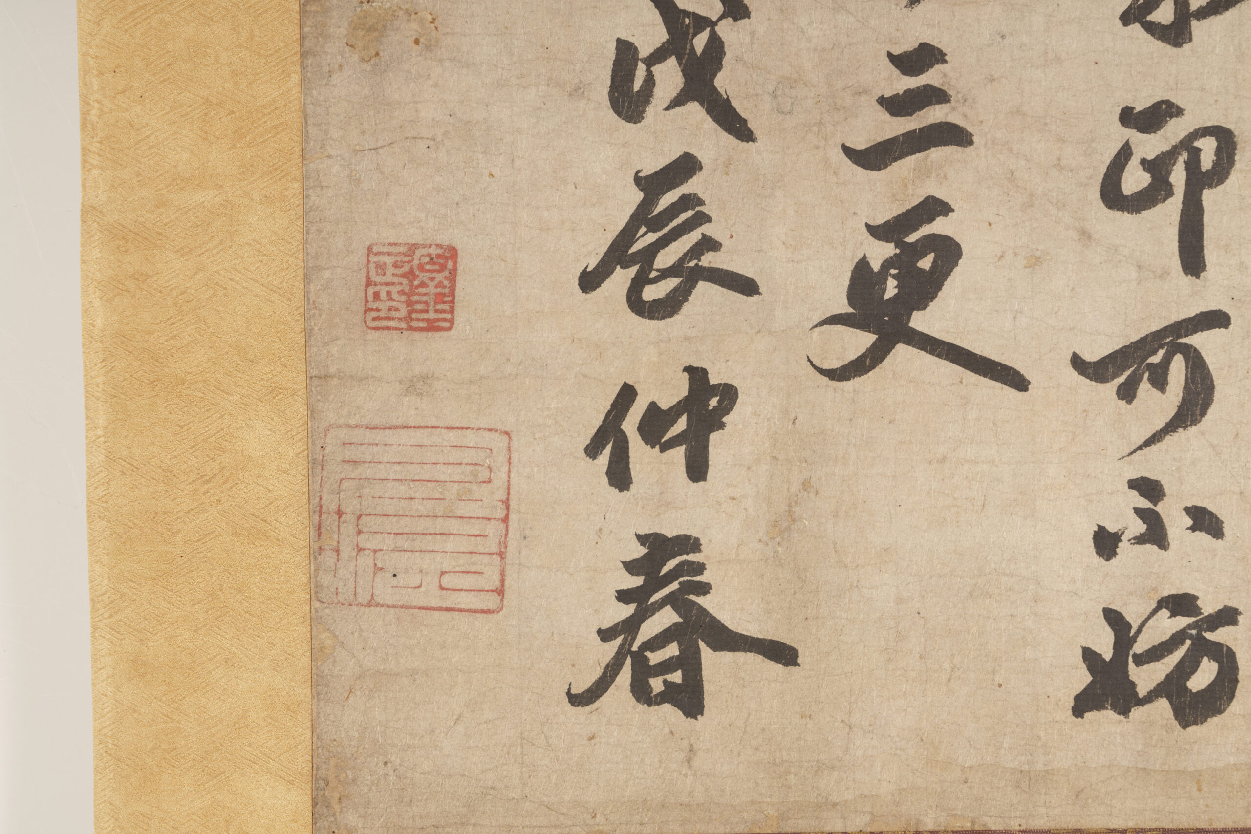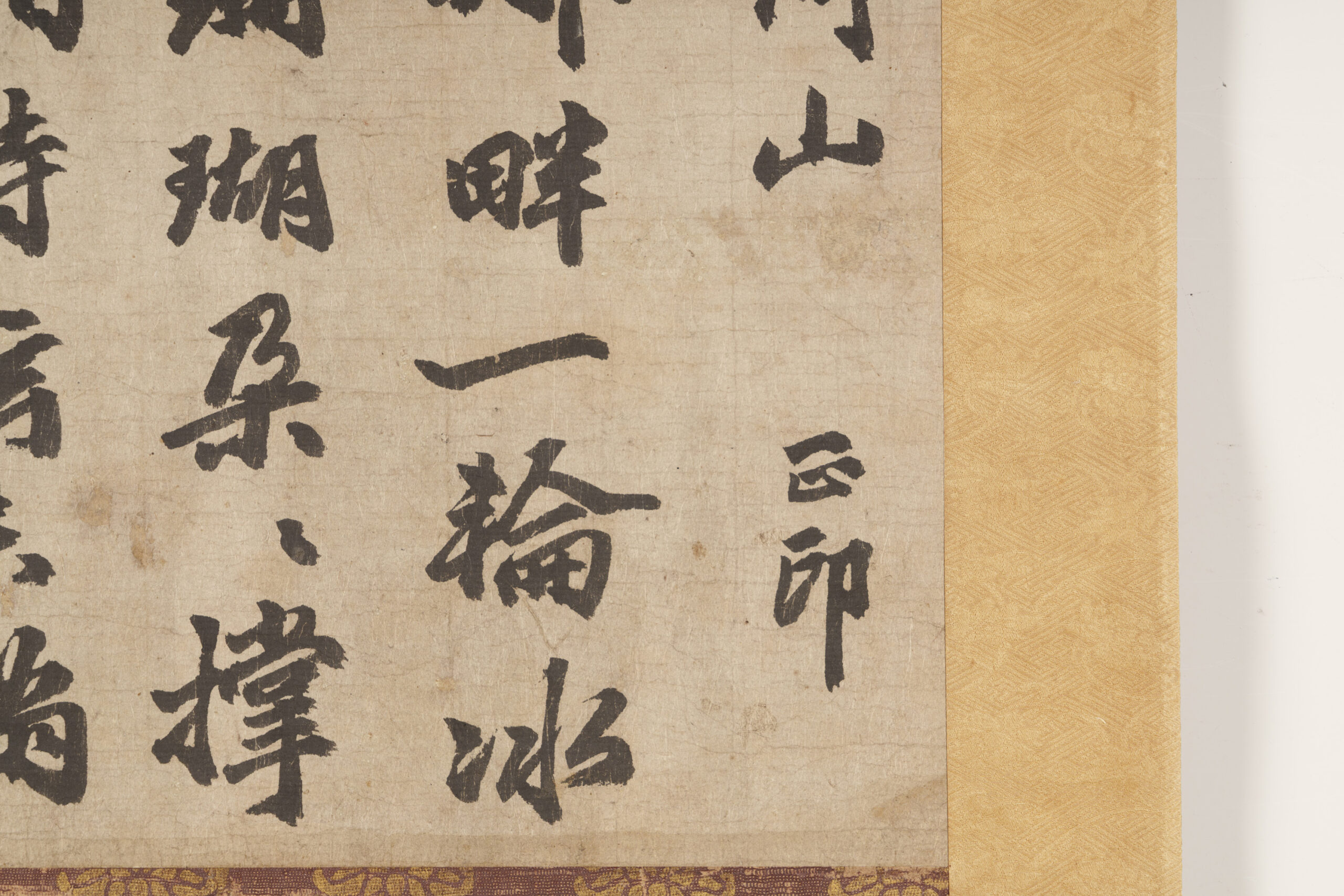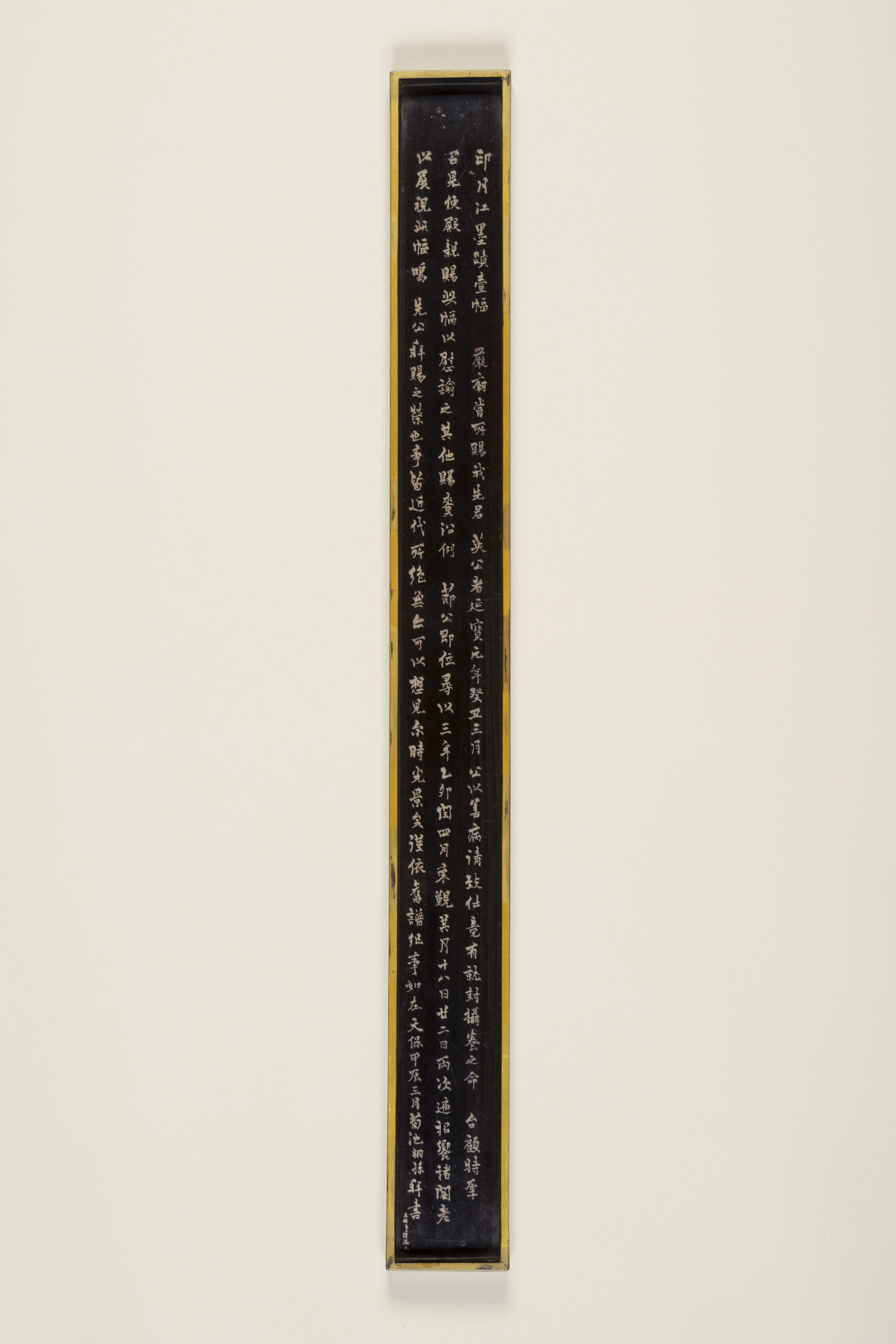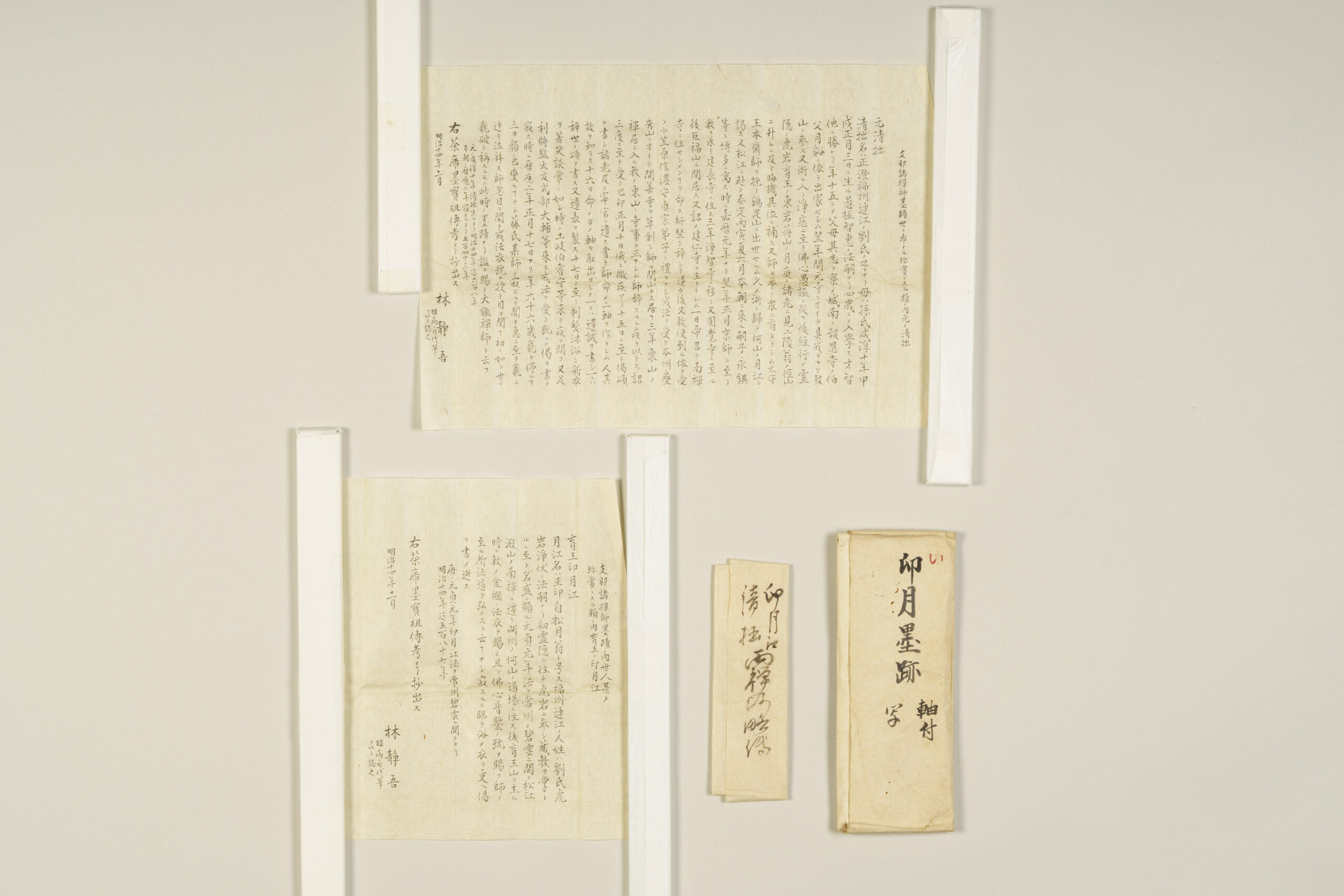 Although Zen Buddhism originally emphasized the transmission of its teachings without reliance on the written word, from the Song dynasty onward (10th–13th century), the calligraphy, paintings, and poetry of Zen monks came to be esteemed as expressions of the Zen spirit. Such calligraphy is known as bokuseki (ink traces), and among them, a document conferred by a master upon a disciple as a certificate of completed training is called an inka-jō. This is an inka-jō that prominent Yuan dynasty Zen monk Gekkō Shōin bestowed upon his disciple Rōzen. Many Japanese monks traveled to study under Gekkō in China, and Rōzen is thought to have been one of these Japanese disciples. It is said that this piece was presented to Matsudaira Yorishige, the first head of the Takamatsu Matsudaira family, by Tokugawa Ietsuna, the fourth shogun, when Yorishige was permitted to retire due to illness in 1673 (Enpō 1). According to inscriptions on its storage box dated 1844 (Tenpō 15), it was later shown at a tea gathering hosted for senior shogunate officials in 1675 (Enpō 3). The box inscription was written by Kikuchi Gozan, a Confucian scholar of the Takamatsu domain, and rendered in silver lacquer by Tamakaji Zōkoku, who is regarded as the founder of Kagawa lacquer art.