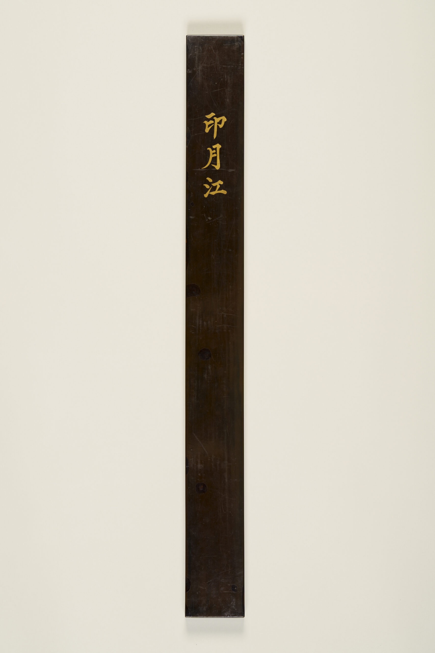 It is said that this piece was presented to Matsudaira Yorishige, the first head of the Takamatsu Matsudaira family, by Tokugawa Ietsuna, the fourth shogun, when Yorishige was permitted to retire due to illness in 1673 (Enpō 1). According to inscriptions on its storage box dated 1844 (Tenpō 15), it was later shown at a tea gathering hosted for senior shogunate officials in 1675 (Enpō 3). The box inscription was written by Kikuchi Gozan, a Confucian scholar of the Takamatsu domain, and rendered in silver lacquer by Tamakaji Zōkoku, who is regarded as the founder of Kagawa lacquer art.