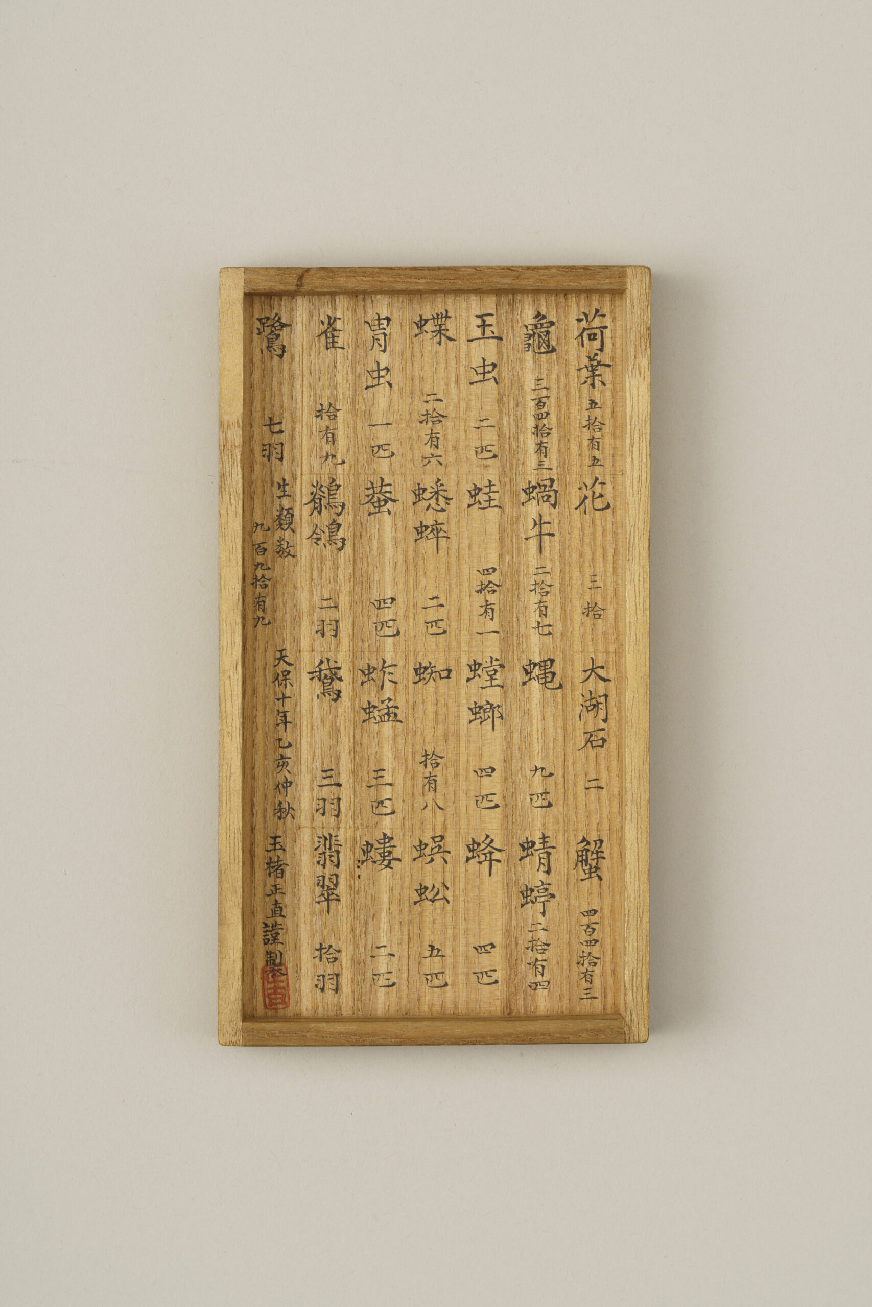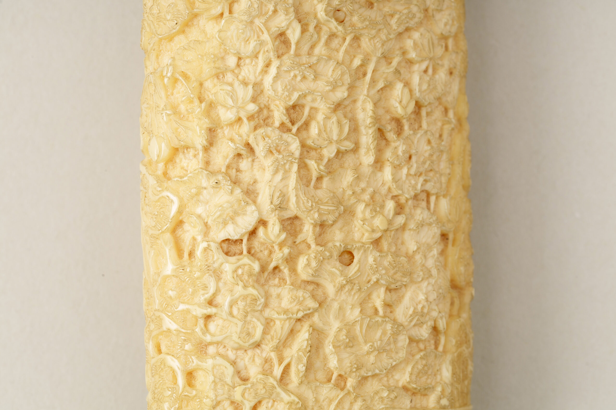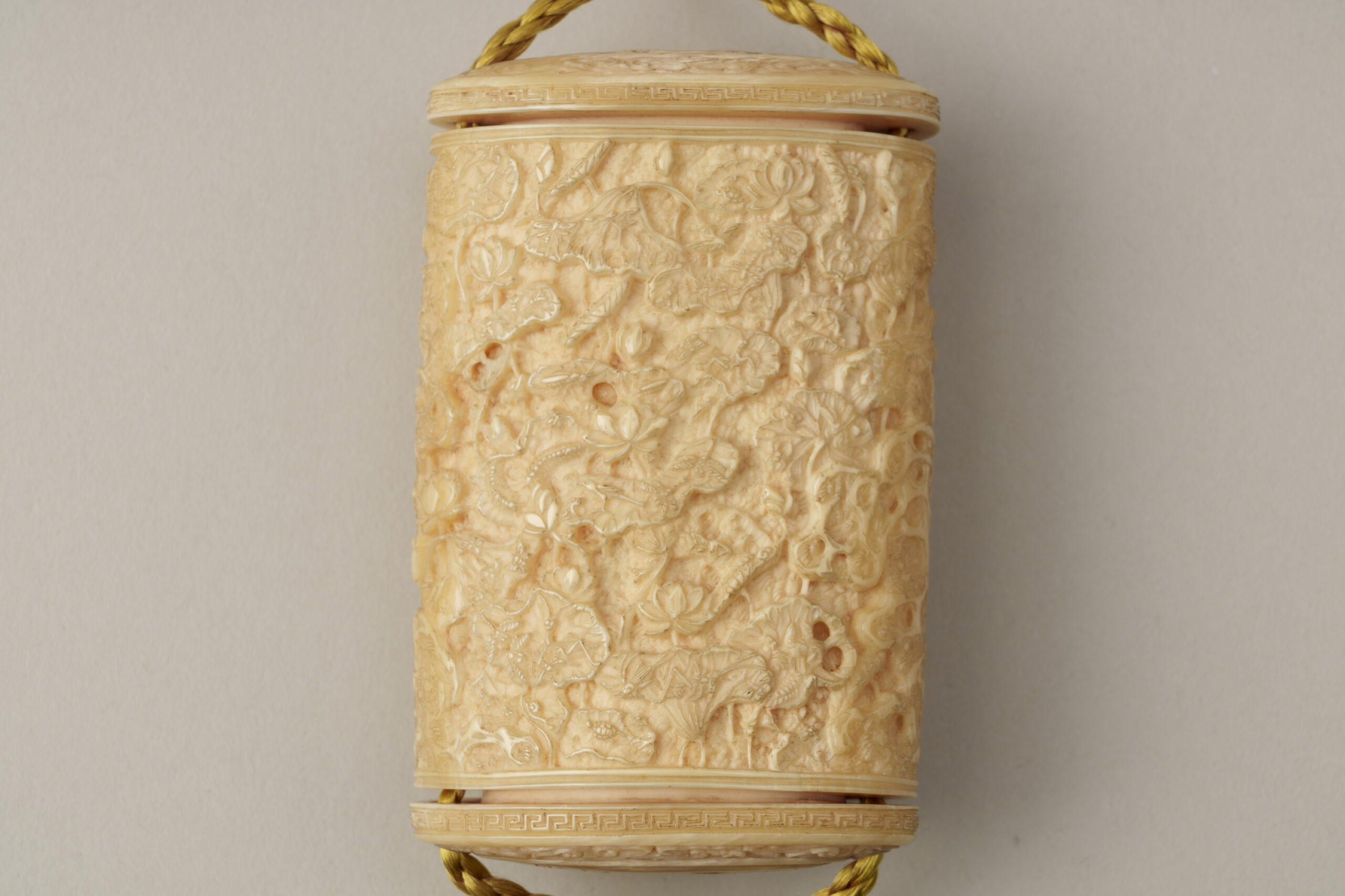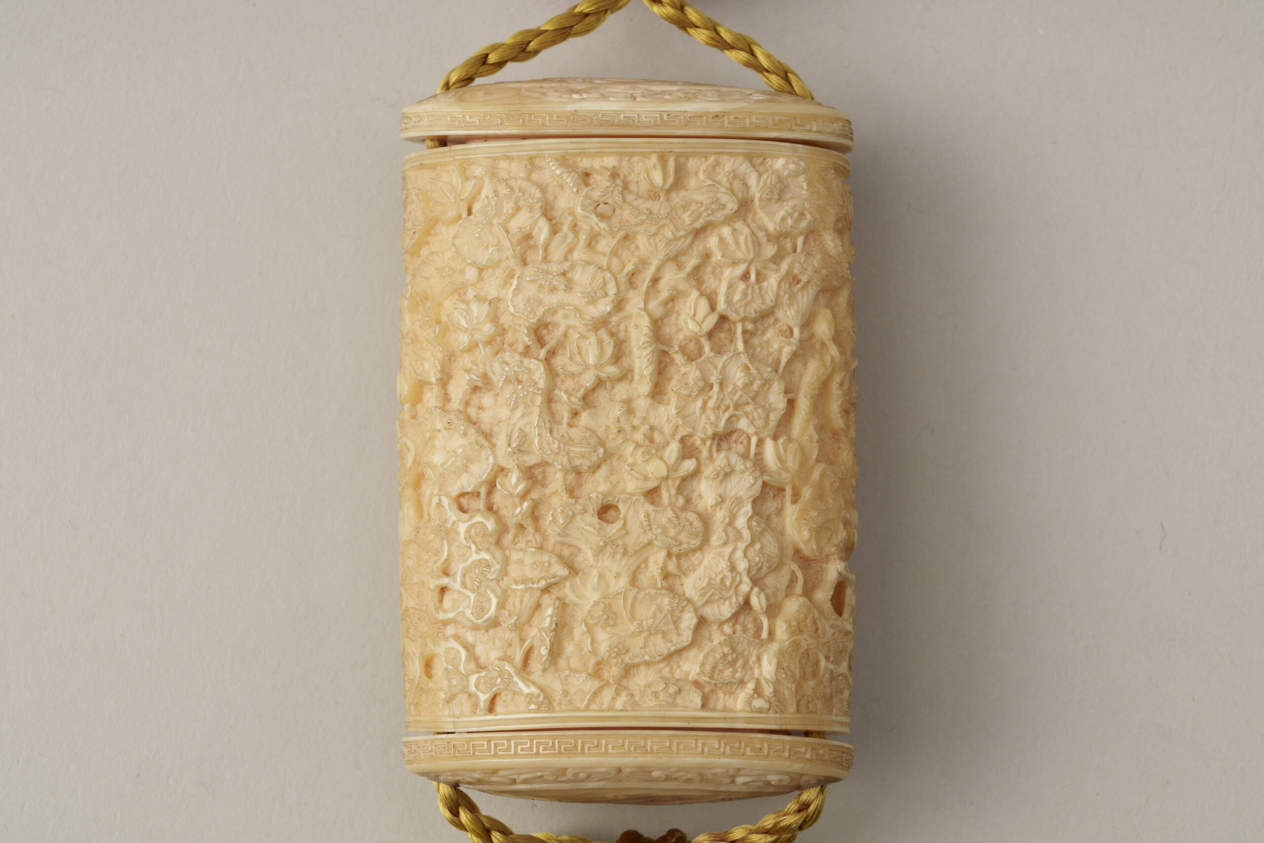 This inrō was created using a narwhal tusk prepared by Lord Yorihiro, to which Zōkoku contributed the “labor of carving.” With astonishing precision, he carved lotus leaves and blossoms, Taihu rocks, and a remarkable variety of flora and fauna, including crabs, turtles, dragonflies, and sparrows. According to Zōkoku’s ink inscription on the inside of the storage-box lid, there is a total of 1,086 carved motifs, 999 of which represent living creatures.