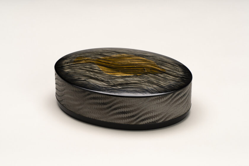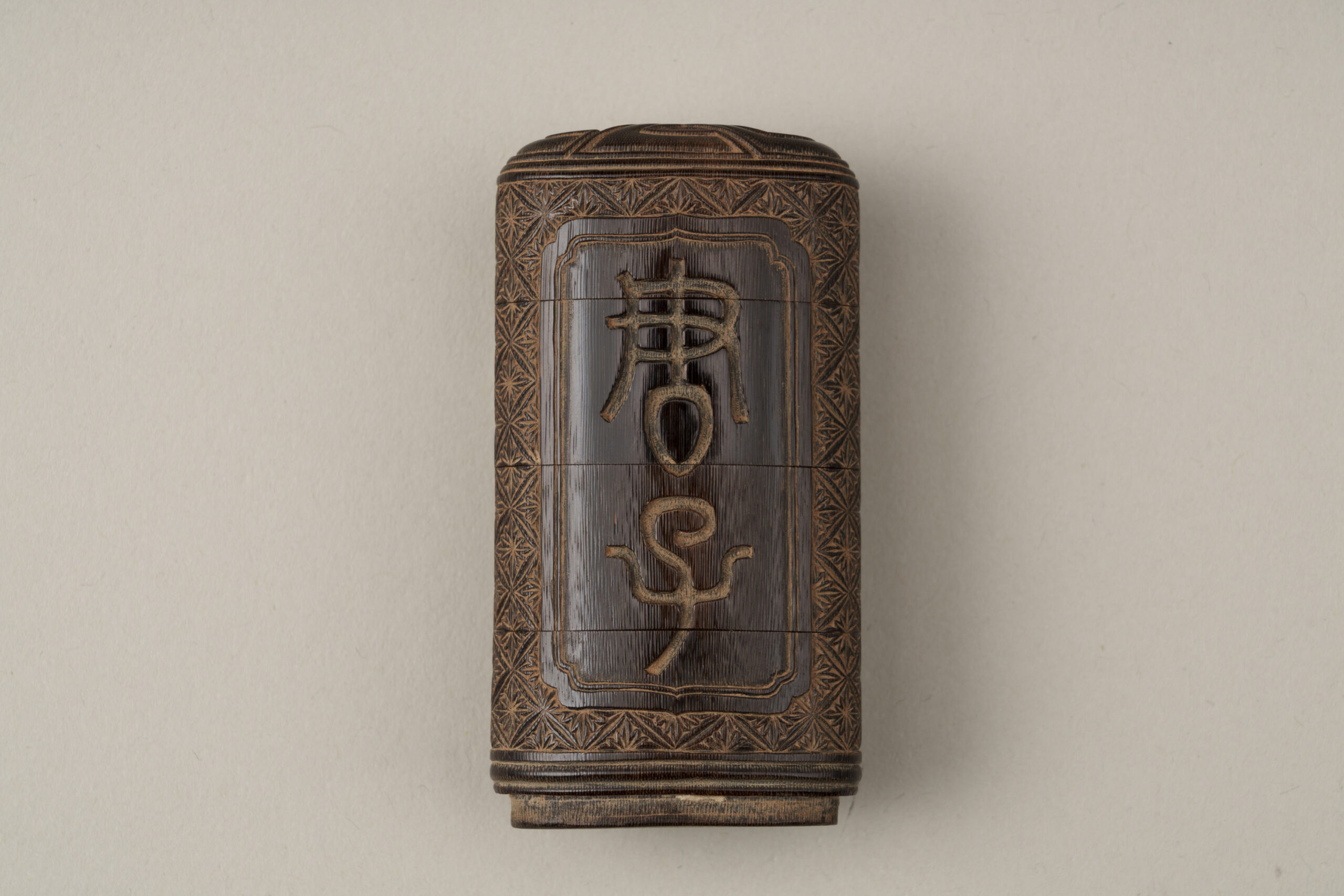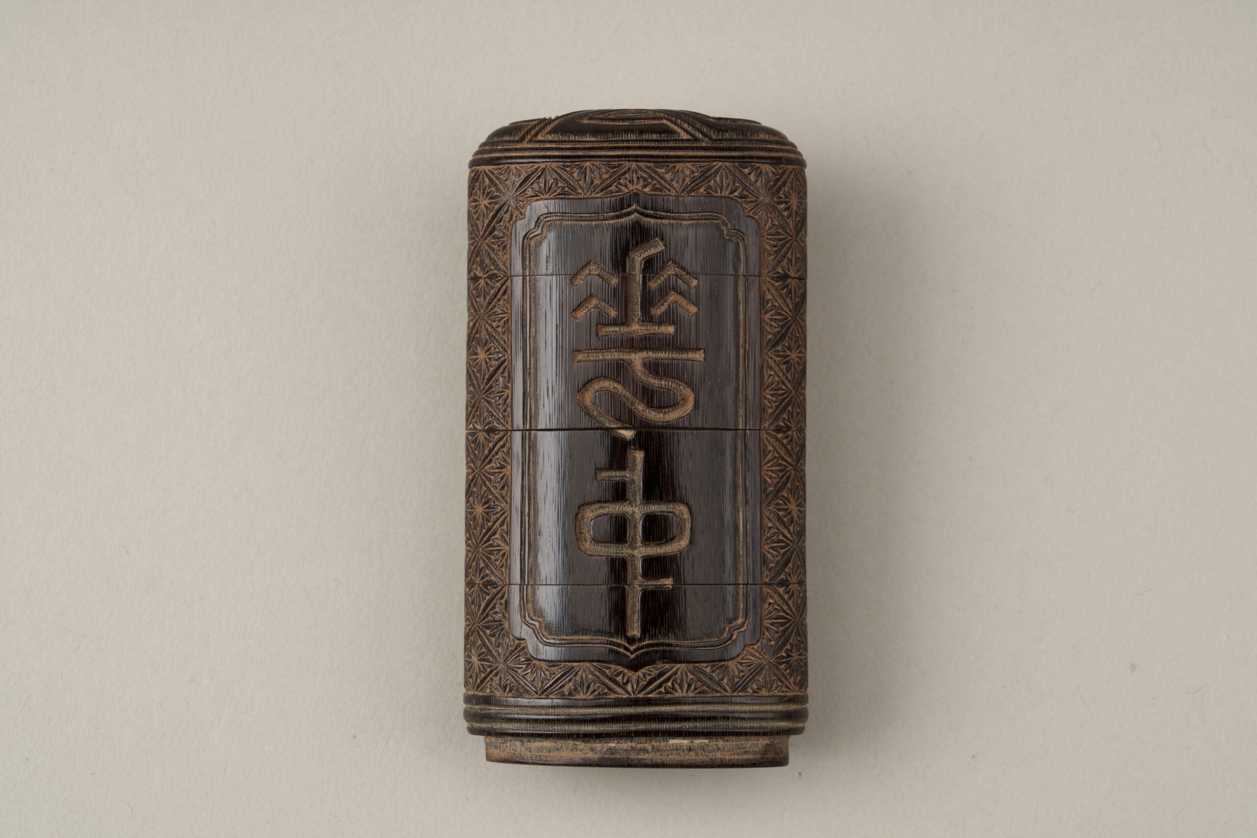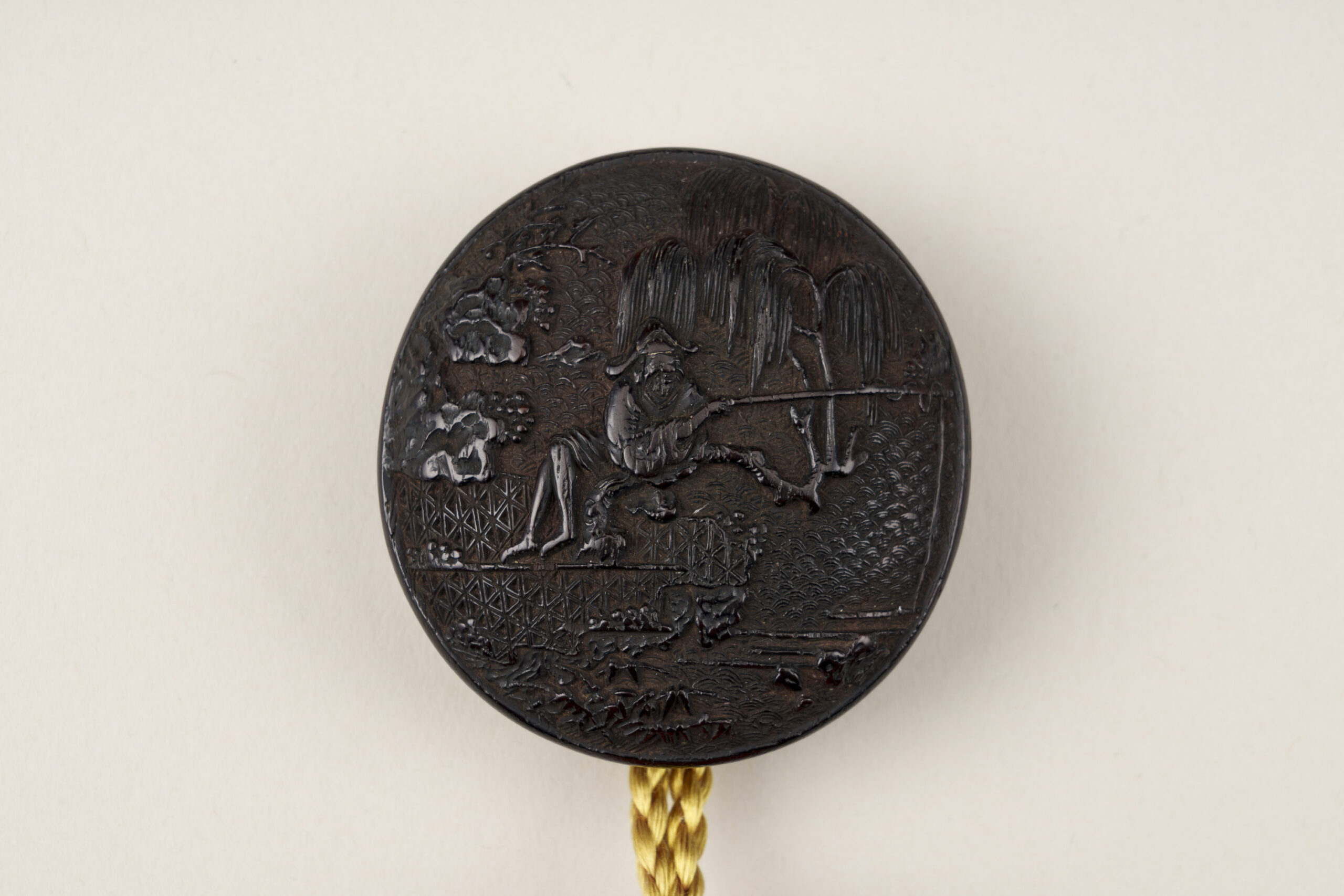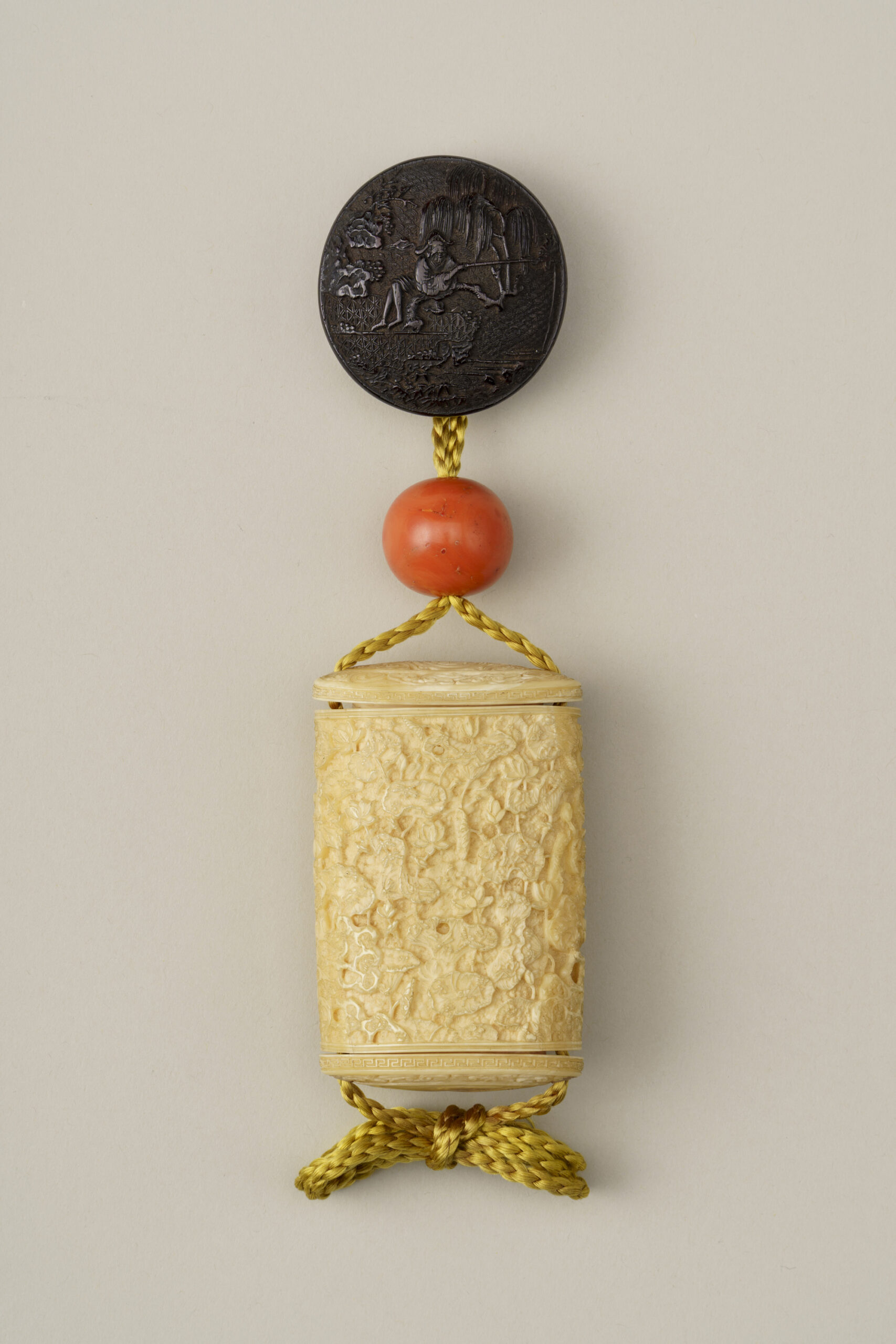 Tamakaji Zōkoku was a lacquer artist who served three successive lords of the Takamatsu Matsudaira family, Yorihiro (the ninth lord), Yoritane (the tenth lord), and Yoritoshi (the eleventh lord). Studying lacquerware introduced from China and Southeast Asia and drawing on his own carving virtuosity, he laid the foundation for three Kagawa lacquer techniques, chōshitsu (carved lacquer), kinma (engraved-and-filled lacquer) and zonsei (incised polychrome lacquer). This inrō was created using a narwhal tusk prepared by Lord Yorihiro, to which Zōkoku contributed the “labor of carving.” With astonishing precision, he carved lotus leaves and blossoms, Taihu rocks, and a remarkable variety of flora and fauna, including crabs, turtles, dragonflies, and sparrows. According to Zōkoku’s ink inscription on the inside of the storage-box lid, there is a total of 1,086 carved motifs, 999 of which represent living creatures. The inscription engraved on the inner container made of black rhinoceros horn reads “Kachū Kunshi,” a phrase that alludes to the purity of the lotus. Taikōbō, an ancient Chinese sage famed for his love of fishing was also carved by Zōkoku on the accompanying netsuke. This work stands as one of his finest masterpieces, demonstrating his extraordinary carving prowess.