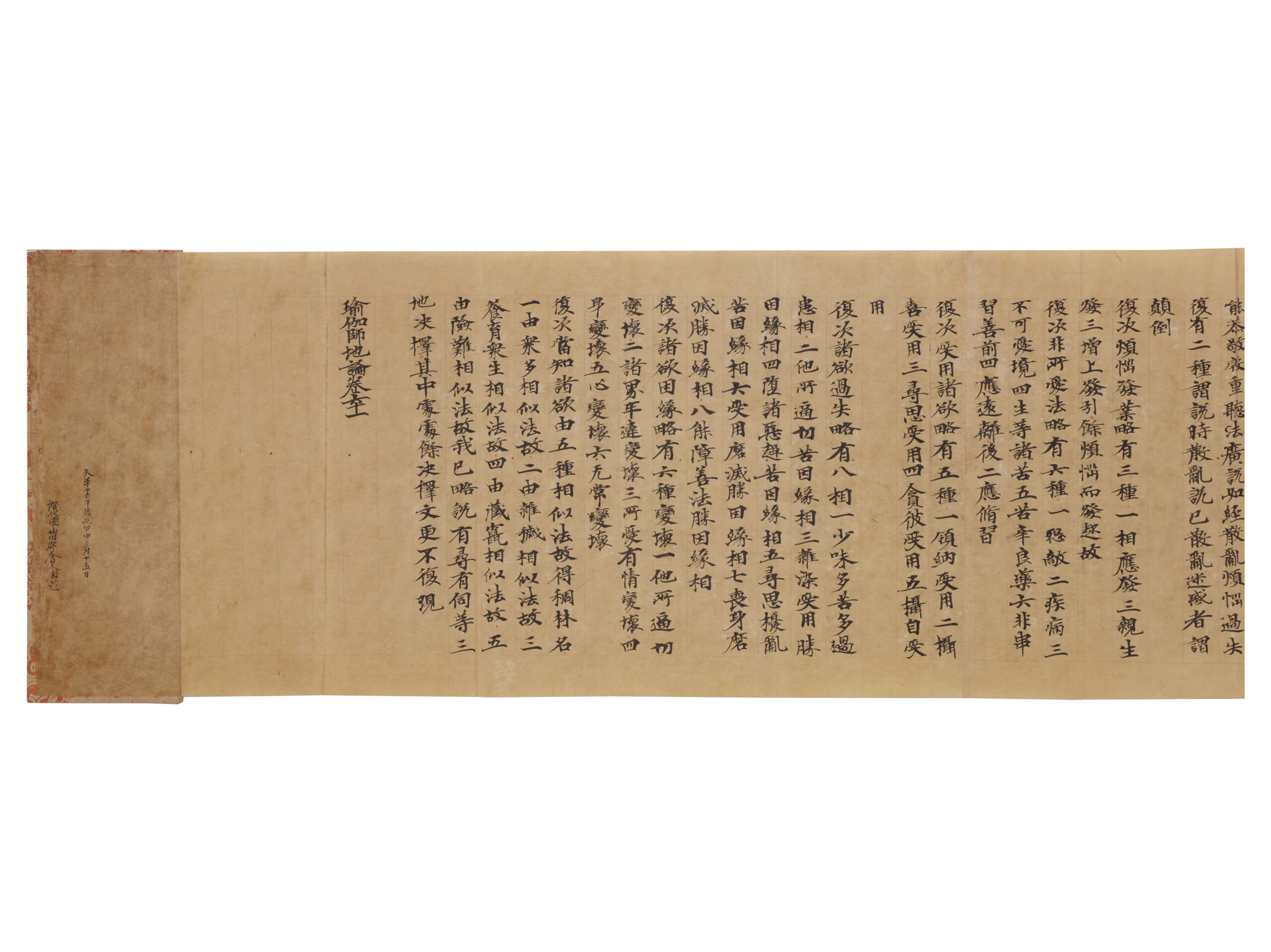 The Yuga-shiji-ron (Sanskrit: Yogacārābhūmi), comprising one hundred fascicles, is a major scripture of the Hossō school that outlines the methods and principles of Buddhist practices. According to the colophon, this manuscript was copied by multiple individuals to fulfill a vow made by Toneri no Kunitari, who is believed to have been a prominent local clan leader in the Yamada District of Sanuki Province. At the time, the copying of Buddhist scriptures was a large-scale undertaking that required numerous people to transcribe, proofread, and bind the work, as well as a source text (honkyō) and a substantial supply of paper.