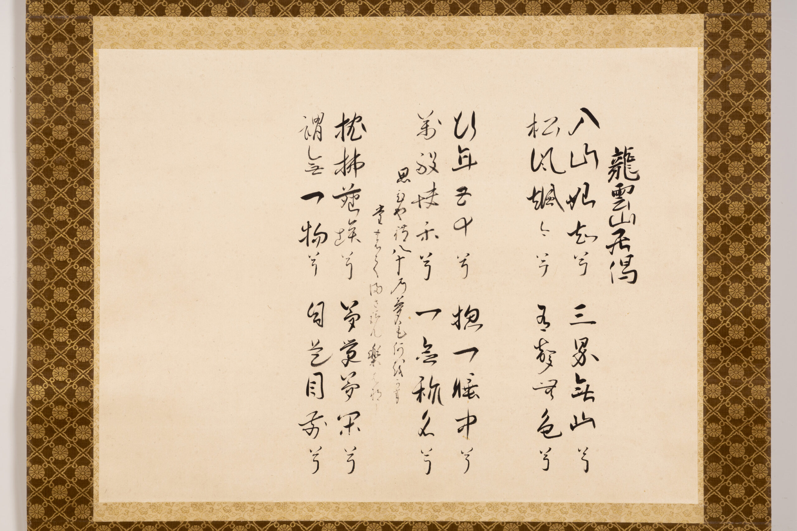 This work preserves a poetic exchange between Matsudaira Yorishige, the first head of the Takamatsu Matsudaira family, who assumed the literary name Ryū’unken Gen’ei after his retirement, and Emperor Go-Mizunoo, who had abdicated. Upon receiving Yorishige’s Chinese-style poem expressing his thoughts upon retirement, the elder emperor responded by writing his own waka poem, conveying his personal sentiments in the interlinear spaces. Together, they convey the inner feelings of Yorishige at age fifty-four and the retired emperor at age eighty. Emperor Go-Mizunoo was particularly accomplished in waka and classical studies, and Yorishige’s relationship with him was close. Yorishige frequently received guidance from Emperor Go-Mizunoo on poetry. This work was handed down in the Takamatsu Matsudaira family together with the Emperor Go-Mizunoo Shinkan Nyōbō Hōsho, a court-lady’s document that accompanied the piece when it was returned to Yorishige.