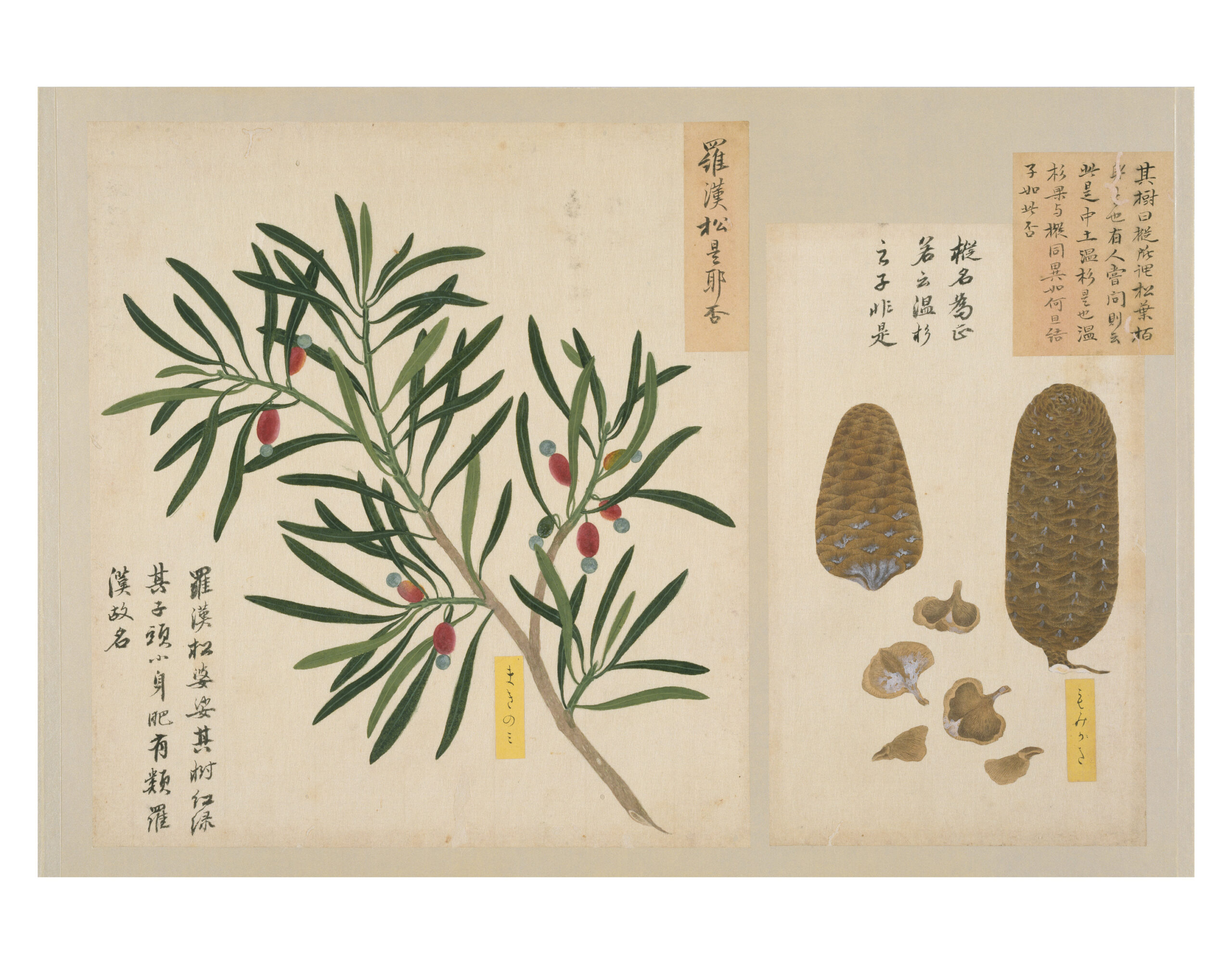 Shasei Gajō is one of the four illustrated natural history albums that make up a thirteen-volume set preserved by the Takamatsu Matsudaira family. The three-volume botanical compendium consists of Saiso (Vegetables), Zassō (Wild Grasses), and Zatsuboku (Miscellaneous Trees). Each illustration captures leaves, roots, flowers, and fruit with meticulous precision. Mica is applied to create a subtle luster, while raised pigments add texture and three-dimensionality. Executed on kōzo paper and mounted onto accordion-fold album pages, some illustrations even have leaf tips and other extremities cut along their contours to enhance the naturalistic impression of the work. Many of the illustrations have attached labels that identify the plants. Shasei Gajō was taken to Nagasaki together with the second volume of Shurinzu, where Chinese scholars then visiting Japan were consulted about the Chinese names of the depicted species and other details. The ink inscriptions on the red paper slips are thought to record explanations and questions posed by members of the Takamatsu Matsudaira family, whereas the inscriptions on the mounts and inner covers represent the responses provided by the Chinese scholars. The work is thought to have been produced in the mid-eighteenth century under the direction of Matsudaira Yoritaka (1711–1771), the fifth lord of the Takamatsu domain who was known for his keen interest in natural history, and Hiraga Gennai, a naturalist who served the domain at the time, is also believed to have been involved. The artist has not been definitively identified, though candidates include Kusumoto Sekkei of the Nanpin School and his disciple Miki Bunryū from Sanuki Province.